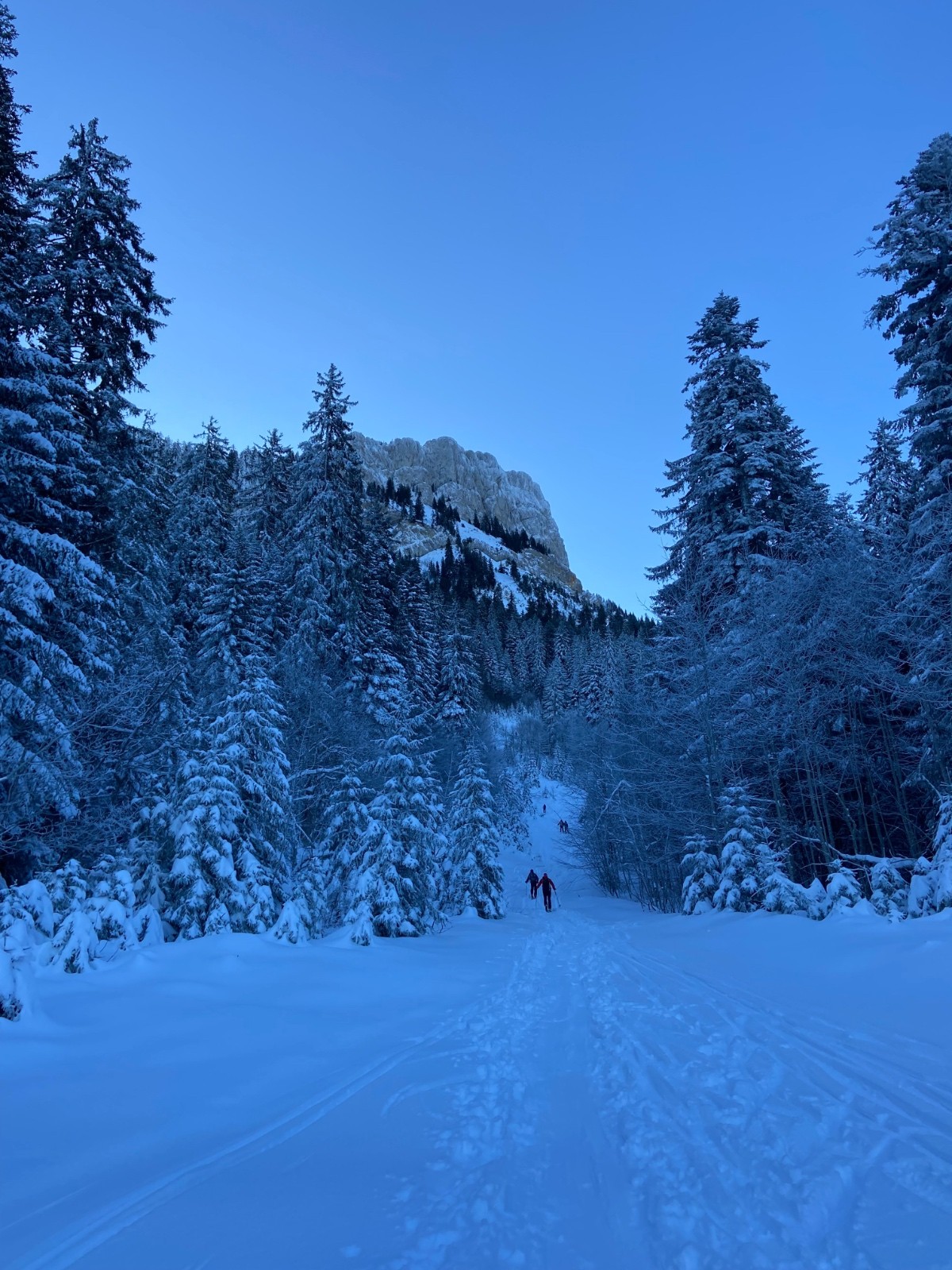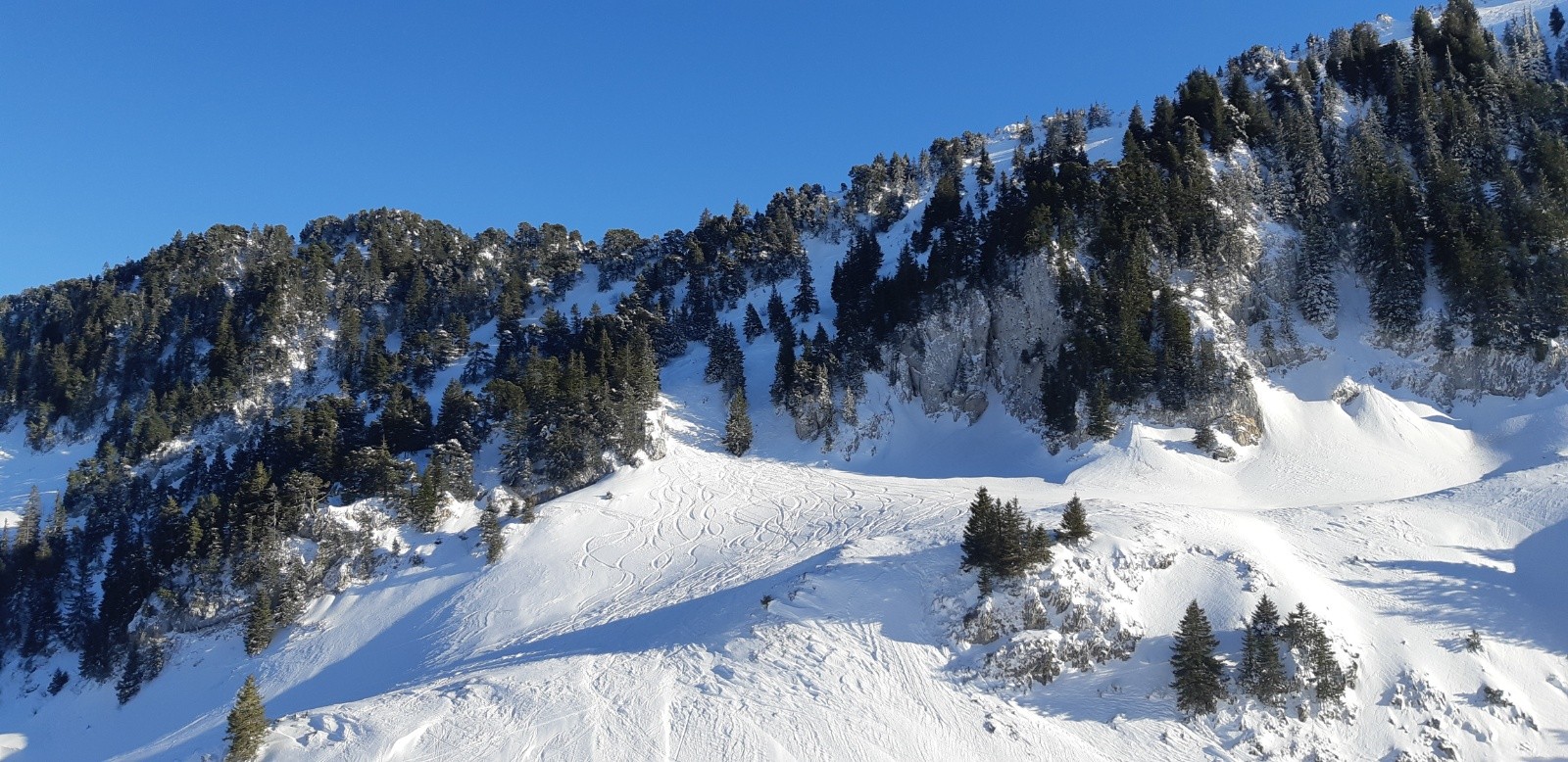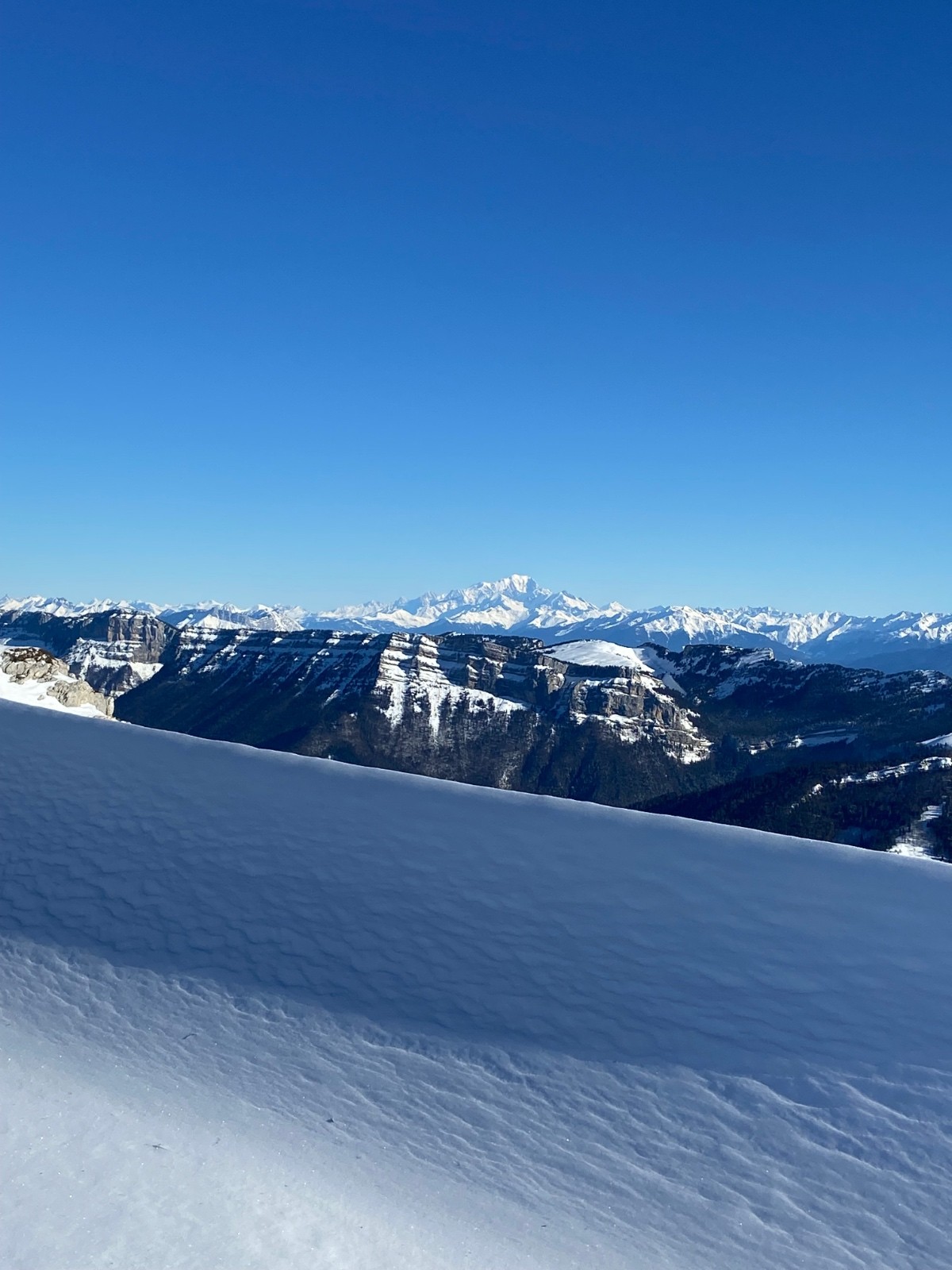 On remonte le sentier des moutons qui nous emmène tranquillement jusqu’au sommet du Grand som pour profiter de la vue et du picnic, à base de restes de Noël. On enquille la bien bonne descente en ouest sur le Habert de Bovinant avant d’enchaîner ensuite avec le Mauvernay ; en essayant de rester le long de la forêt on trouve un peu de poudre compactée, mais ce n’est pas la grosse poudreuse qu’on aurait pu attendre. Dernière remontée tranquille au Petit Som et dernière descente directement dans la combe de Lechaux. Très bonne là encore en poudre compactée assez joueuse puis vient la forêt qui a conservé la meilleure poudre. Un régal !