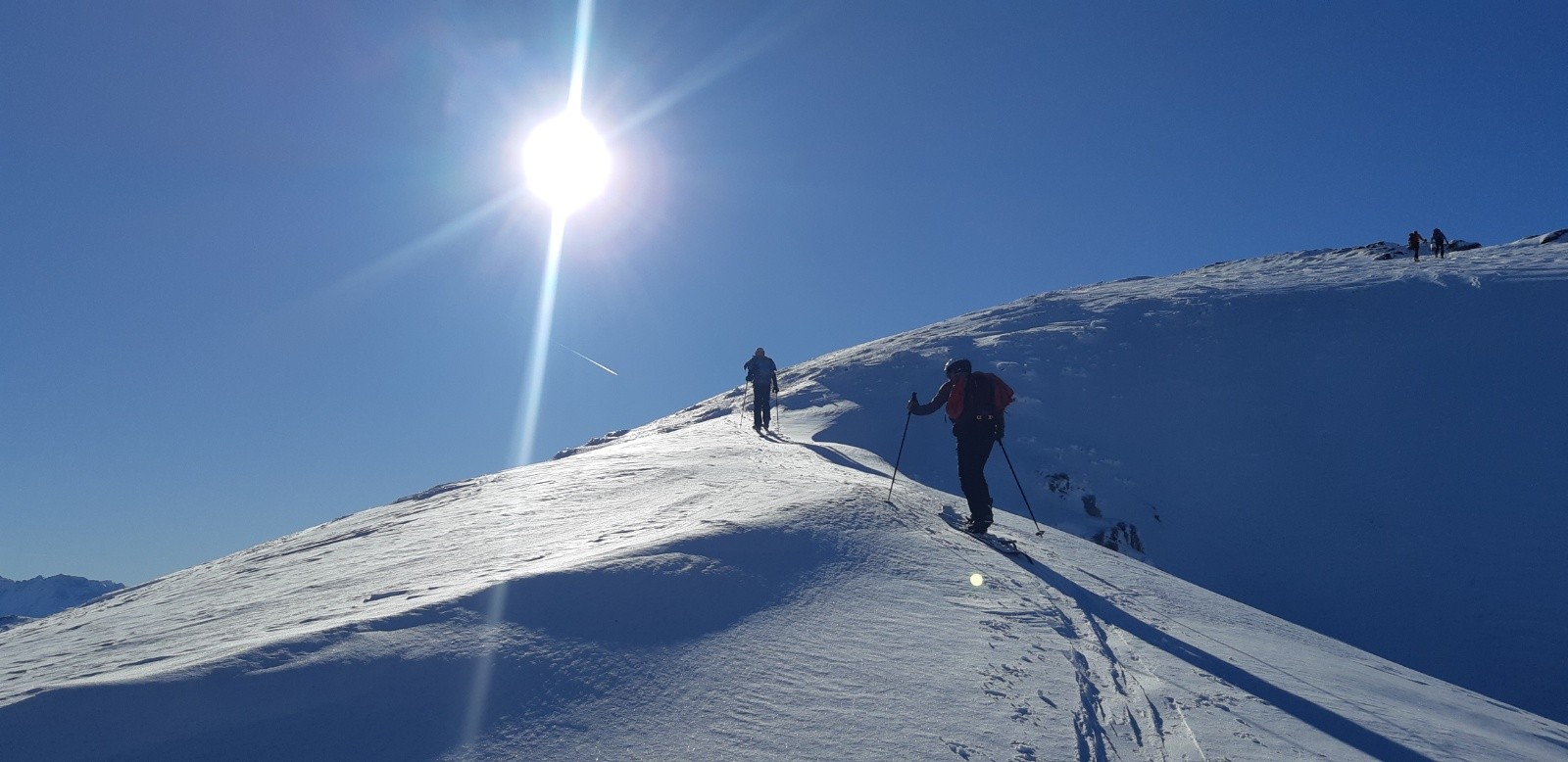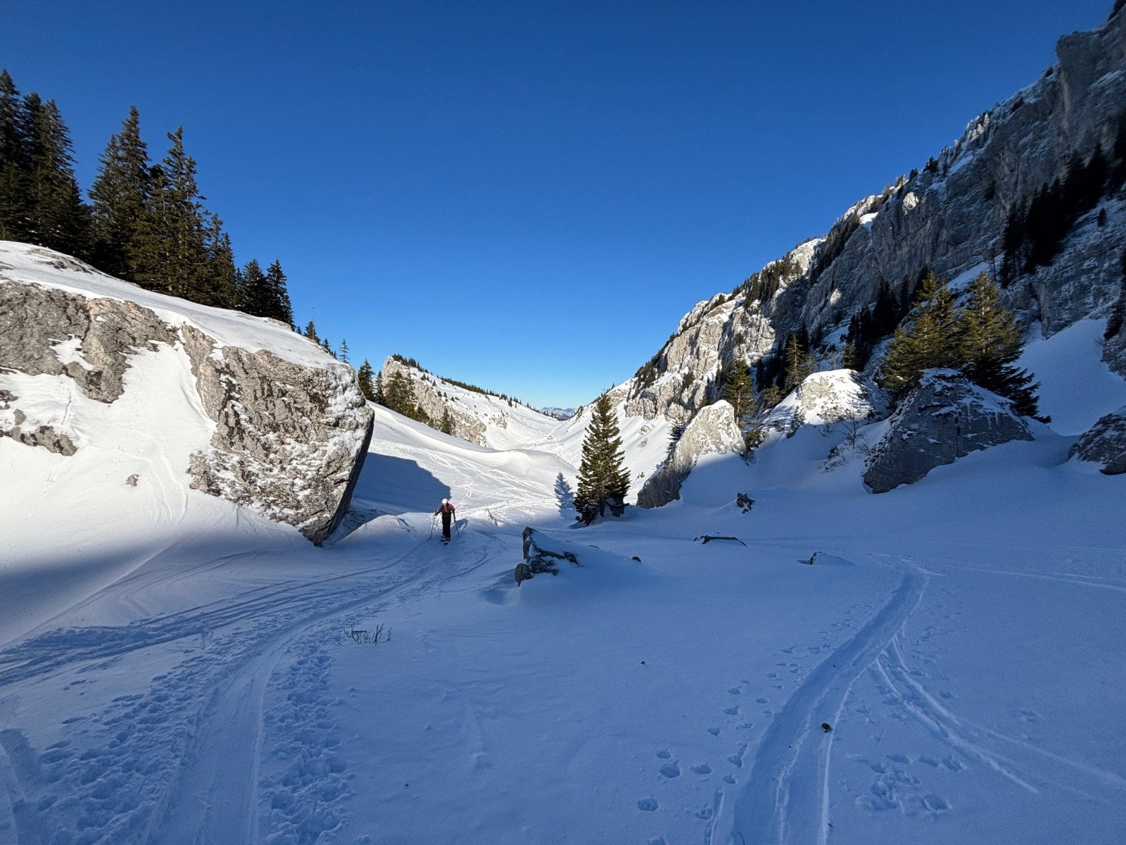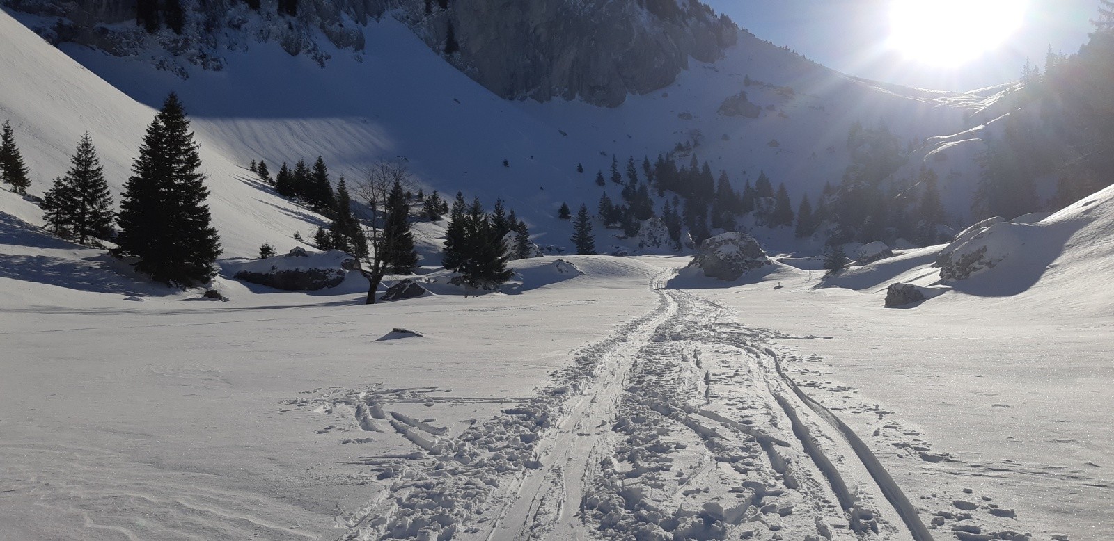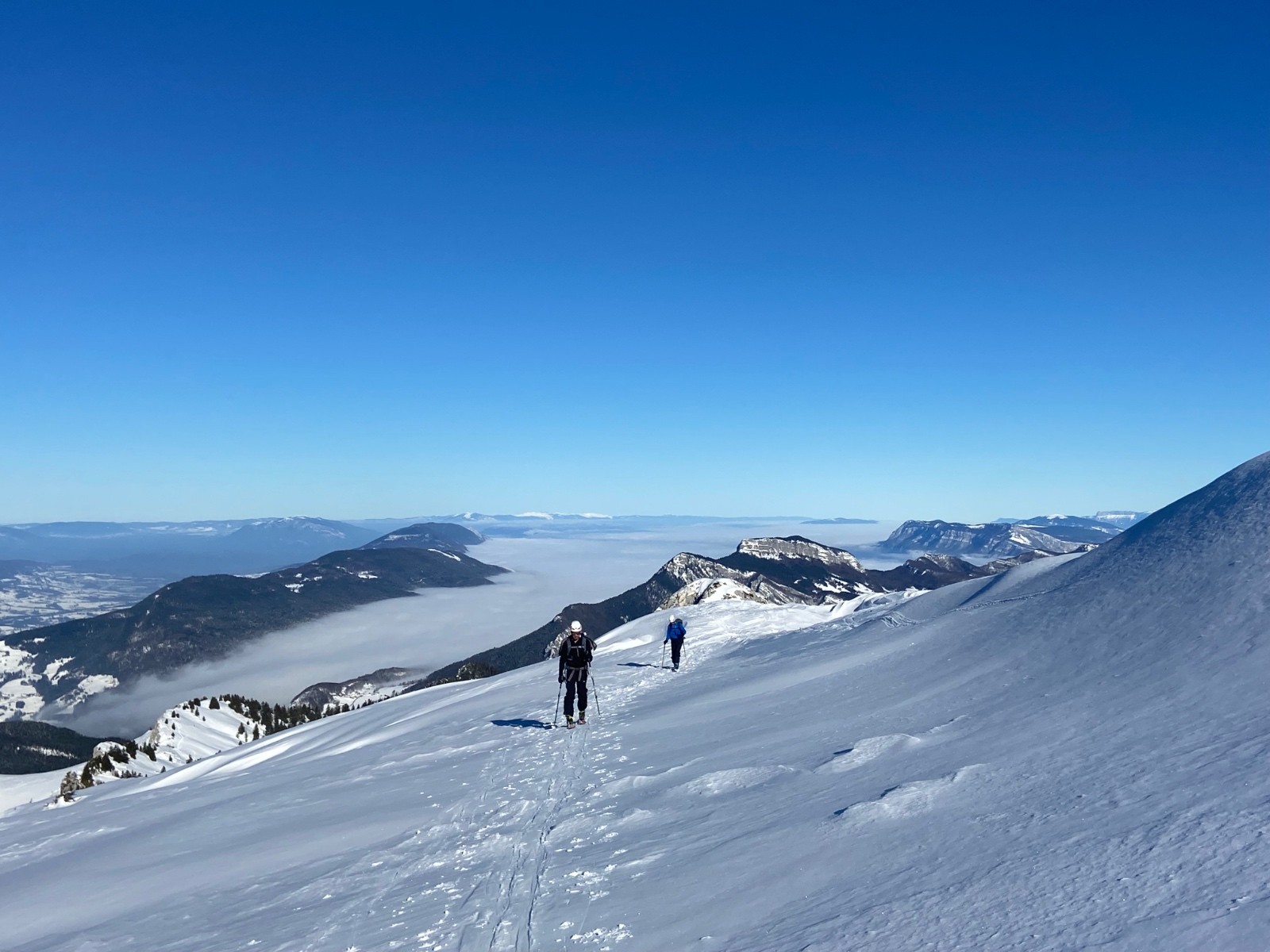 On remonte le sentier des moutons qui nous emmène tranquillement jusqu’au sommet du Grand som pour profiter de la vue et du picnic, à base de restes de Noël. On enquille la bien bonne descente en ouest sur le Habert de Bovinant avant d’enchaîner ensuite avec le Mauvernay ; en essayant de rester le long de la forêt on trouve un peu de poudre compactée, mais ce n’est pas la grosse poudreuse qu’on aurait pu attendre. Dernière remontée tranquille au Petit Som et dernière descente directement dans la combe de Lechaux. Très bonne là encore en poudre compactée assez joueuse puis vient la forêt qui a conservé la meilleure poudre. Un régal !