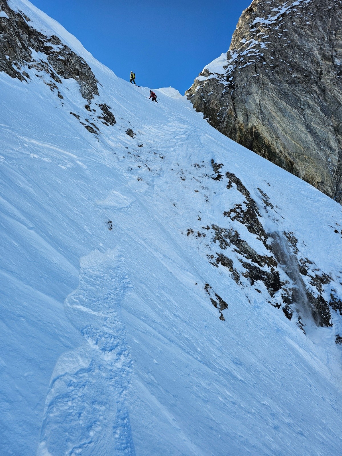 2 skieurs nous ont rejoins et ont tracés le haut pour rejoindre l'entrée du clocher , merci à Antoine et Antoine : ils ont checkés l'entrée avec une corde.