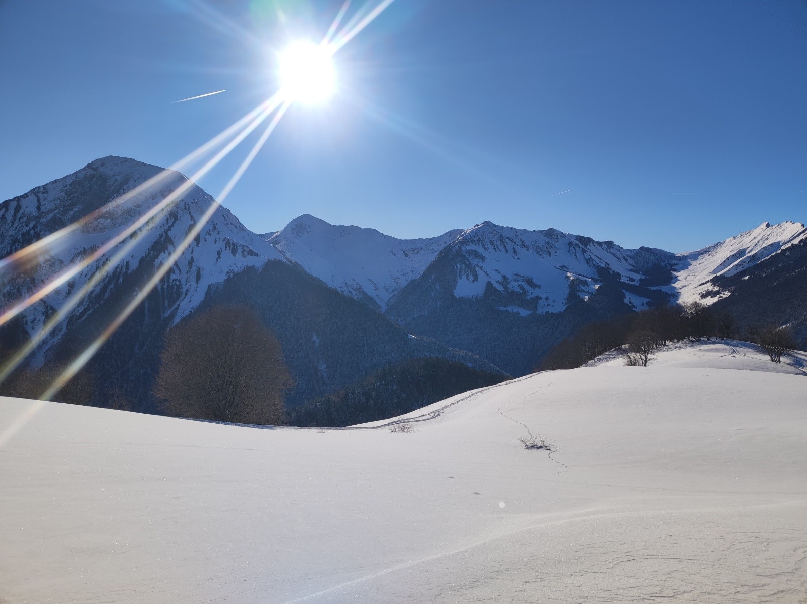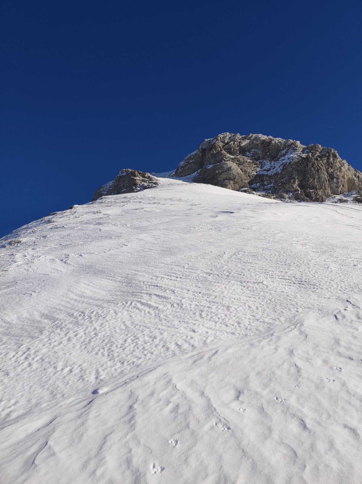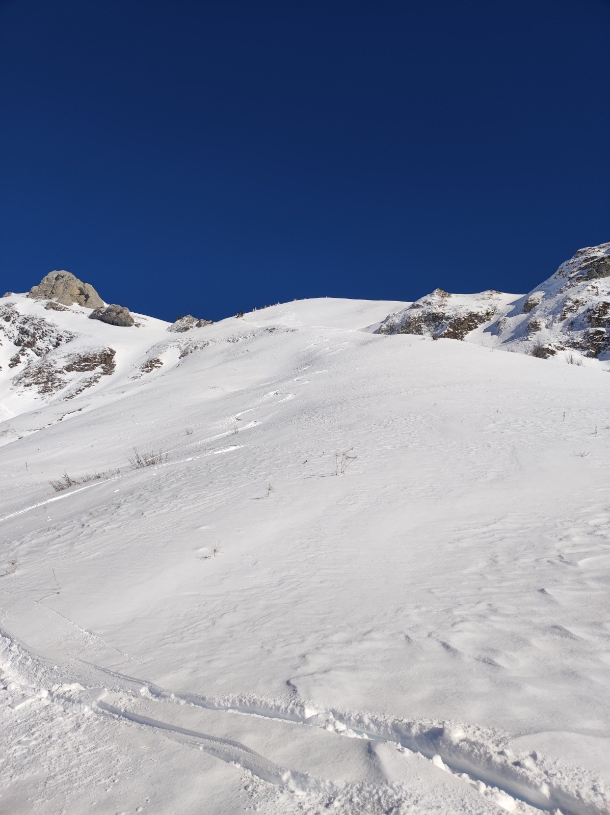 Puis NE vers le plan de la limace jusqu'ici la trace est faite, pour ce qui est de la suite par contre... Je monte au passage de plan pré Mollard, le soleil commence à faire transformer en surface, ça botte un peu. Je trace jusqu'à la moitié de la monté direction Tré Mollard puis termine à pied sur la crête pelée par le vent, tout droit sans s'enfoncer = efficace !