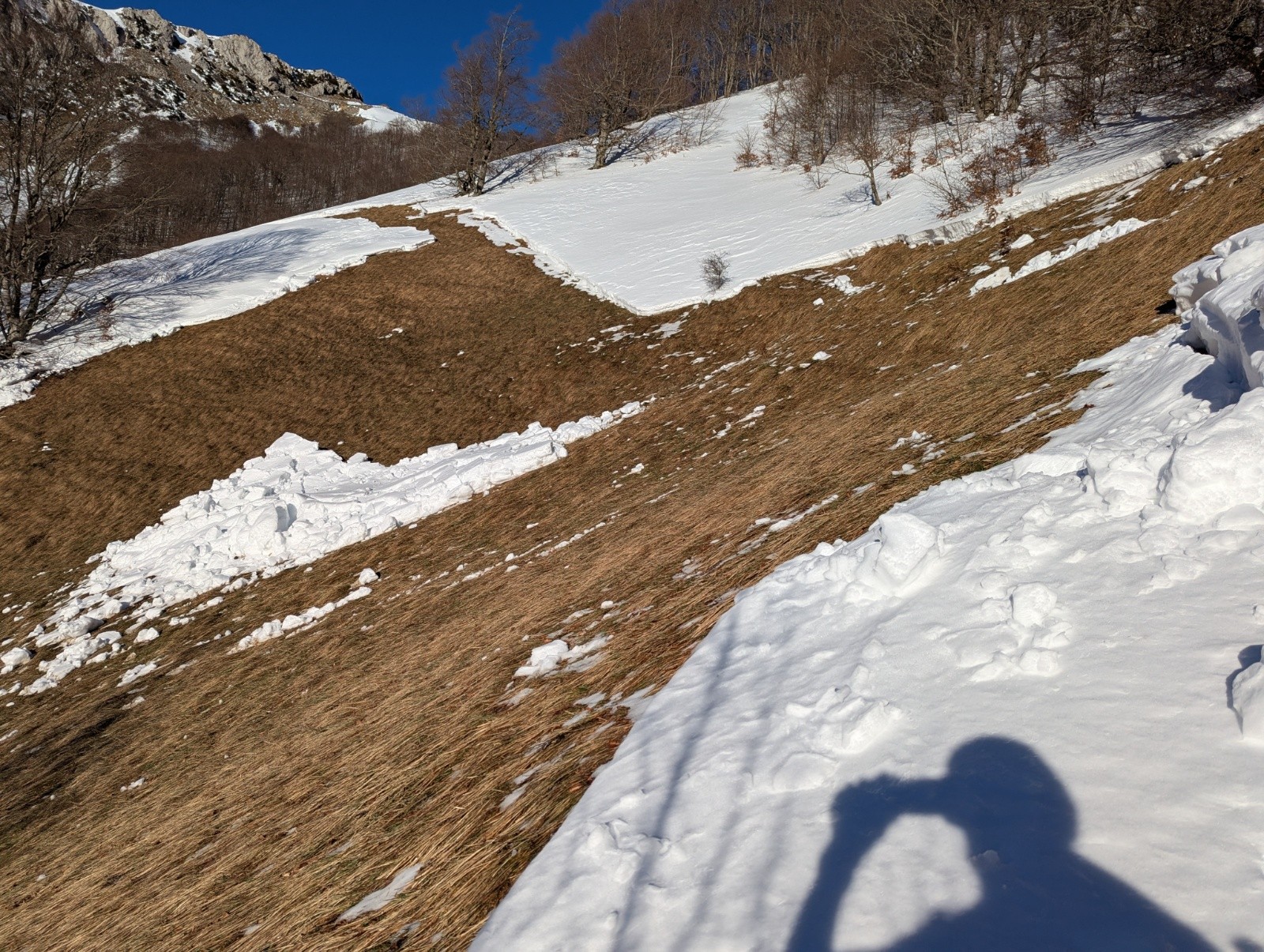 Conditions nivo et activité avalancheuse : reptation dans les pentes herbeuses de la forêt en bas de la face ouest, à l'altitude 1150m