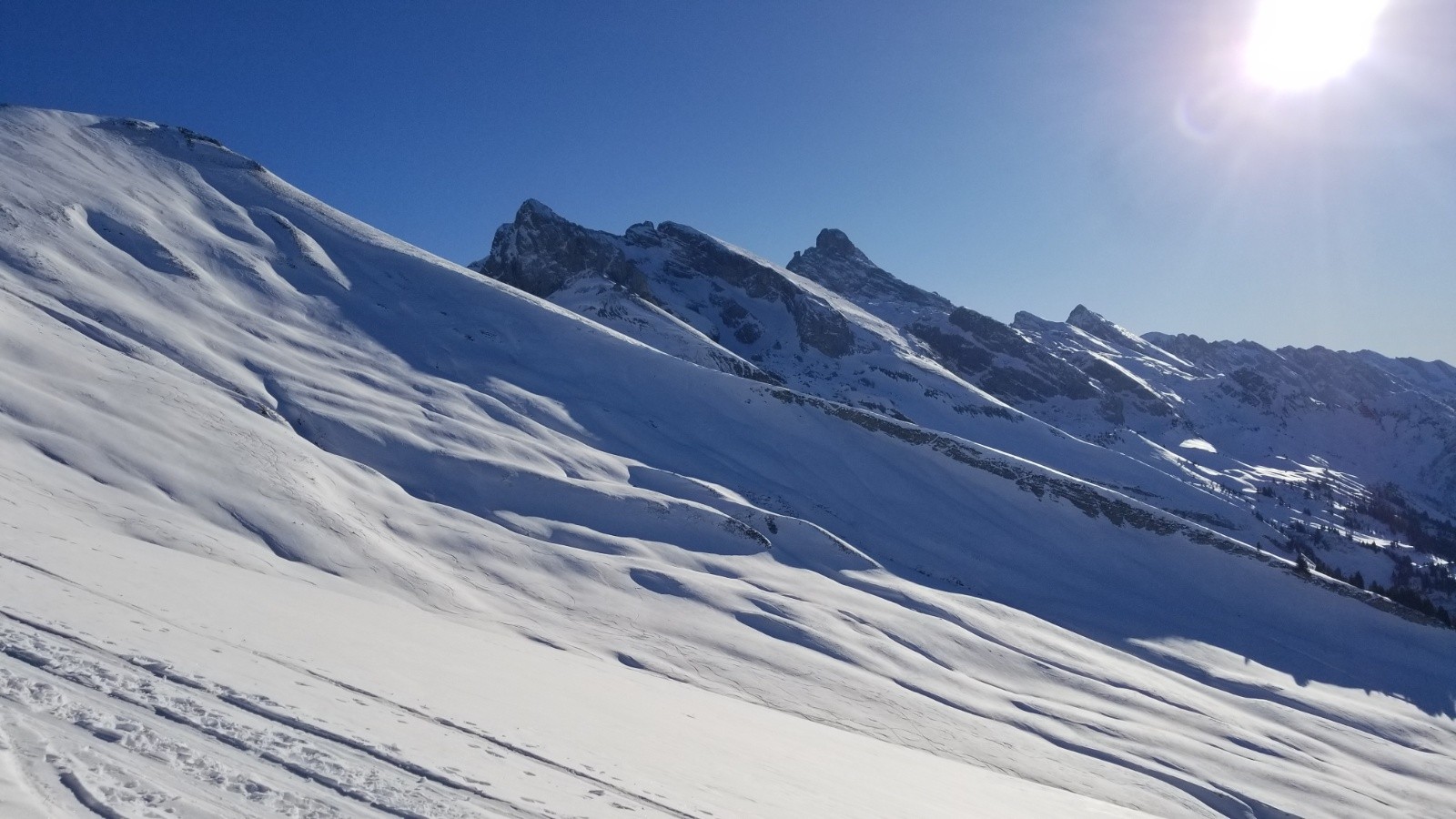 Accès vallon de Méry: moquette dans la face directe au soleil de la Pointe du Château puis dans le vallon au-dessus des chalets de Méry, il reste encore pas mal de zones en poudre dense, avec évidemment quelques zones cartonnées