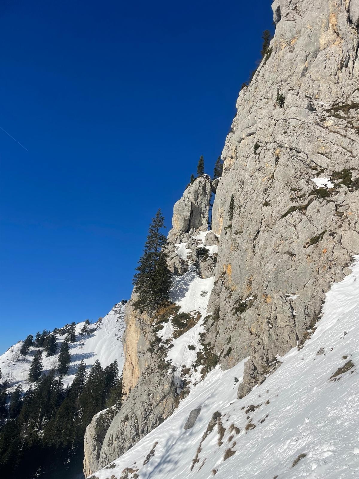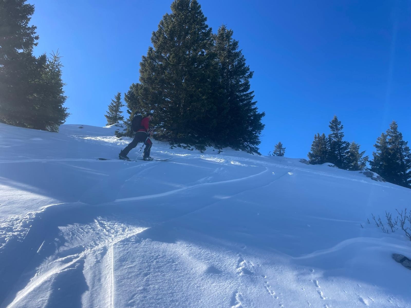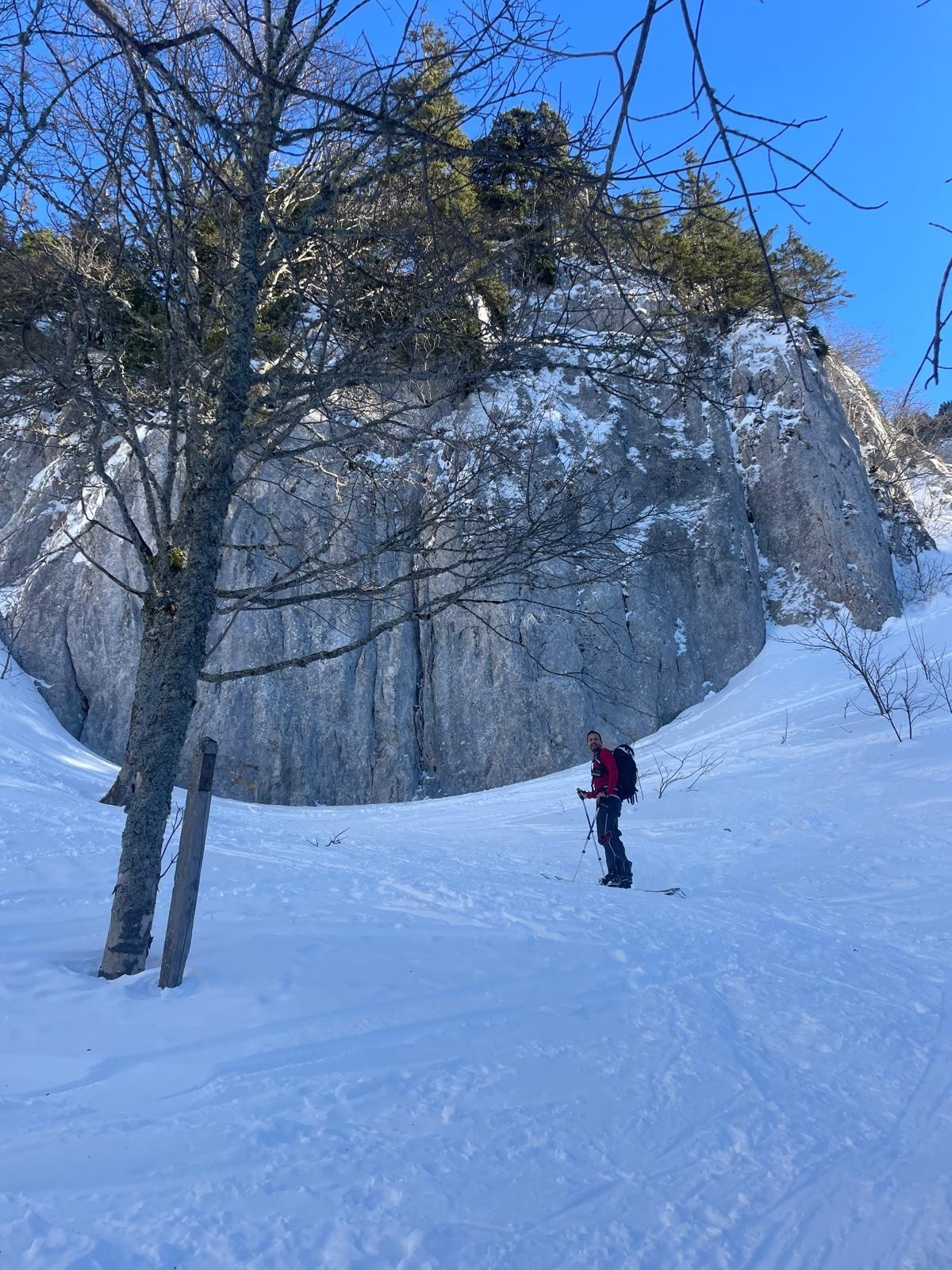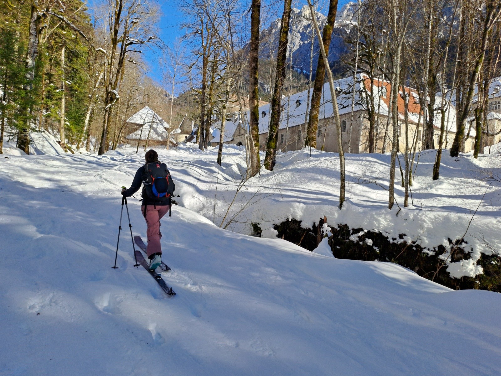 Nous partons skis au pieds depuis le pont des Allemands et nous suivons la route forestière qui monte doucement à l’arrière du monastère. Nous profitons de la quiétude du lieu tout en respectant la discrétion, car l'accès au monastère est interdit. Rapidement, nous atteignons Notre-Dame de Casalibus, une chapelle nichée dans les bois. Nous prenons un instant pour admirer cette architecture discrète et nous imprégner de l’atmosphère paisible. Nous continuons sur un sentier montant, bien tracé mais parfois étroit en fonction de l’enneigement. Après environ 1h de montée, la Chapelle Saint-Bruno nous offre une première pause idéale. Nous poursuivons en direction du Habert de Bovinant en suivant des traces souvent présentes en période de neige. Après deux conversions peu évidentes nous atteignons ce refuge typique.