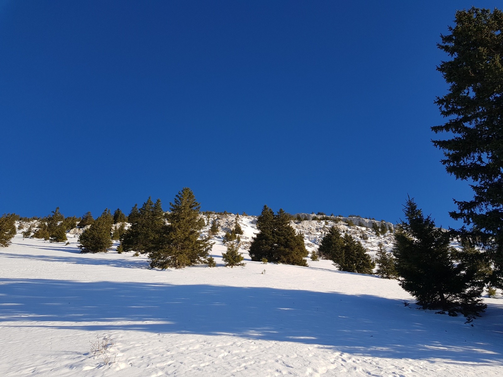 Itinéraire suivi : départ au dessus des Arriberts, montée à la prairie 1285 puis droit dans la forêt vers le sentier gobert, passage juste au bout de la barre rocheuse à 1600m puis en diagonale droite vers le pied de la barre rocheuse somitale. Déchaussage 30m sous le sommet et 10 derniers mètres à pied.