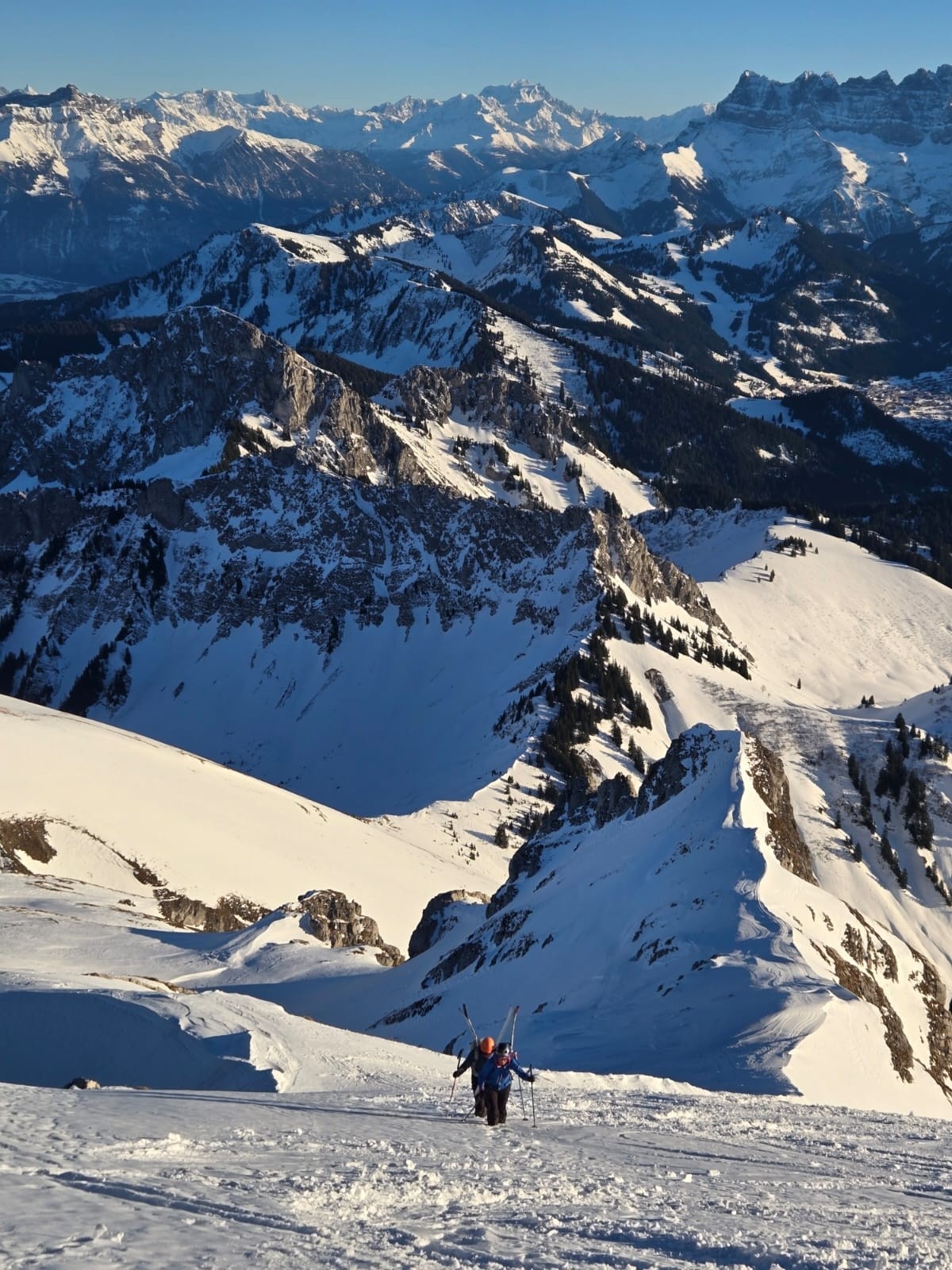 On prend en ski stop un skieur solitaire et on continue le tour vers le col d'Ugeon c'est long et il fait chaud et on est a la bourre