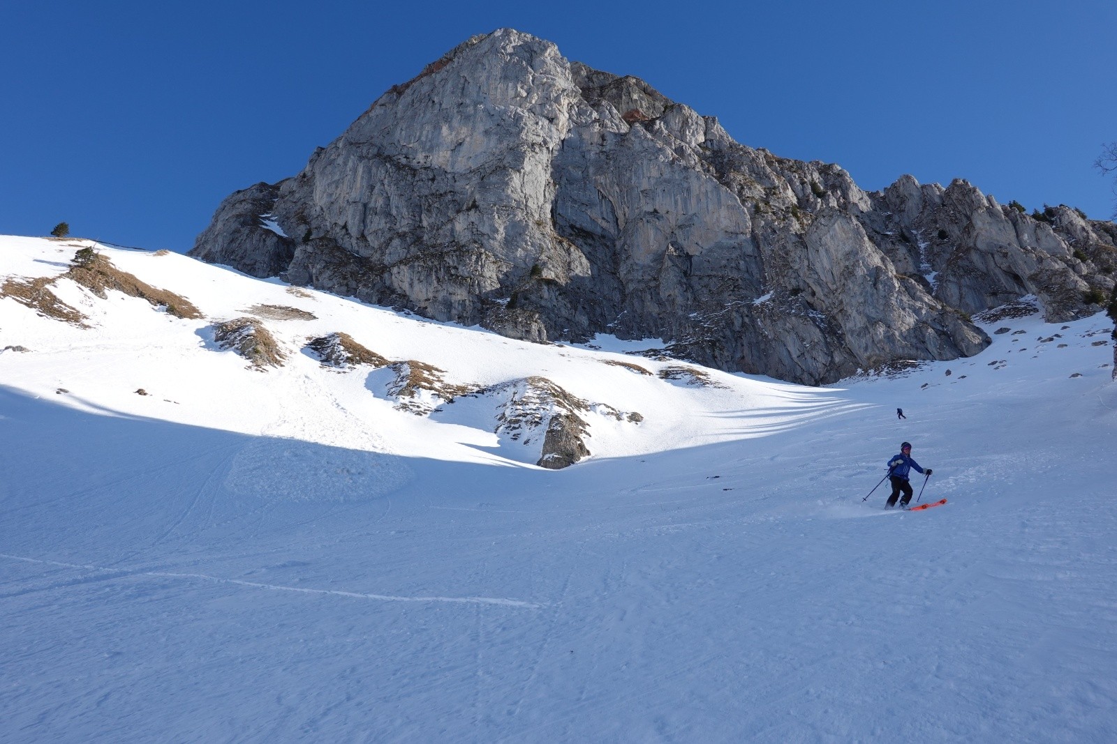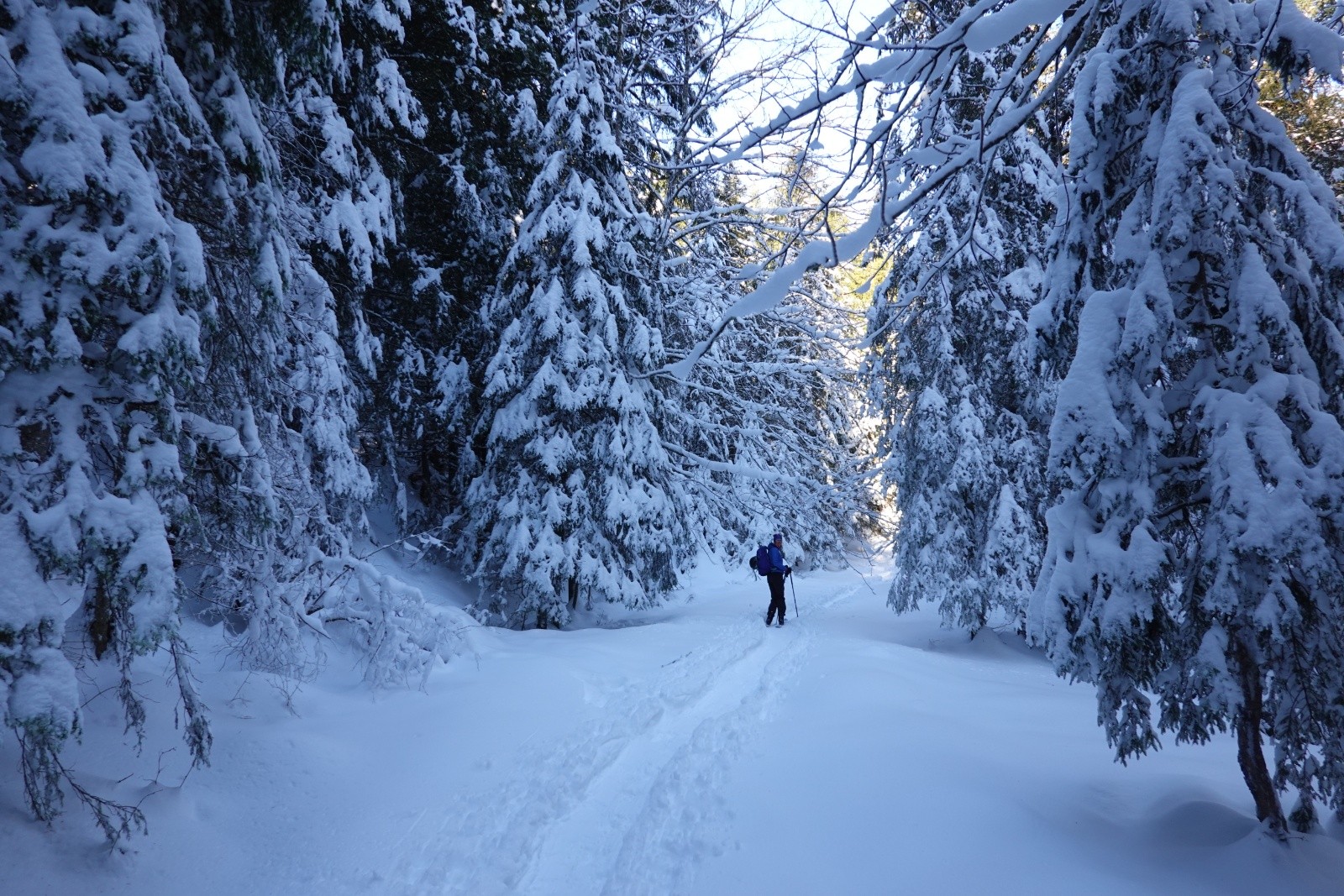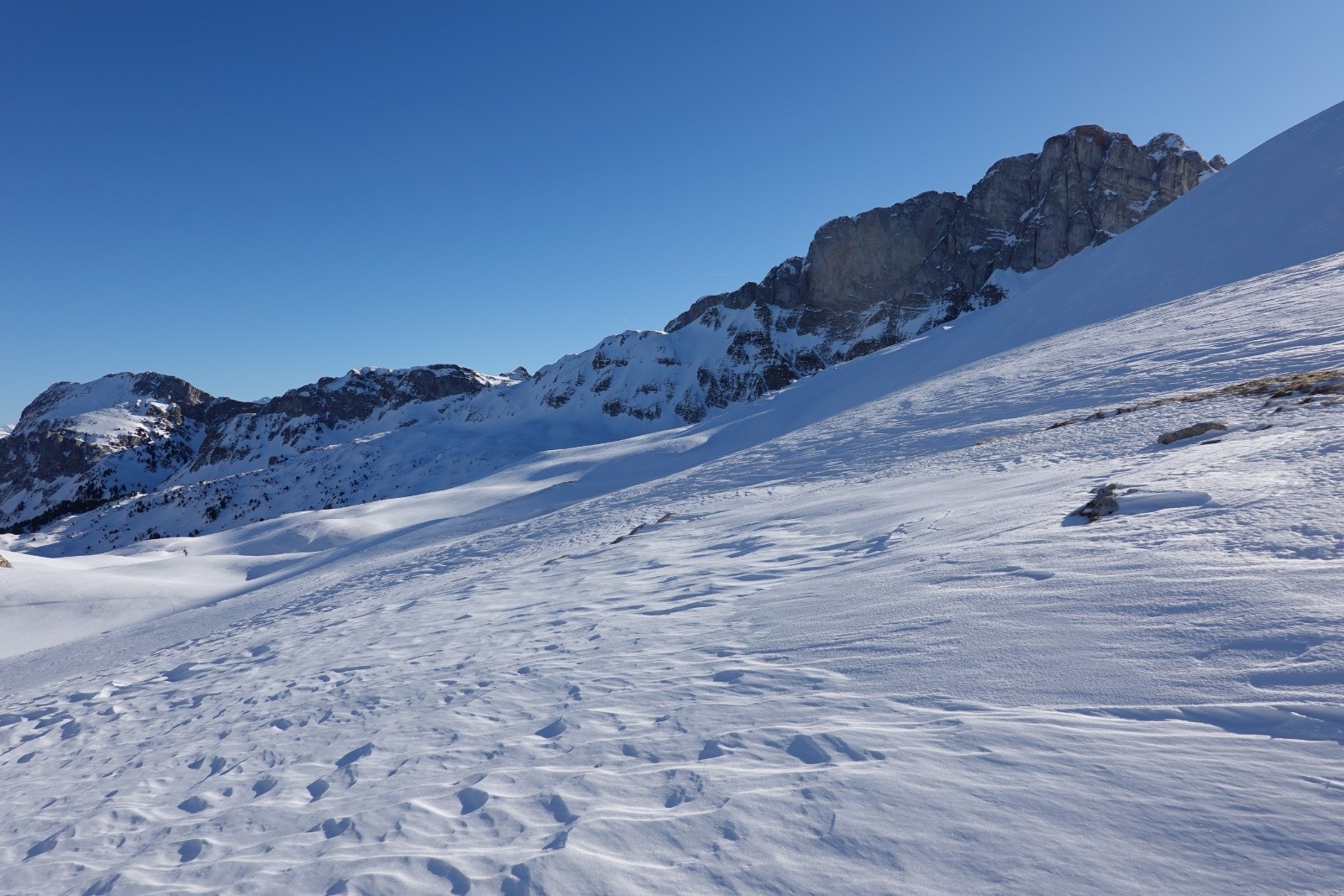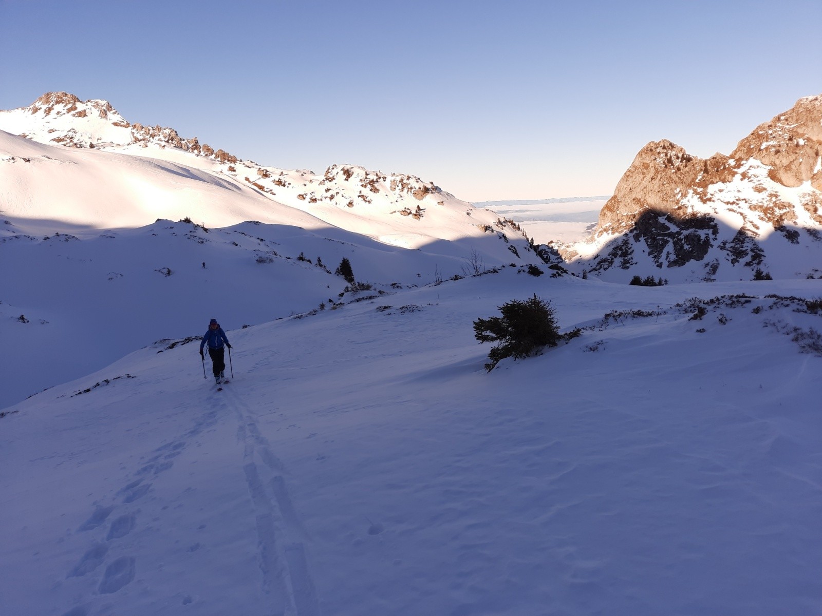 Pique nique au col et on descend dans la Chaux du milieu avec les peaux avant de remonter un vallon qui mène au pas de Chaudin.
