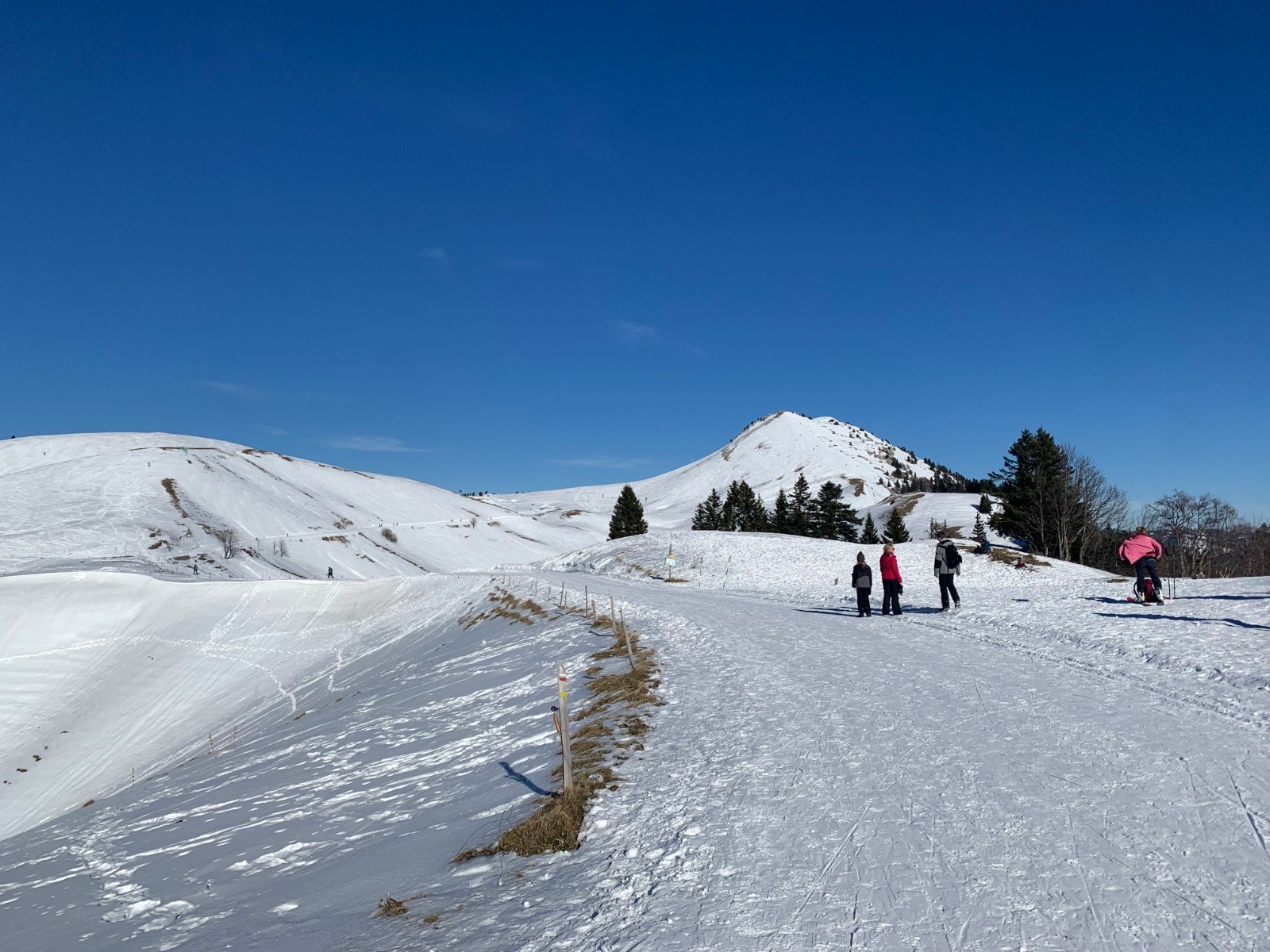 Une fois garés au col, le cheminement se fait facilement sur la route damée, entre luges et skieurs de fond, d'abord sur une neige froide à l'abris des arbres puis sur une moquette naissante plus haut.