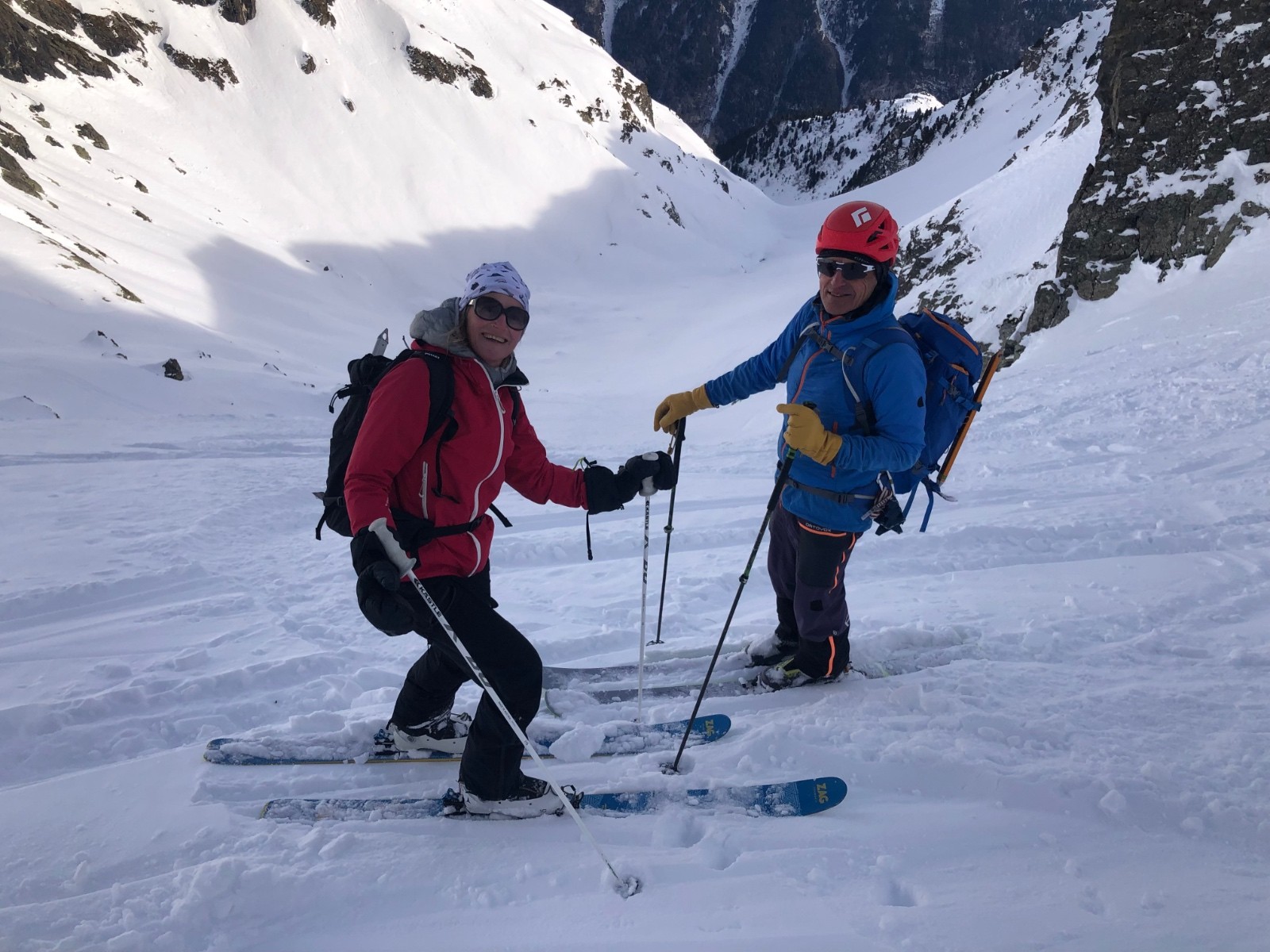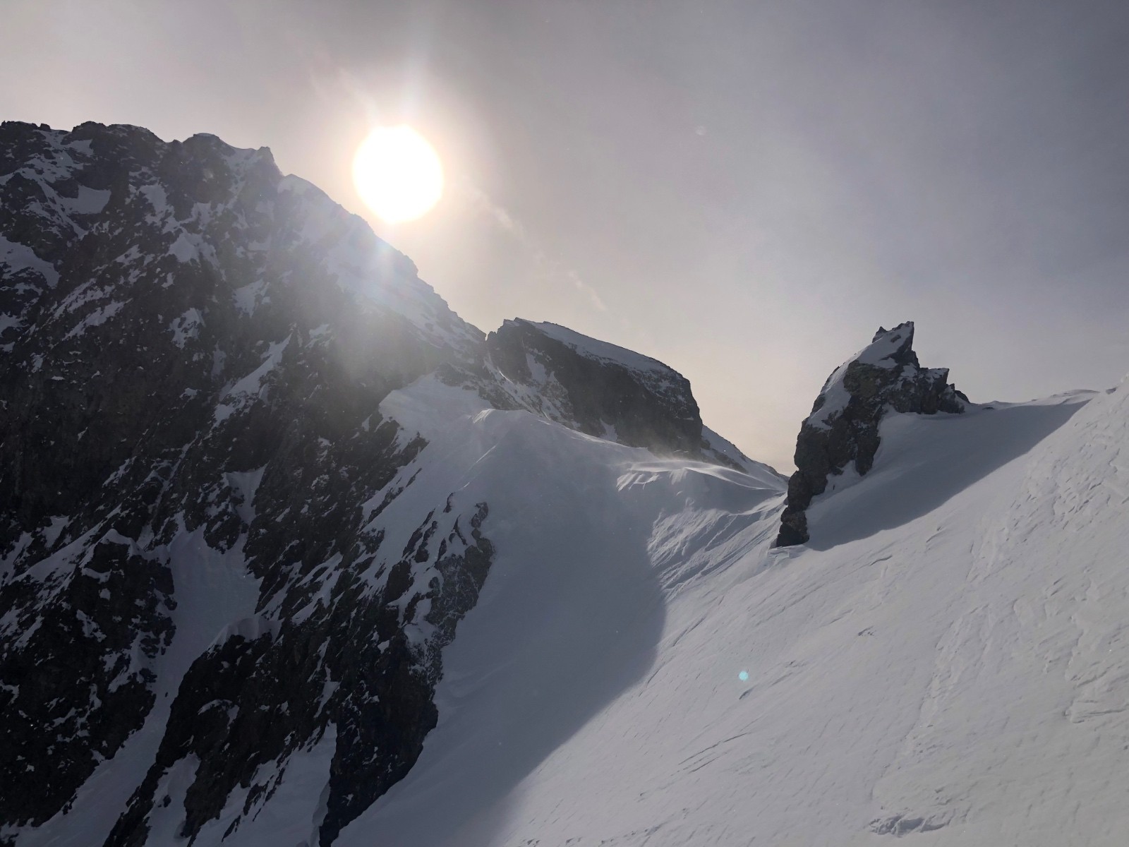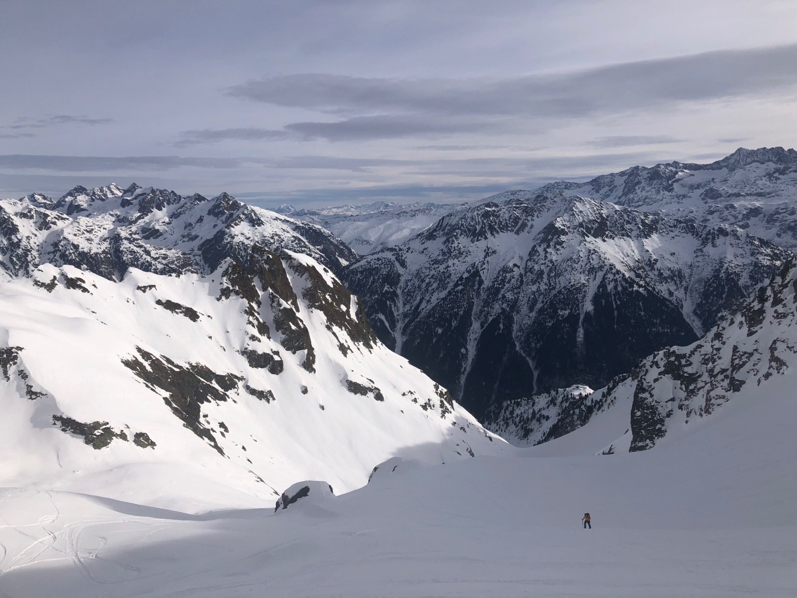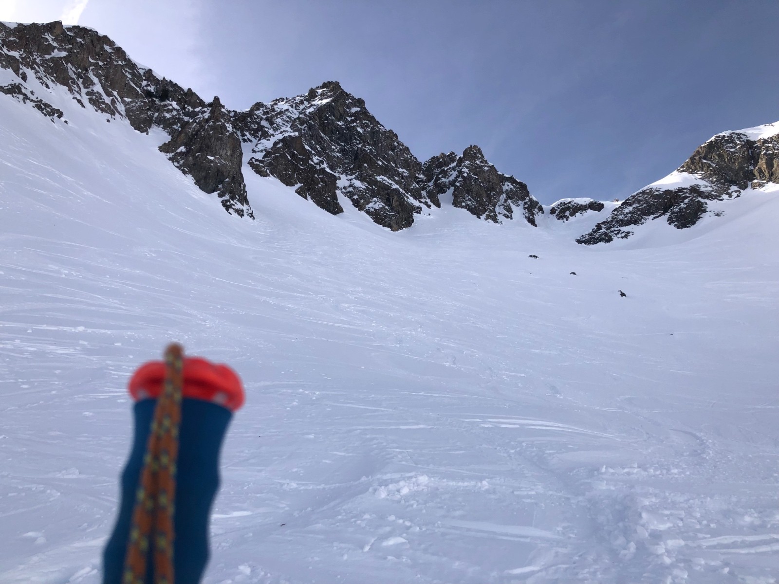 Chemin du bas skiable, avec qlq cailloux. Montée en neige tracée. Mise des couteaux sous le col. Pas de corniche, accès au col facile.