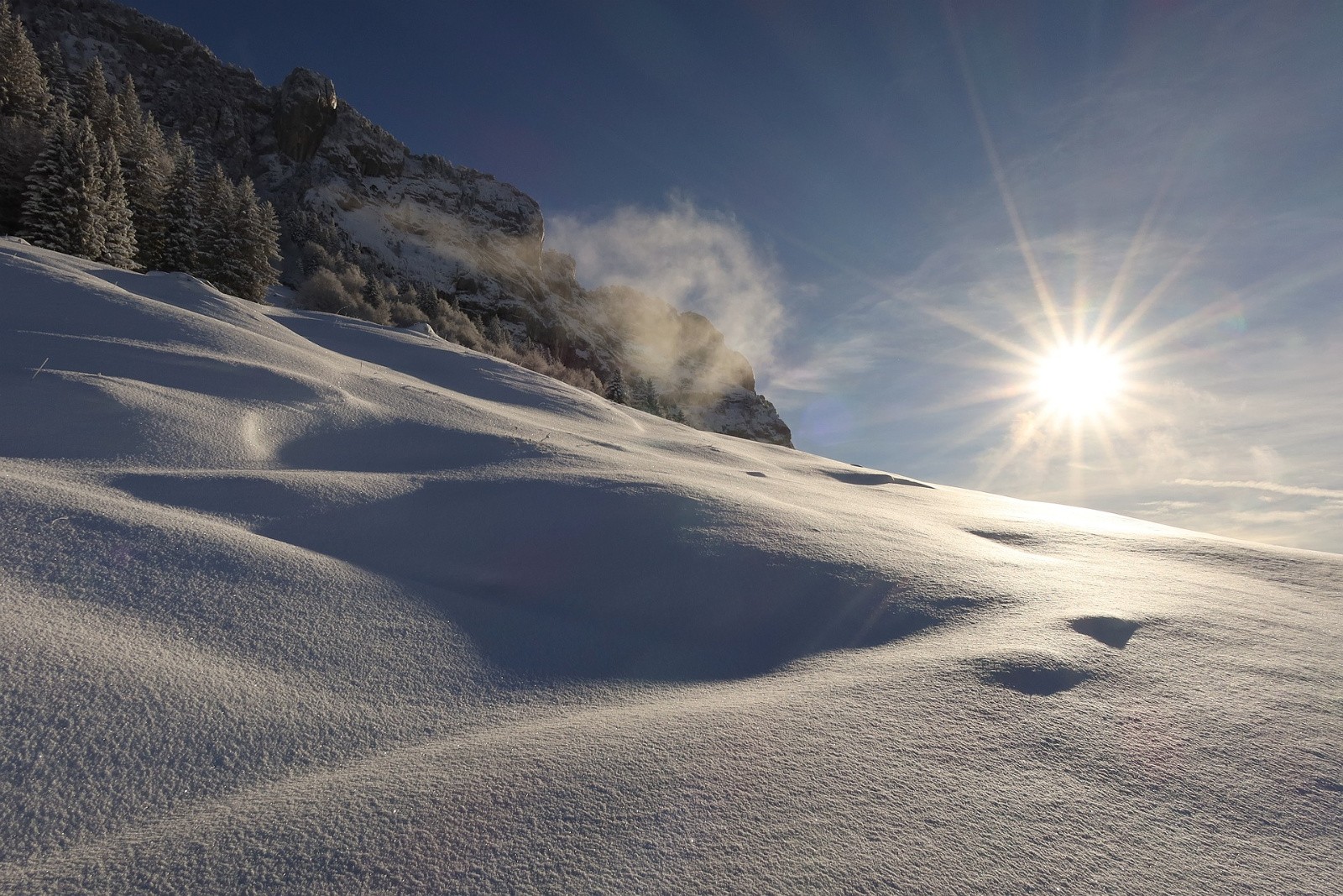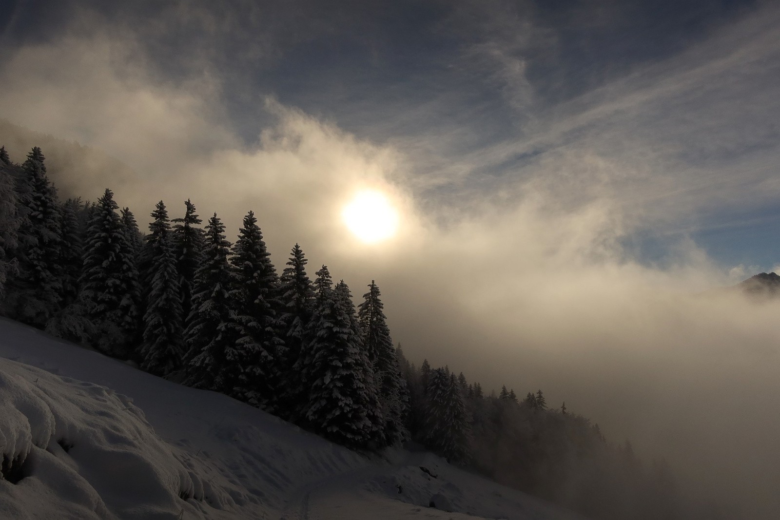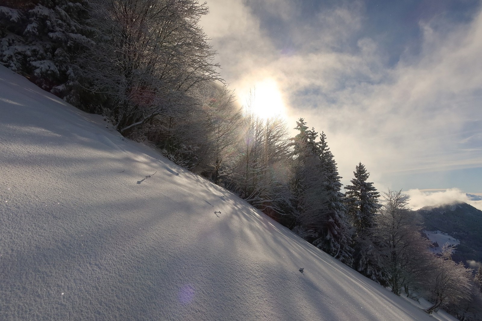 Faute d'une grosse motivation pour un itinéraire d'envergure vu la fatigue et les conditions nivologiques et météo, mais avec l'envie d'une petite dernière avant de rentrer de vacances... ce serait dommage de partir sans tâter de la neige toute fraiche ! Je pars donc pour ce vallon sud des chalets du Sollier, repéré en montant au Trélod il y a 4 jours, et en espérant pouvoir trouver des pentes sympas en direction du Roc des Boeufs. Un dénivelé modeste, un peu de poudre espérée... et dès le parking, la certitude d'avoir tiré le gros lot: le ciel bleu qui pointe sur les hauteurs, de la neige fraiche en suffisance (pour monter en tous cas), et pas une trace. Un plaisir immense à se laisser guider par les skis dans ce paysage de rêve hivernal ! J'ai même pu laisser quelques watts pour tracer la fin, dans un gros paquet de neige...