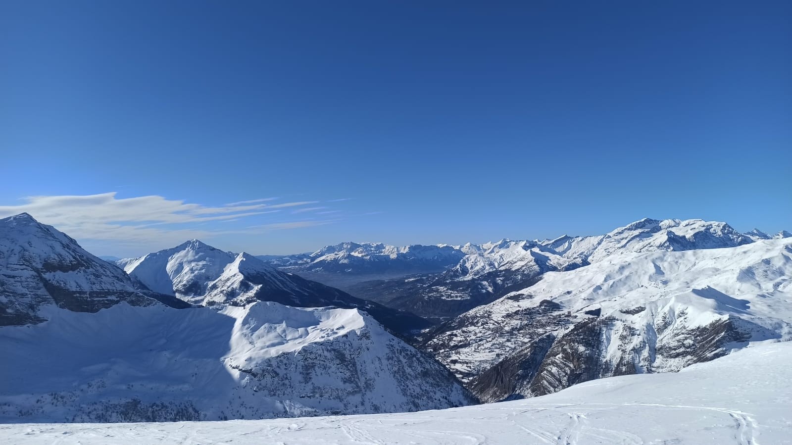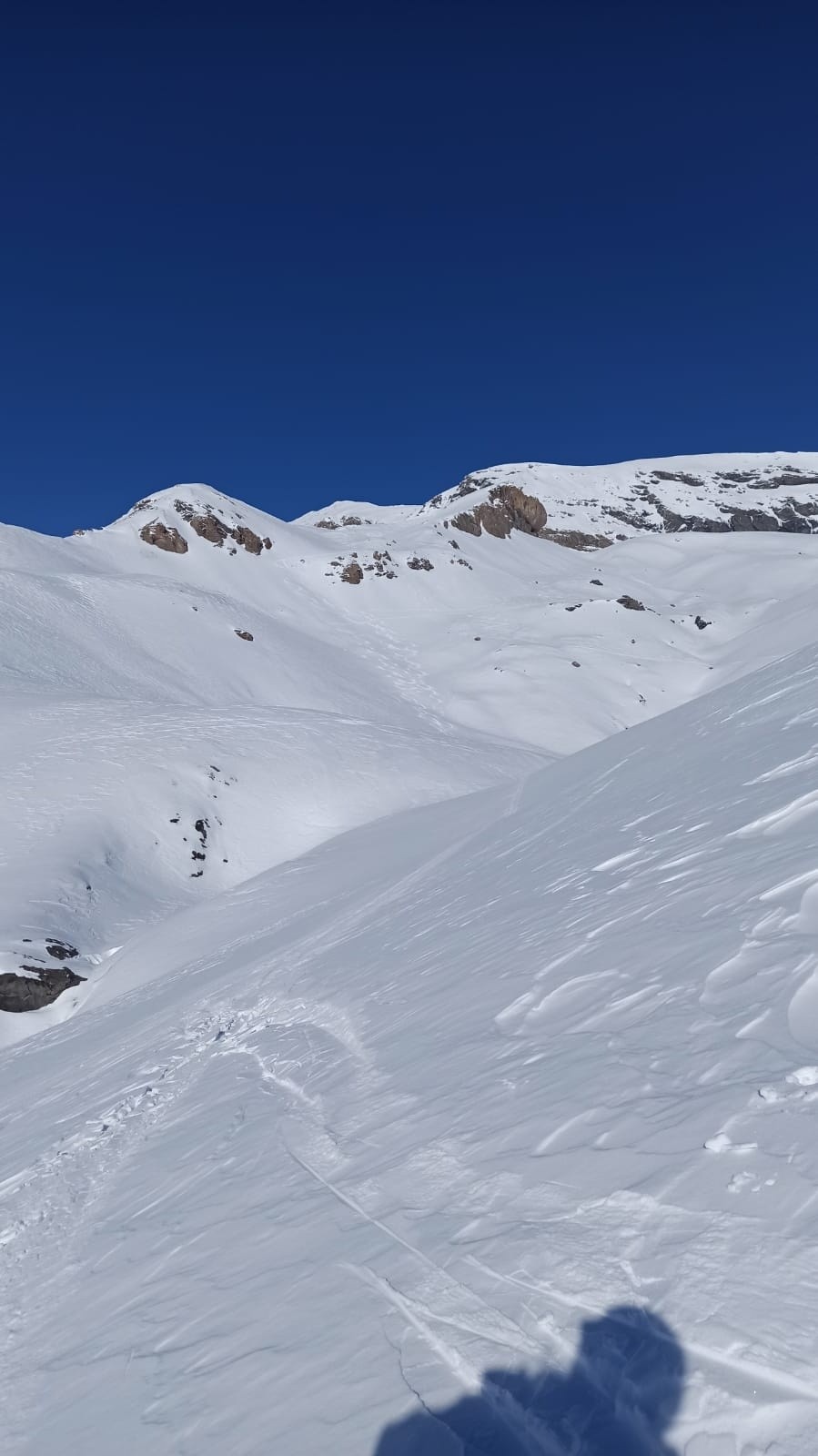 Conditions pour le ski : Tout juste correct en sélectionnant bien son cheminement de descente. Le vent à globalement fait du gros travail dans cette vallée. La neige va du carton à la croûte cassante inskiable en passant par la neige froide soufflée plus ou moins dure. On a quand même fait quelques bons virages du sommet jusqu'à 2250 (poudre légèrement croûtée par le vent), ensuite il faut sélectionner les combes pour trouver la neige froide ventée et éviter la croûte. En milieu d'après-midi ça commence à chauffer au soleil mais on est encore loin de condition type printemps. Depuis le saut du Laire, le long chemin du retour passe bien avec même quelques virages sympas sur une petite couche de neige froide.