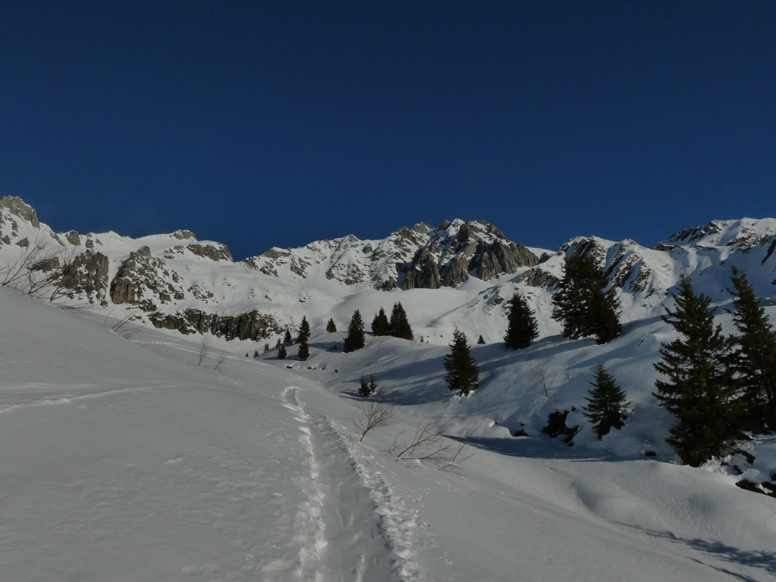 Conditions nivo et activité avalancheuse : Bon enneigement, RAS sur le parcours, traces de coulées et plaques sur le versant S raide du Crêt Maxet.