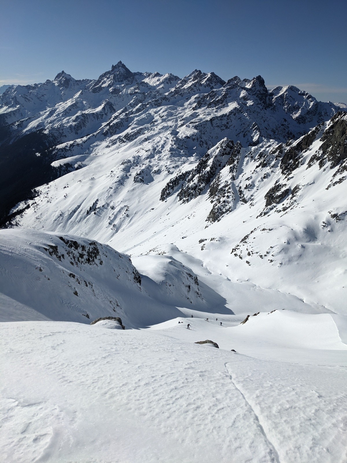 Partis pour une grosse balade mais sans itinéraire précis en tête, la montée pourrie à l'ombre jusqu'à l'aigleton nous convainc de la nécessité de skier en face sud. On commence par deux couloirs sous la belle étoile et on enchaîne avec la dent du Pra puis la cime de la Jasse.