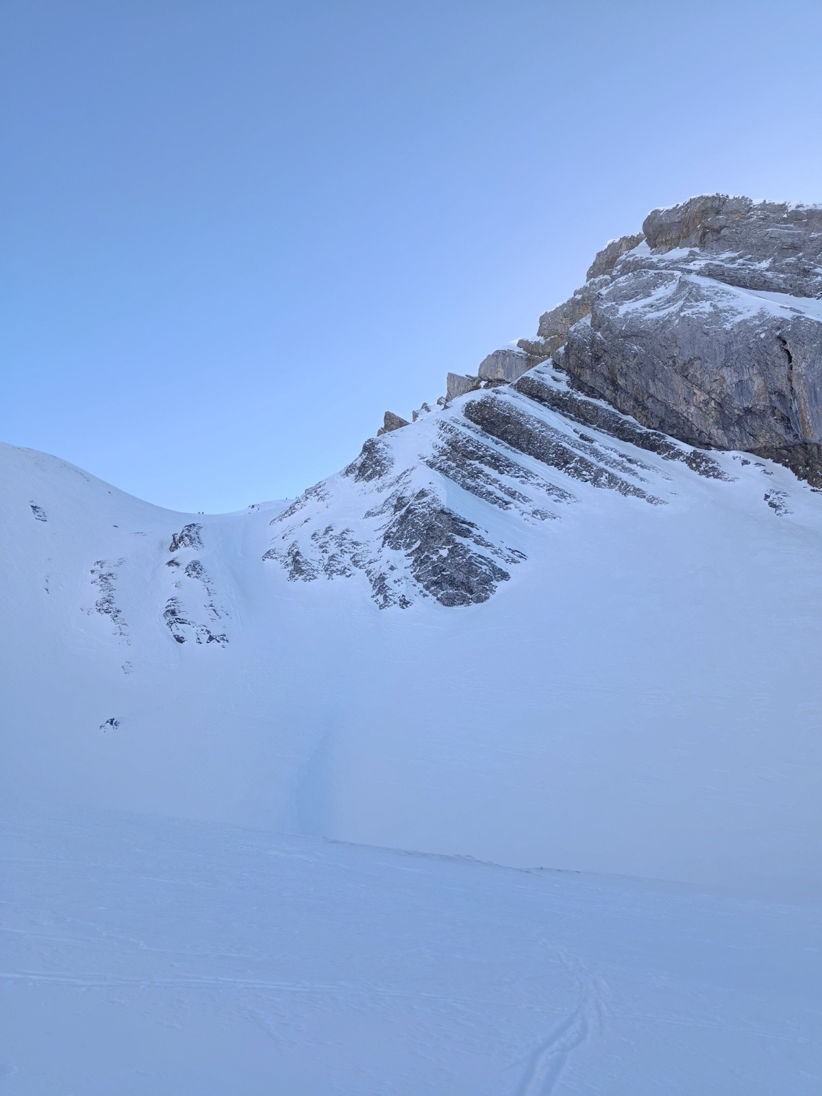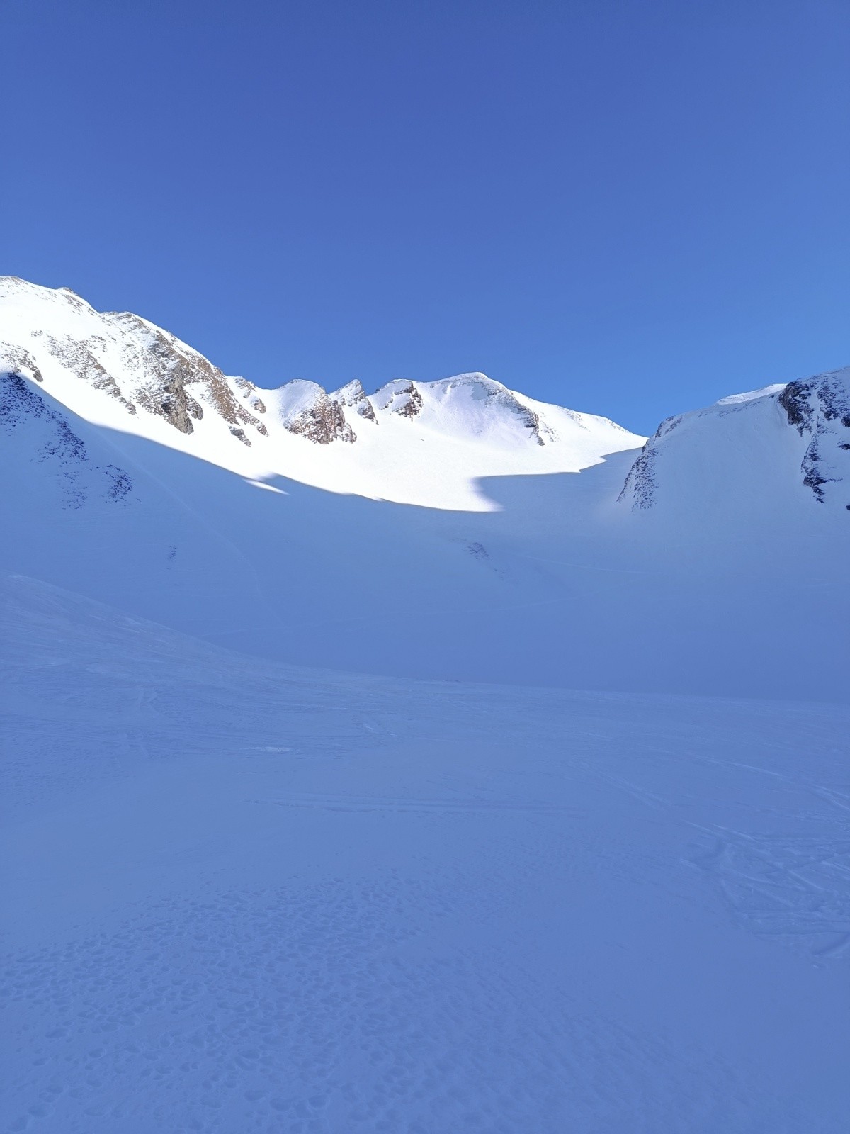 Descente moins mauvaise que ce que je pensais, ça tape les chaussettes mais la neige est dur et plutôt lisse. Pas de croûte ou de verglas donc ça ski plutôt correctement. Pas le ski de l'année mais on le savait vu la séquence météo !