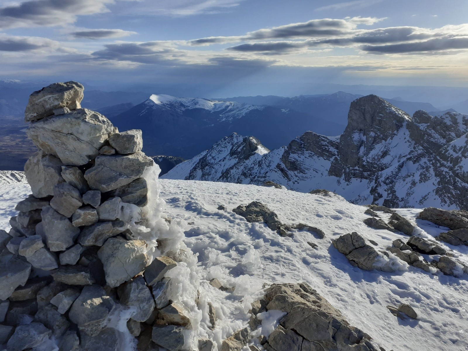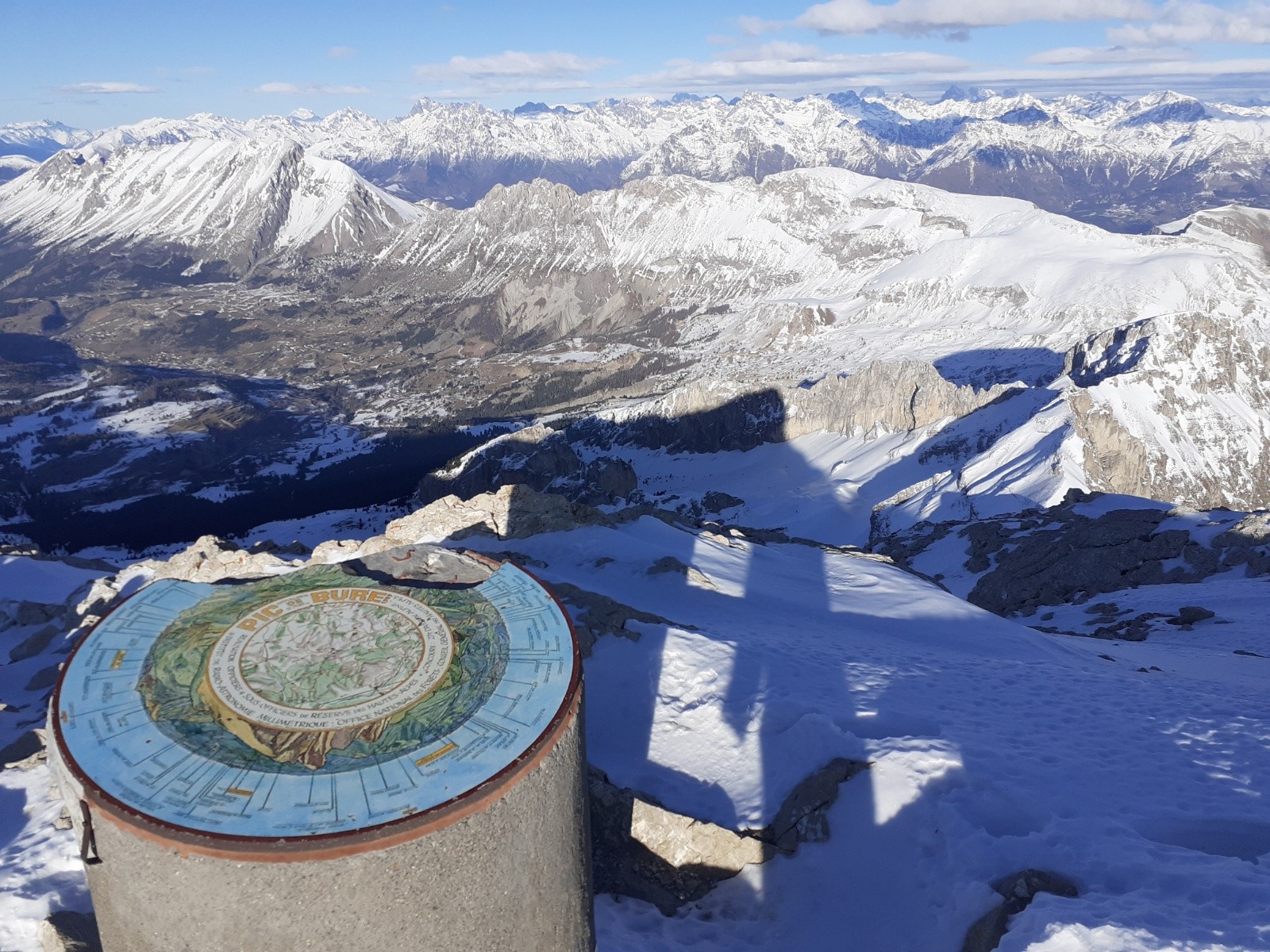 J'ai passé un temps infini à monter, sur une neige qui ne rendait pas toujours bien sous les skis, mais le soleil semble toujours bien dans l'axe de la pente de la combe d'Aurouze, donc je prends encore le temps de monter au pic de Bure. Aller-retour pas si rapide car le final du sommet est un ensemble de cailloux agglomérés dans la glace. Ça peut se remonter prudemment à ski, mais les 50 premiers m sont à descendre ski sur l'épaule.