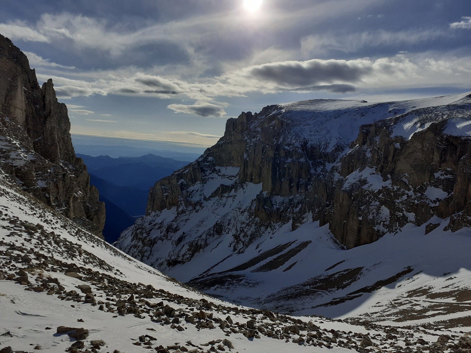 Petit portage bucolique sous un soleil presque chaud. Le versant se dévoile, bien plus sec que ce que je pensais, mais quelques (et surtout une) langue de neige salvatrice de moins de 10m de large me permet de chausser à 1650m, grosso modo au bout de la traversée horizontale.