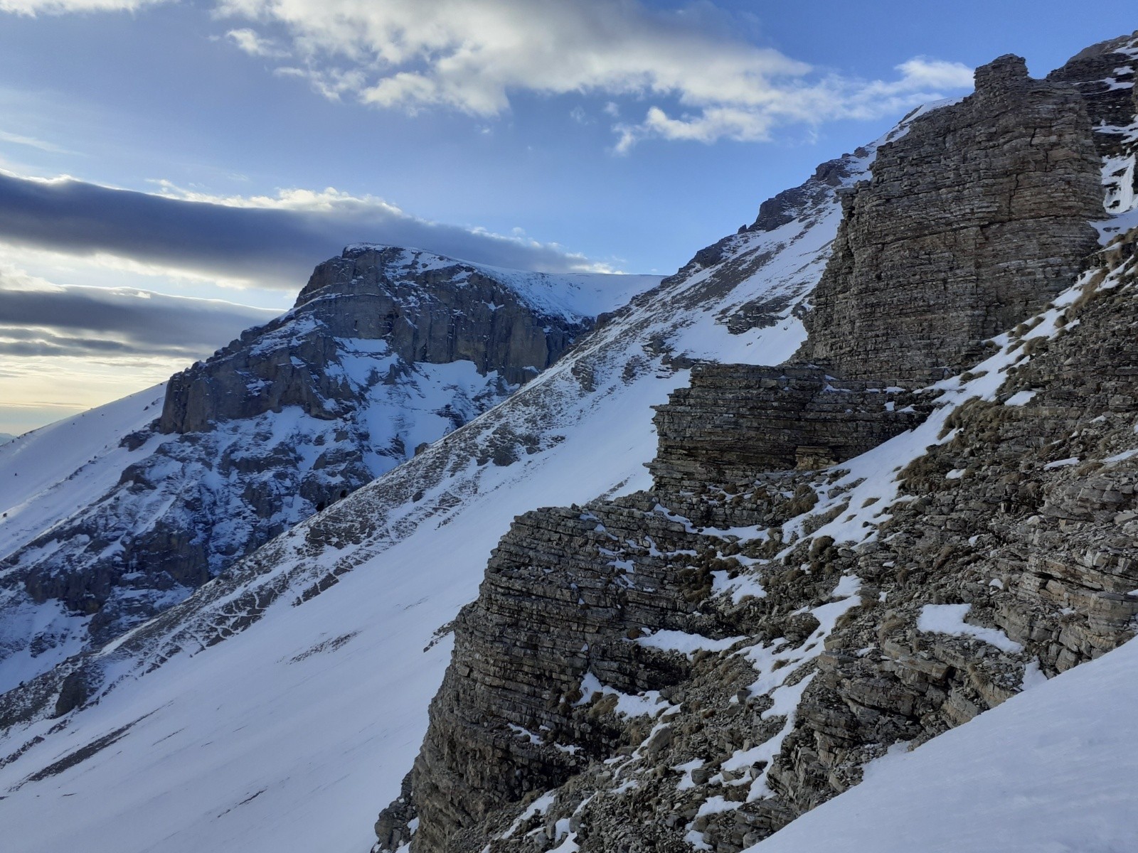 Enneigement qui devient plus conséquent et continu au dessus de la fontaine du vallon. A ce moment j'ai droit à une petite séquence "la faune de nos montagnes", ou j'observe 3 beaux spécimens qui tentent de remonter le GR dans le début de la combe d'Aurouze, chaussés visiblement,vu les traces, de vans et baskets de ville, sur une neige ou mes carres ne mordent pas plus qu'il ne faut. Ils doivent avoir de bonnes griffes puis ce que visiblement ils continuent plus ou moins à 4 pattes... En négociant une zone pelé par le vent juste sous le verrou de la combe de Mai, je quand même soulagé d'apercevoir que les loulous ont pu redescendre du traquenard ou ils s'étaient engagés...