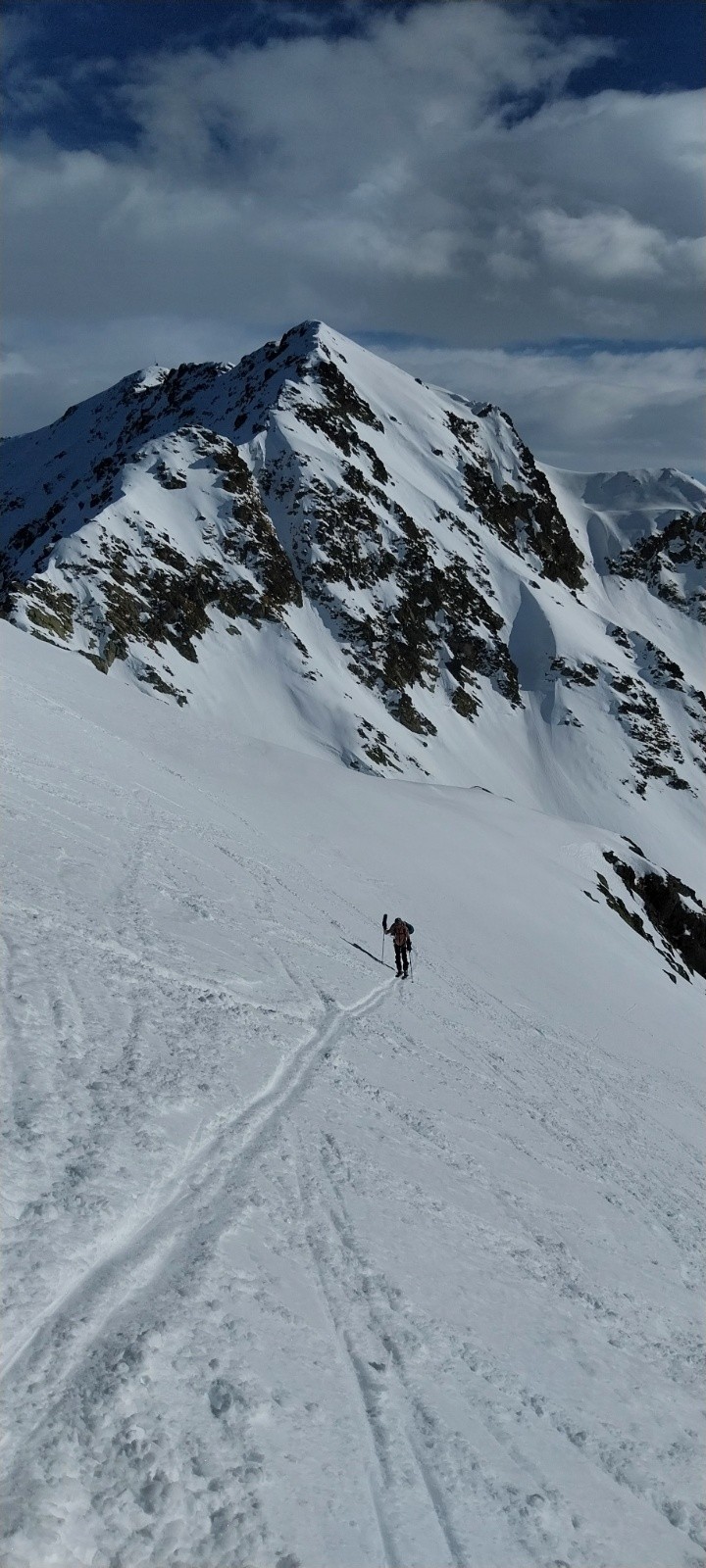 Le border passe à ski en faisant attention aux cailloux. Ça descend à ski encore assez bas, les filles ont tout fait à ski en déchaussant un peu et moi j'ai fini à pied à partir de 1400m.