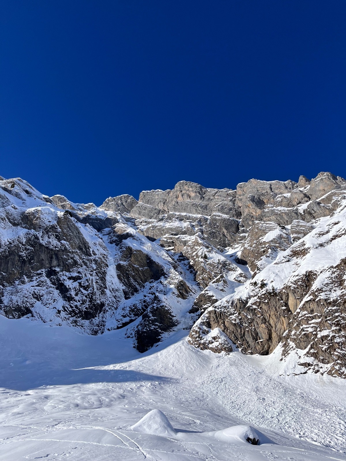 Bas du couloir goulotté par les passages et la neige tombant des barres rocheuses.