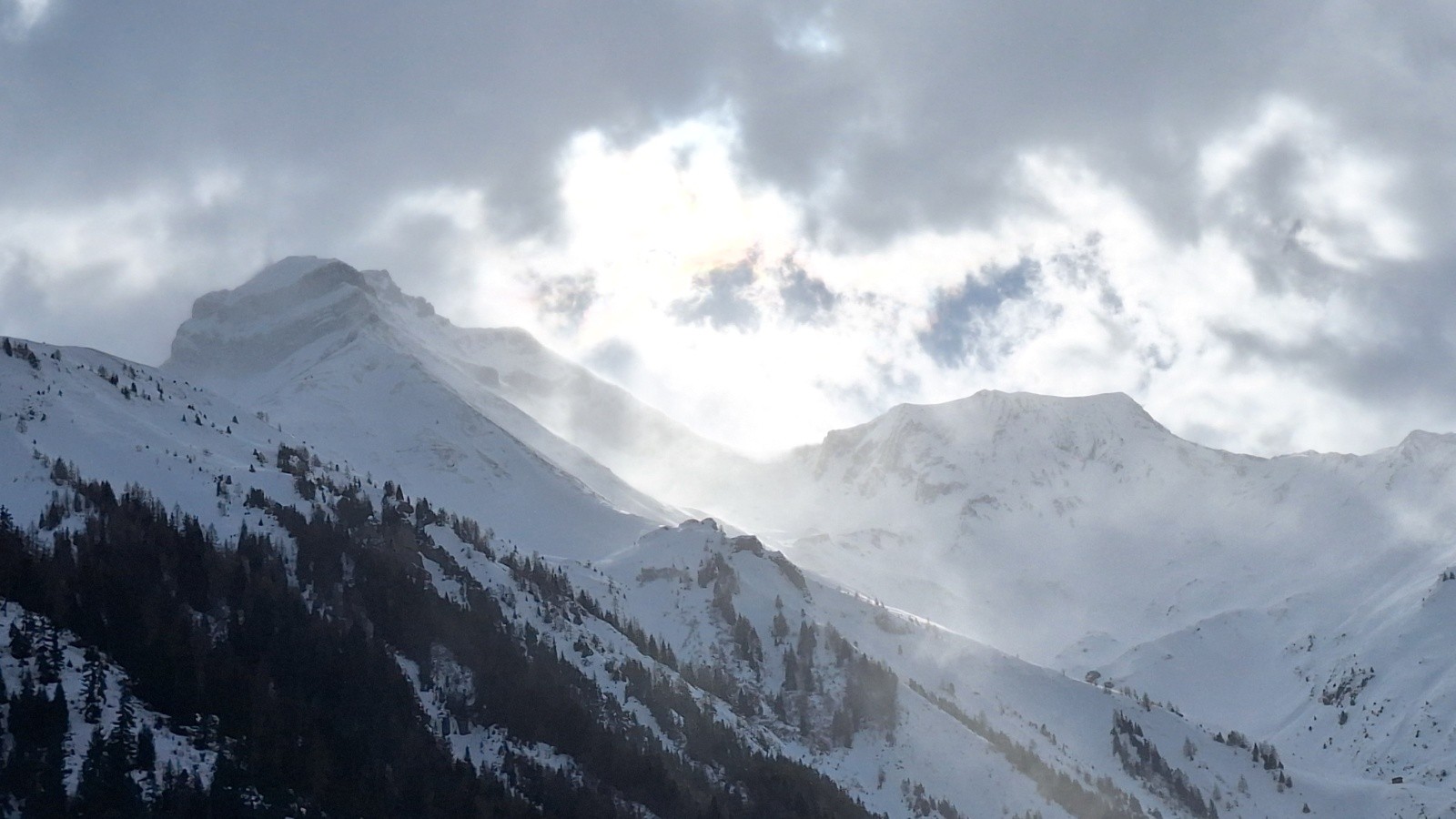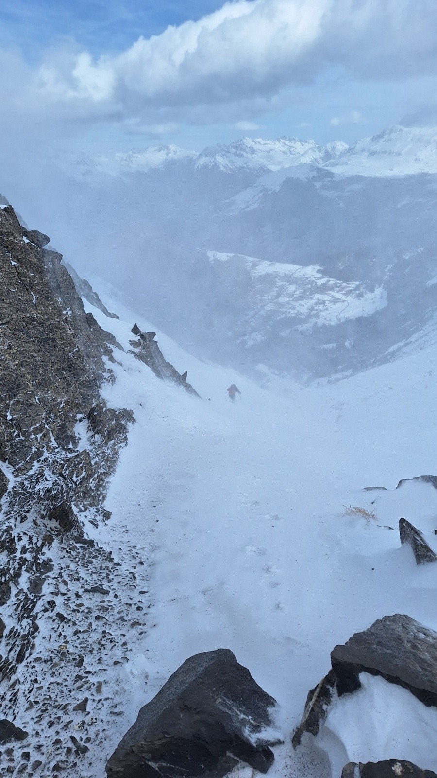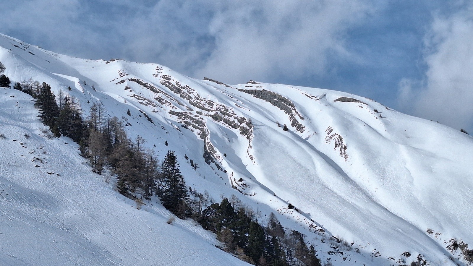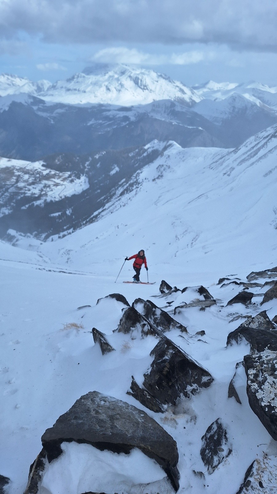 Conditions pour le ski : bonnes dans l'ensemble : neige dure avec une couche irrégulière de neige fraîche souvent compactée par le vent.