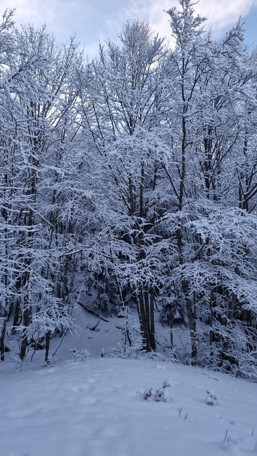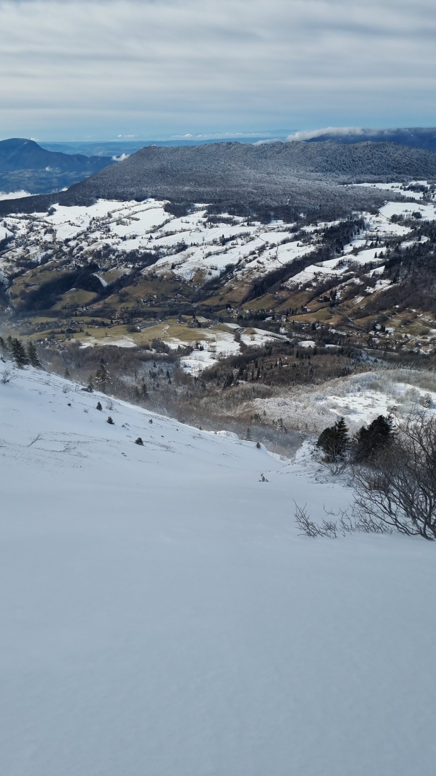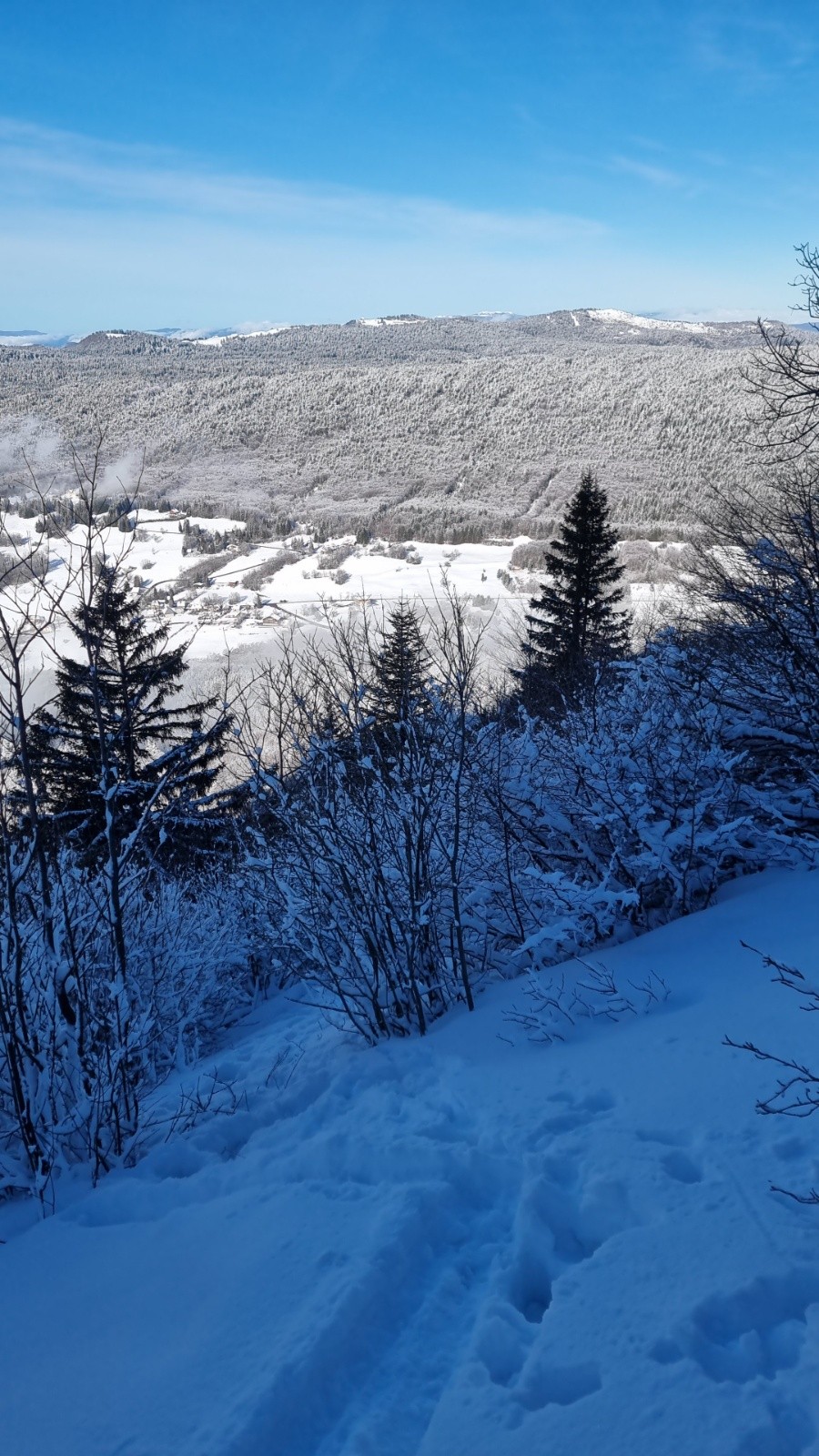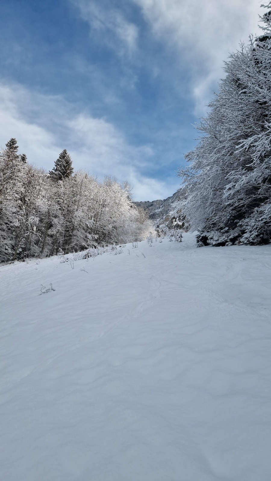 Après la piste, l'attaque de la forêt est plus délicate.. genre ski combat à la montée entre les branches glissantes au sol, les vernes et arbres qui font tomber de bonnes quantités de neige sur la nuque..
