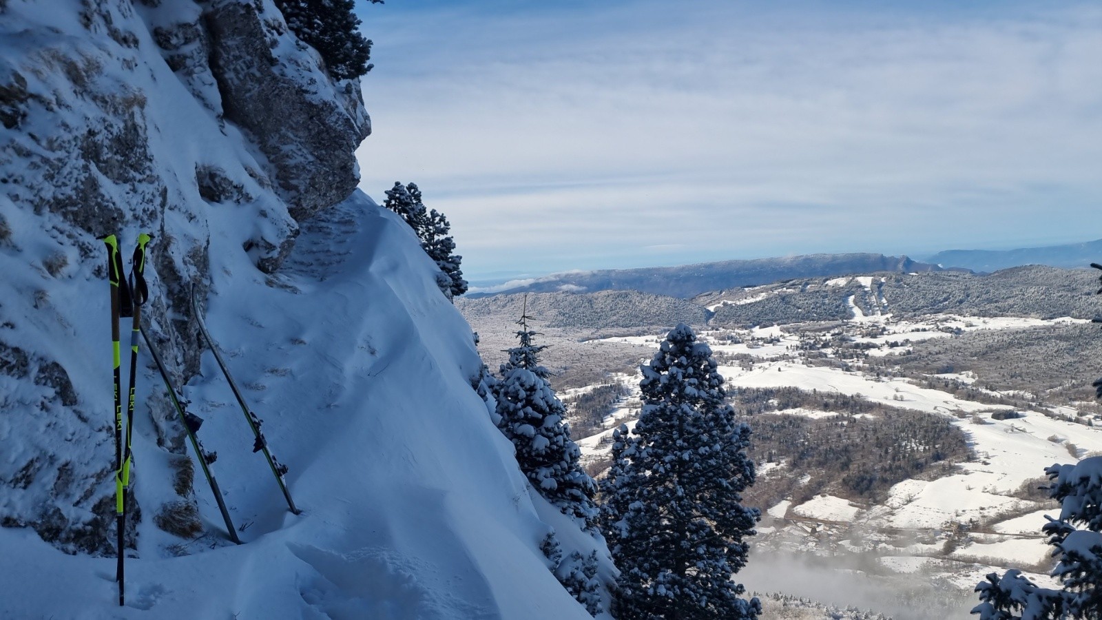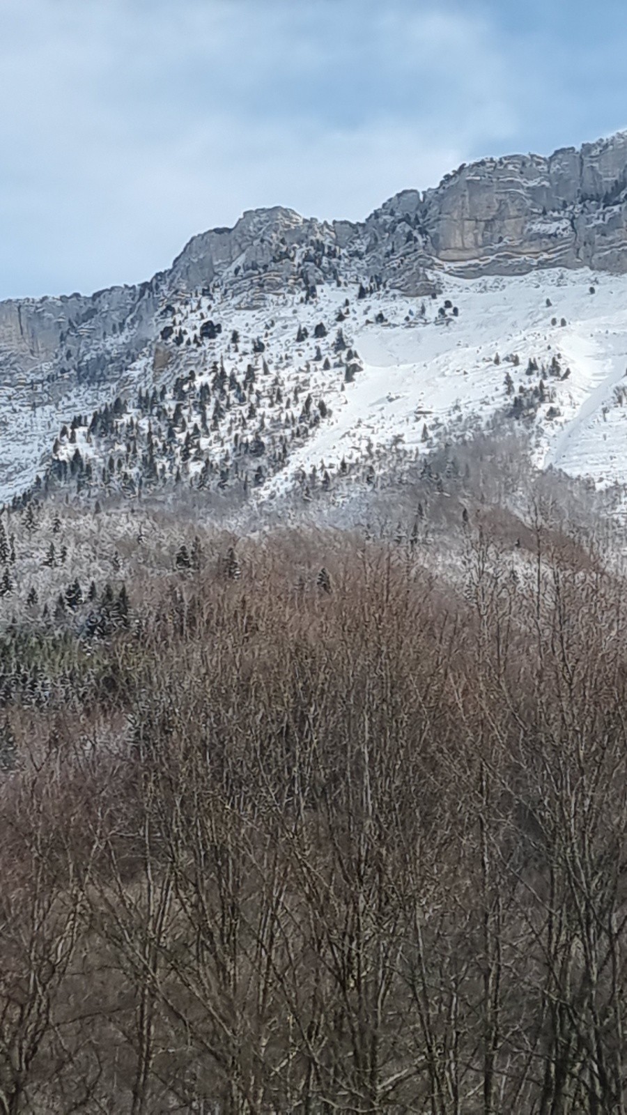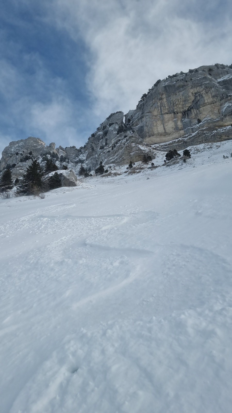 La trace, avec couteaux, se passe bien jusqu'au pied des falaises... tj une belle ambiance.. un peu comme le granier, cette rando, c'est " 1 rando - 4 ambiance" en moins de 800 m.. entre la piste du bas, la foret, la prairie et les barres..