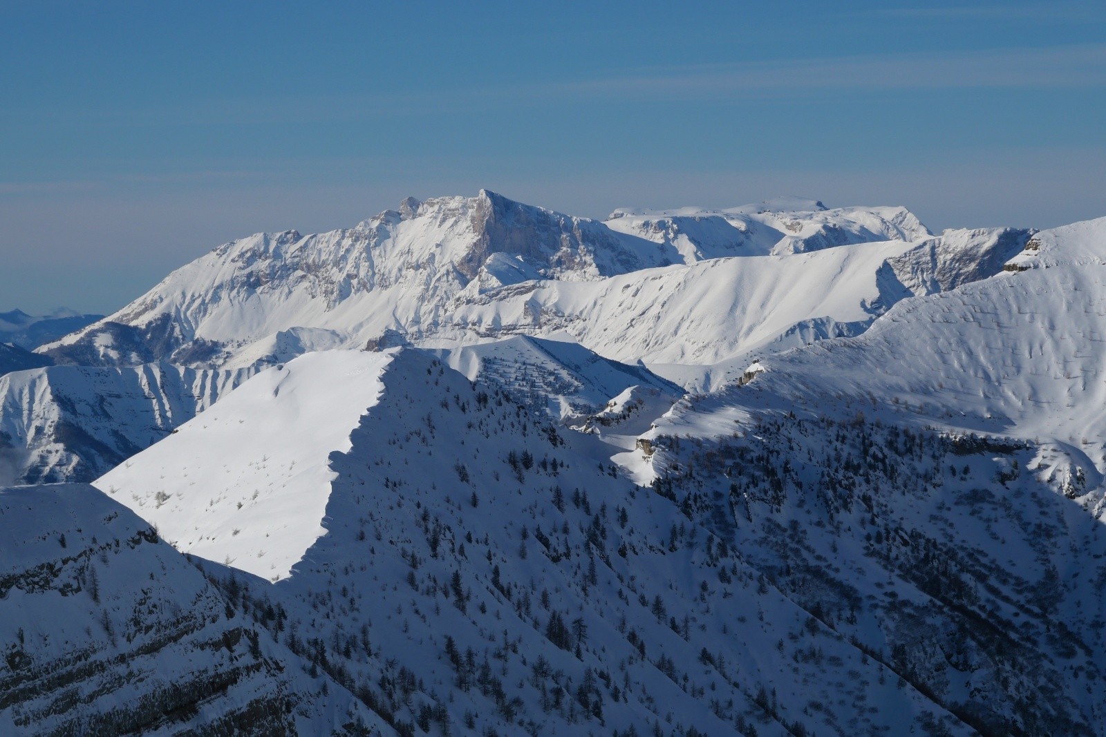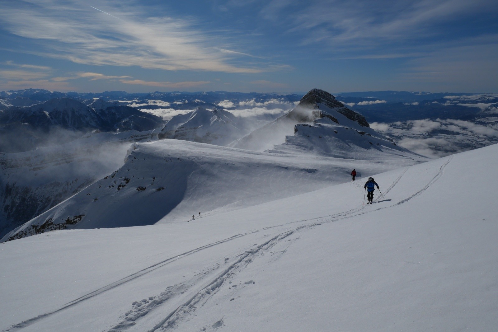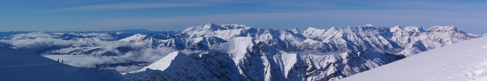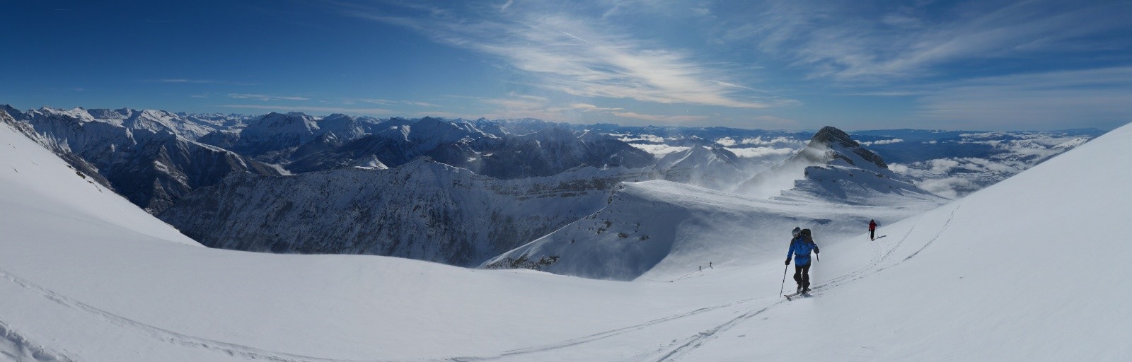 Nous profitons de la montée dans un paysage à couper le souffle. Avoir de la poudre sur le doyen du bas jusqu'en haut, ça n'est pas tous les jours ! Quelle vue au sommet, on ne s'en lasse pas. Tous les beaux massifs des alpes du sud sont visibles ! Arrivé au sommet vers 13h, ça se bâche rapidement, alors on redescend rapidement pour profiter de la visibilité déclinante.
