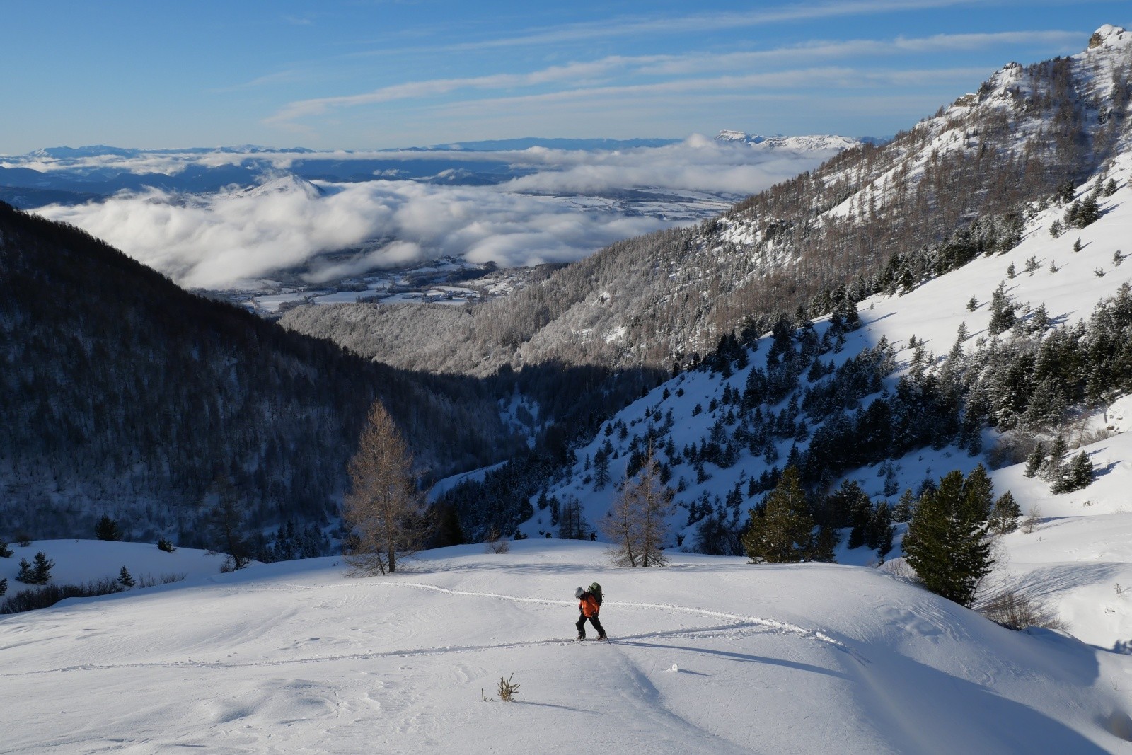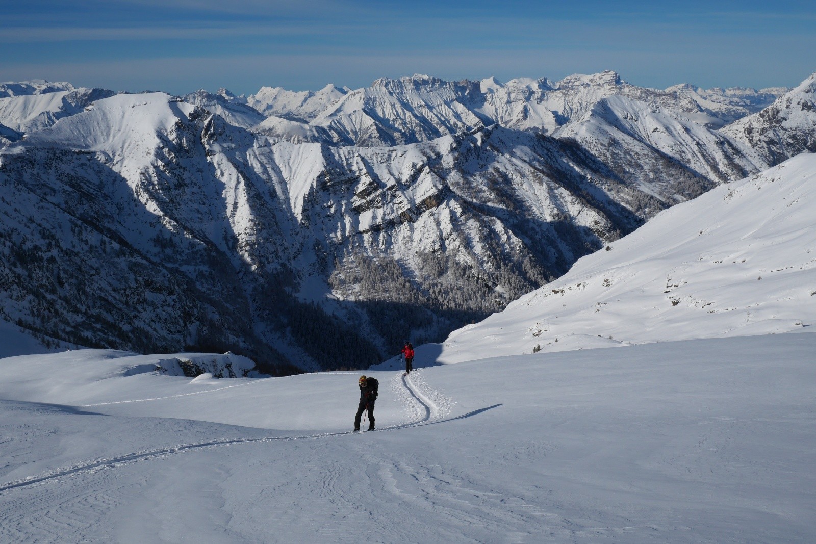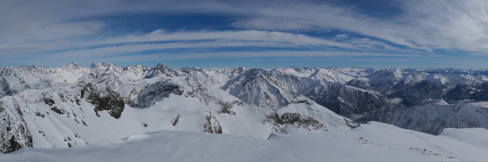 Nous profitons de la montée dans un paysage à couper le souffle. Avoir de la poudre sur le doyen du bas jusqu'en haut, ça n'est pas tous les jours ! Quelle vue au sommet, on ne s'en lasse pas. Tous les beaux massifs des alpes du sud sont visibles ! Arrivé au sommet vers 13h, ça se bâche rapidement, alors on redescend rapidement pour profiter de la visibilité déclinante.