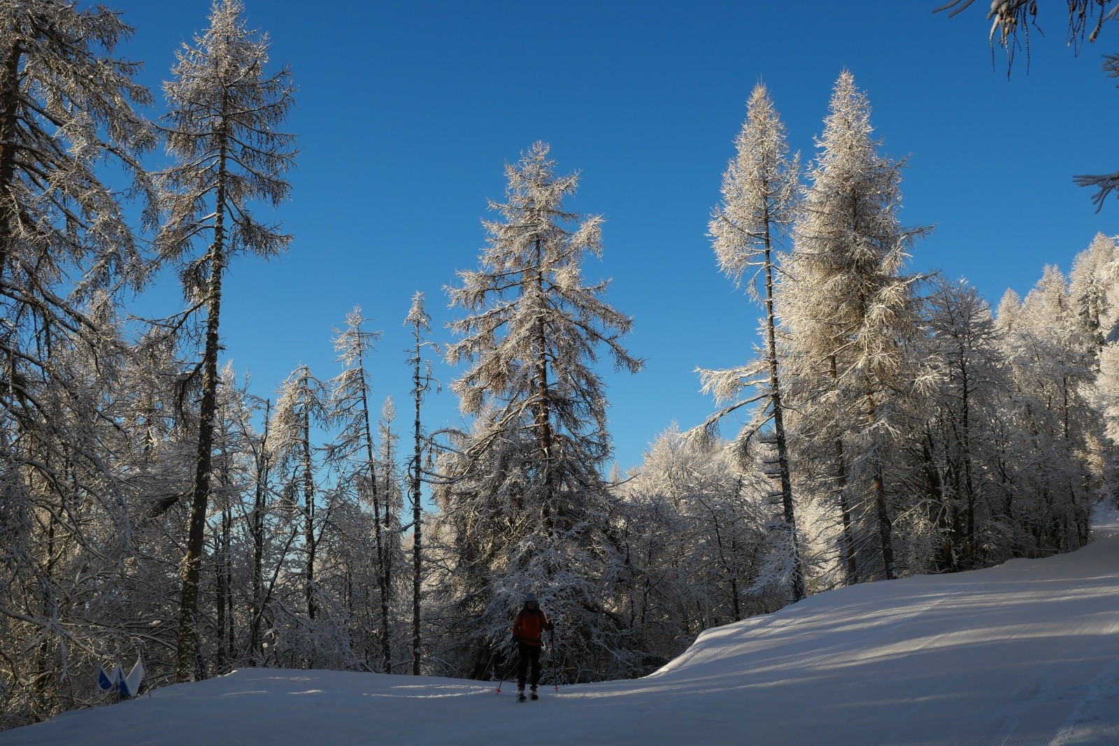 Le XXème siècle a fait son apparition quelques heures la nuit dernière, faisant fuir le monstre du Champsaur aperçu hier soir (première photo). Il a eu la bonne idée de poser entre 10 à 20cm de neige fraiche sur l'intégralité de la montée, même si en altitude le vent a travaillé la neige.