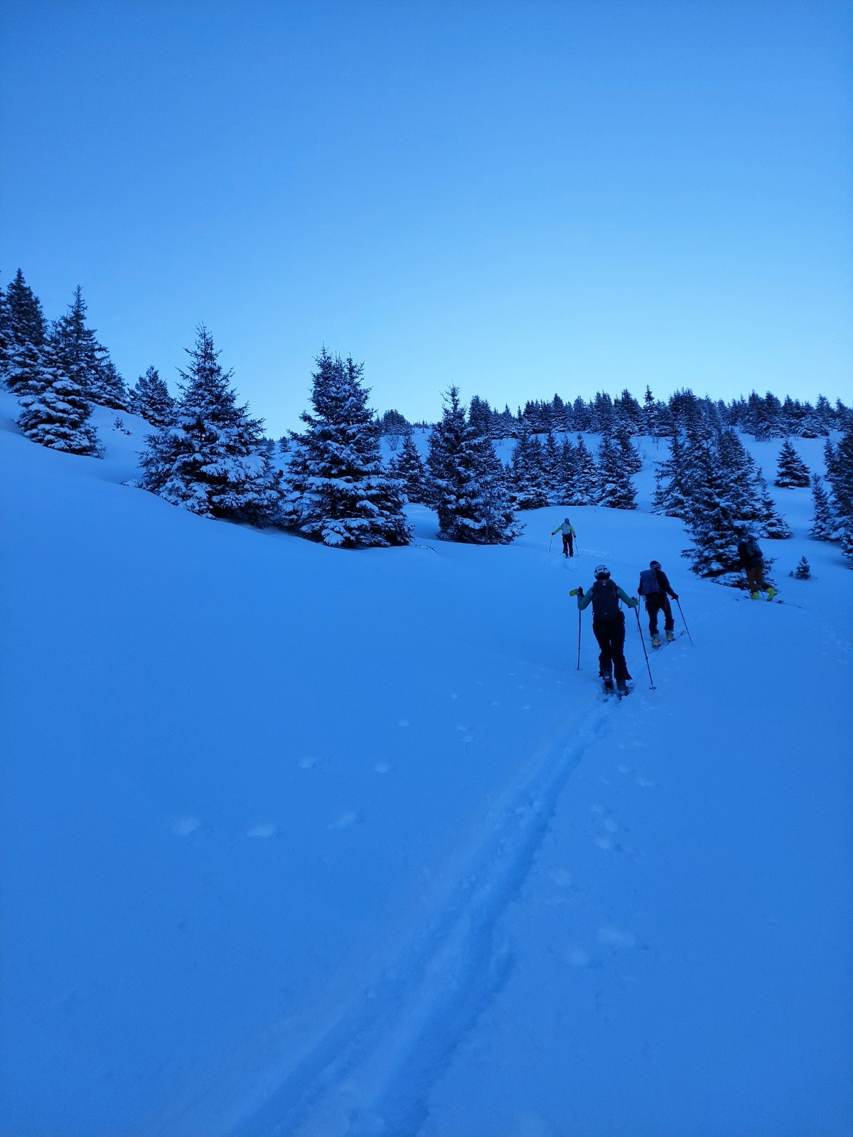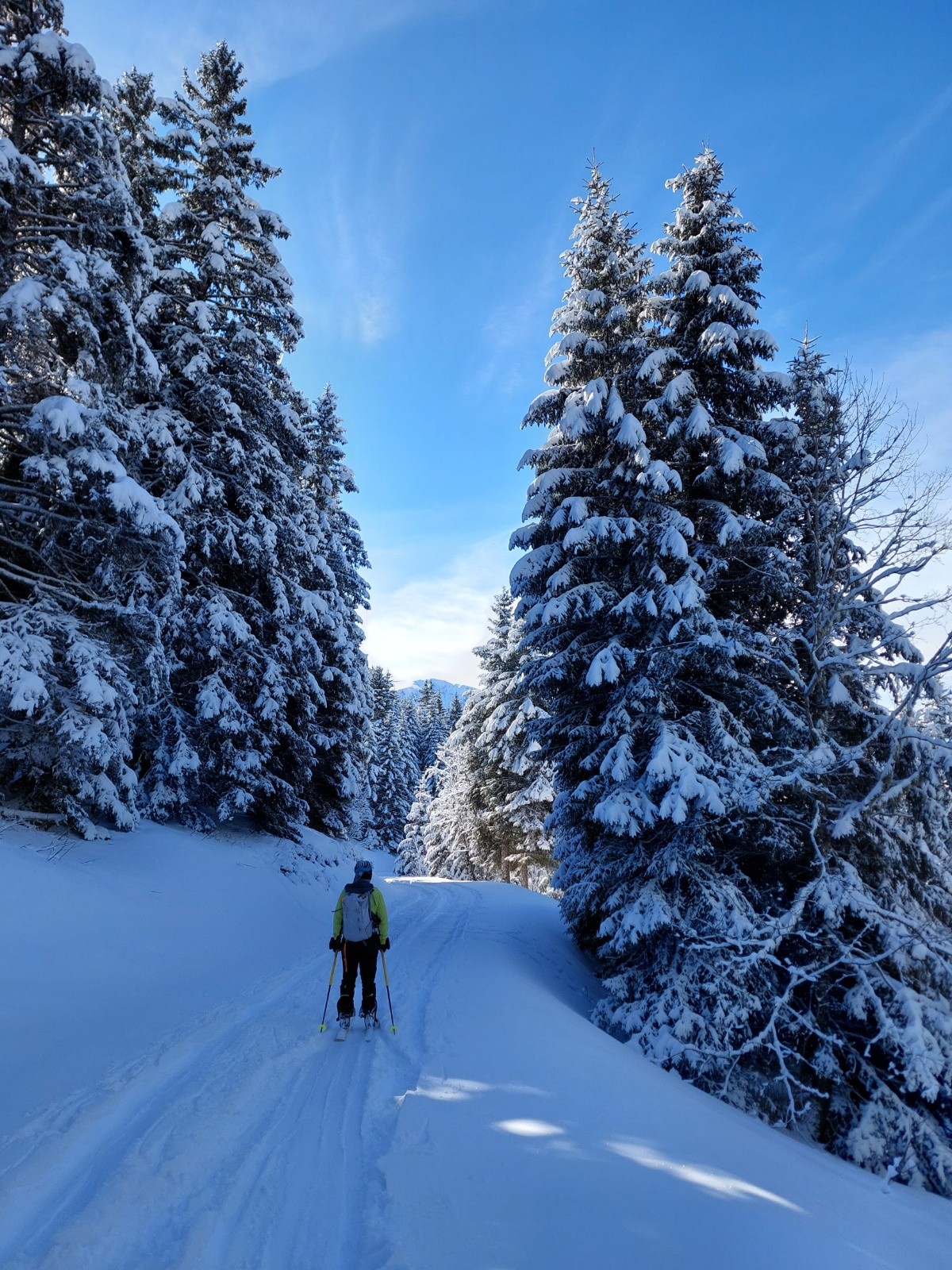 Itinéraire suivi : montée par la forêt jusqu'à la cote des salières et le sommet de la crête du Brouffier. Descente jusqu'au lac du Brouffier (5*!), remontée jusqu'à l'altisurface environ, redescente dans la combe de Guiliman où les requins ont attaqué, remontée par le petit couloir jusqu'à l'altisurface (on a mis les skis dans le dos, pas tracé jusqu'en haut), descente finale par la cote des salières et la route entre les sapins tout enneigés !