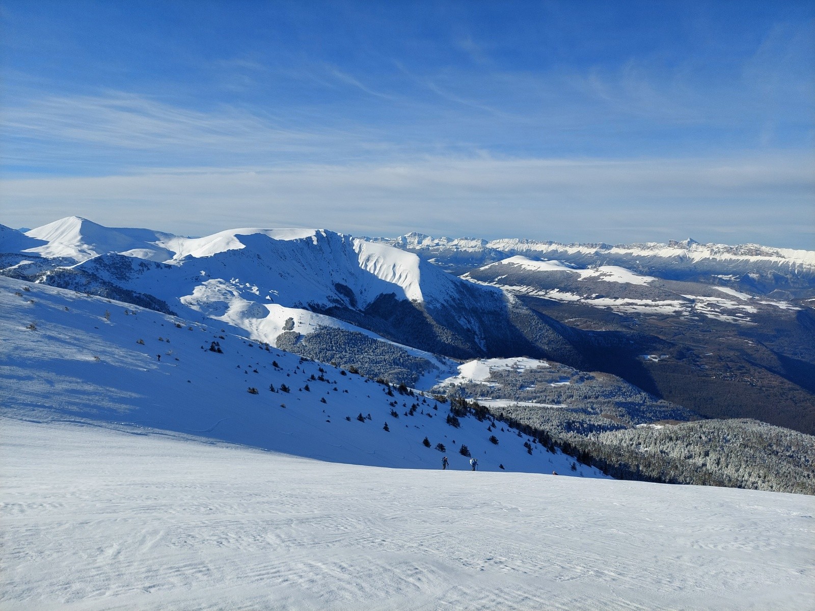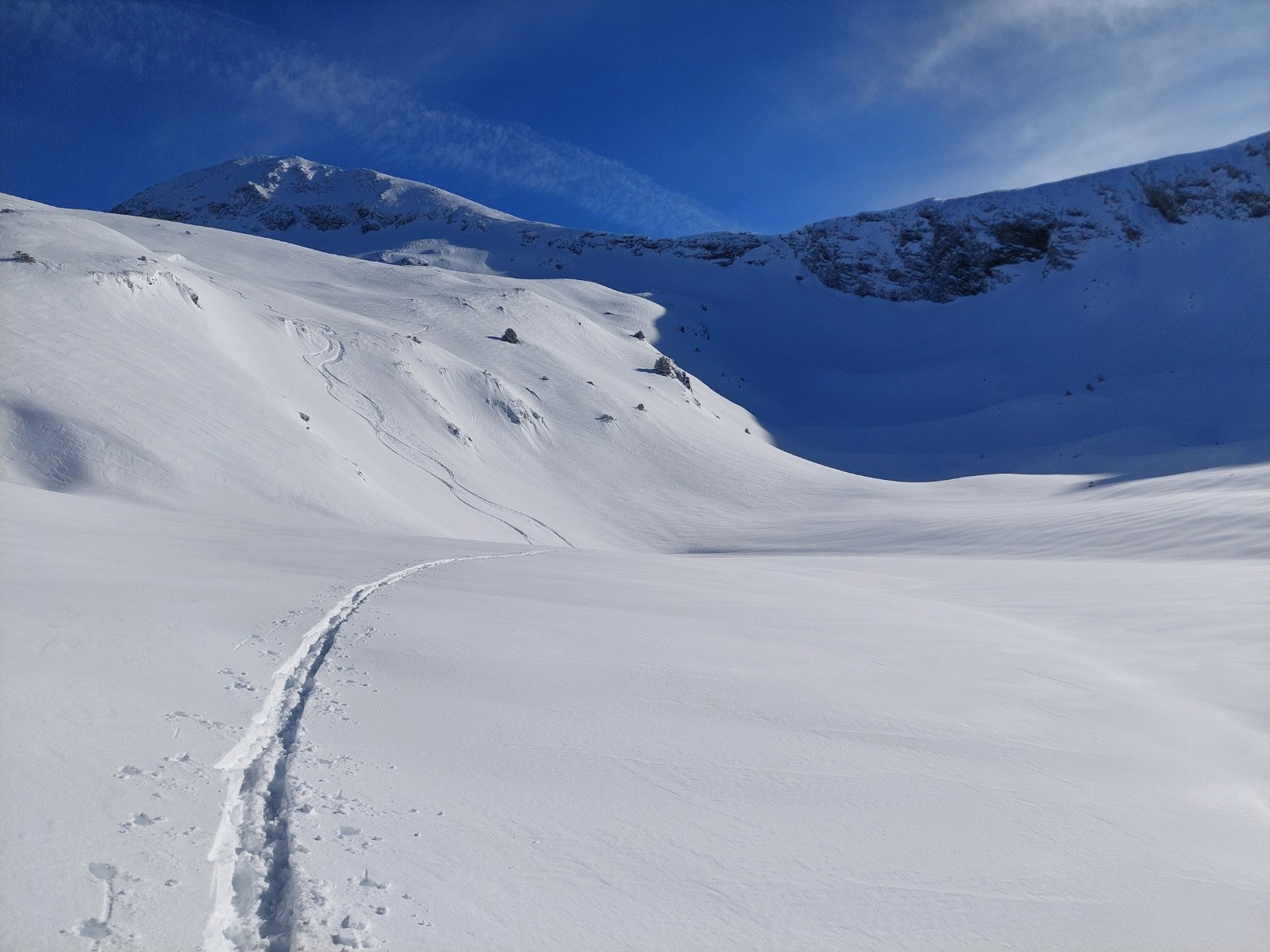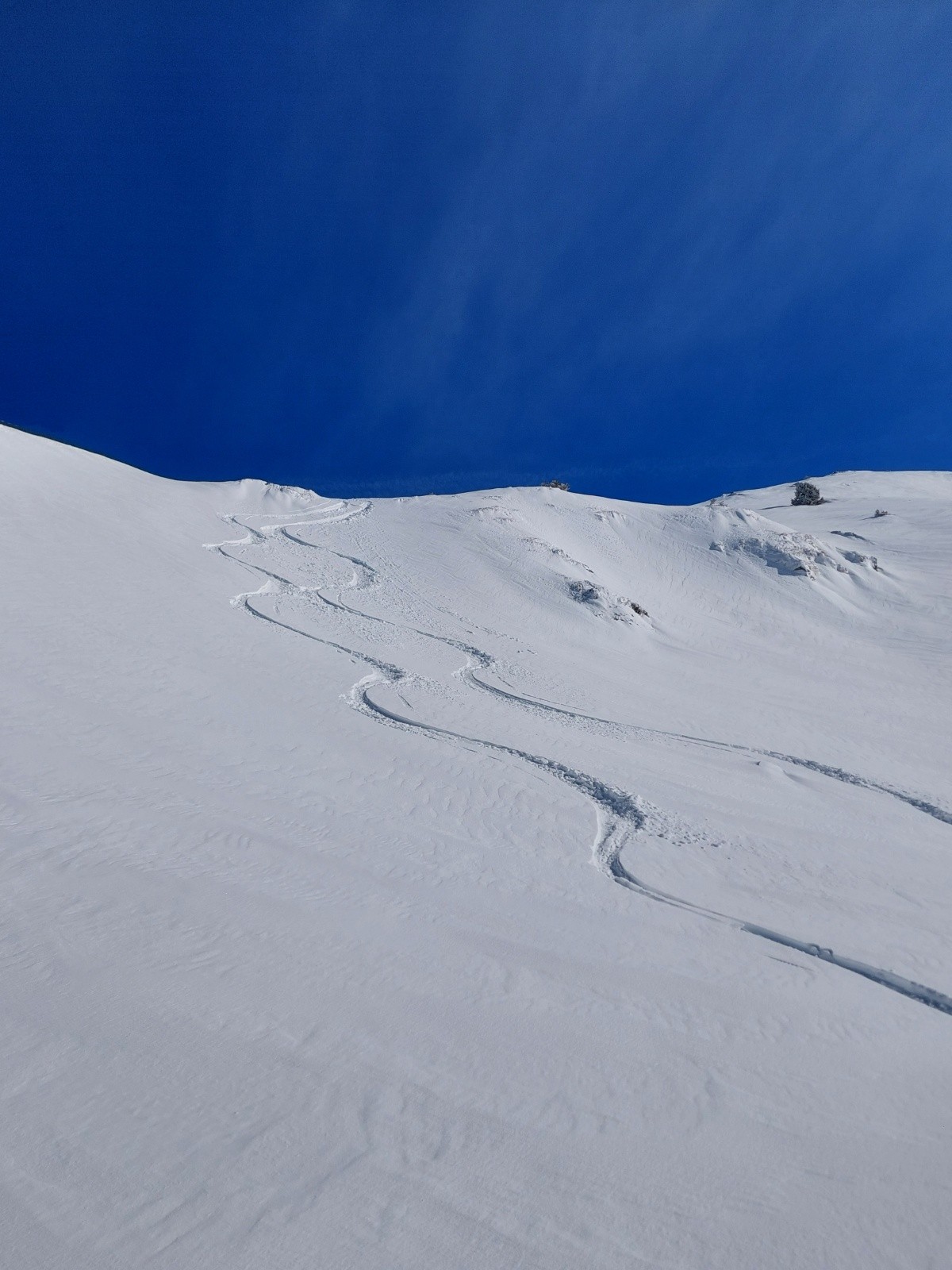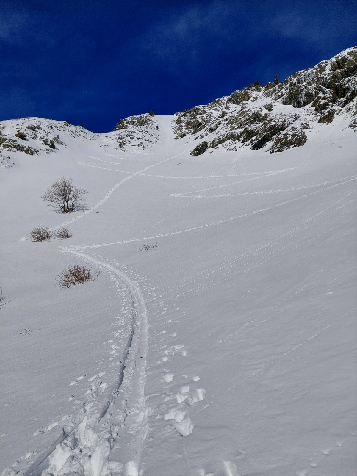 Conditions pour le ski : poudre vierge environ 10cm mini, plus sur la partie haute, sur fond dur. Un régal !