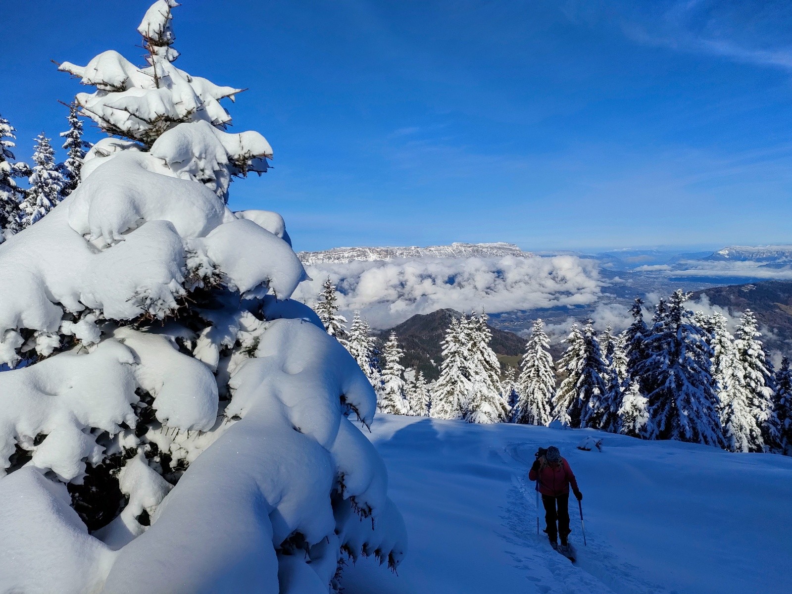 Le Grand Rocher après une belle chute de neige c'est un peu comme cette partition jubilatoire du fringant compositeur Georges Friedrich Haendel. Commencer à marcher sous le ciel bleu au milieu des grands conifères couverts de neige annonce la couleur de la randonnée, elle va être sans doute formidable. Plus loin le passage de trois skieurs matinaux dévalant la pente à skis feutrés laisse présager une neige divine à pourfendre, voilà de quoi être joyeux. Si le départ de la randonnée est frigorifique à l'ombre de la crête du Grand Rocher, nous ne tardons pas à passer au soleil rasant, le changement de tempo est instantané, à la froide et hivernale marche succède une délicieuse sarabande où le soleil réchauffe le corps et le cœur.