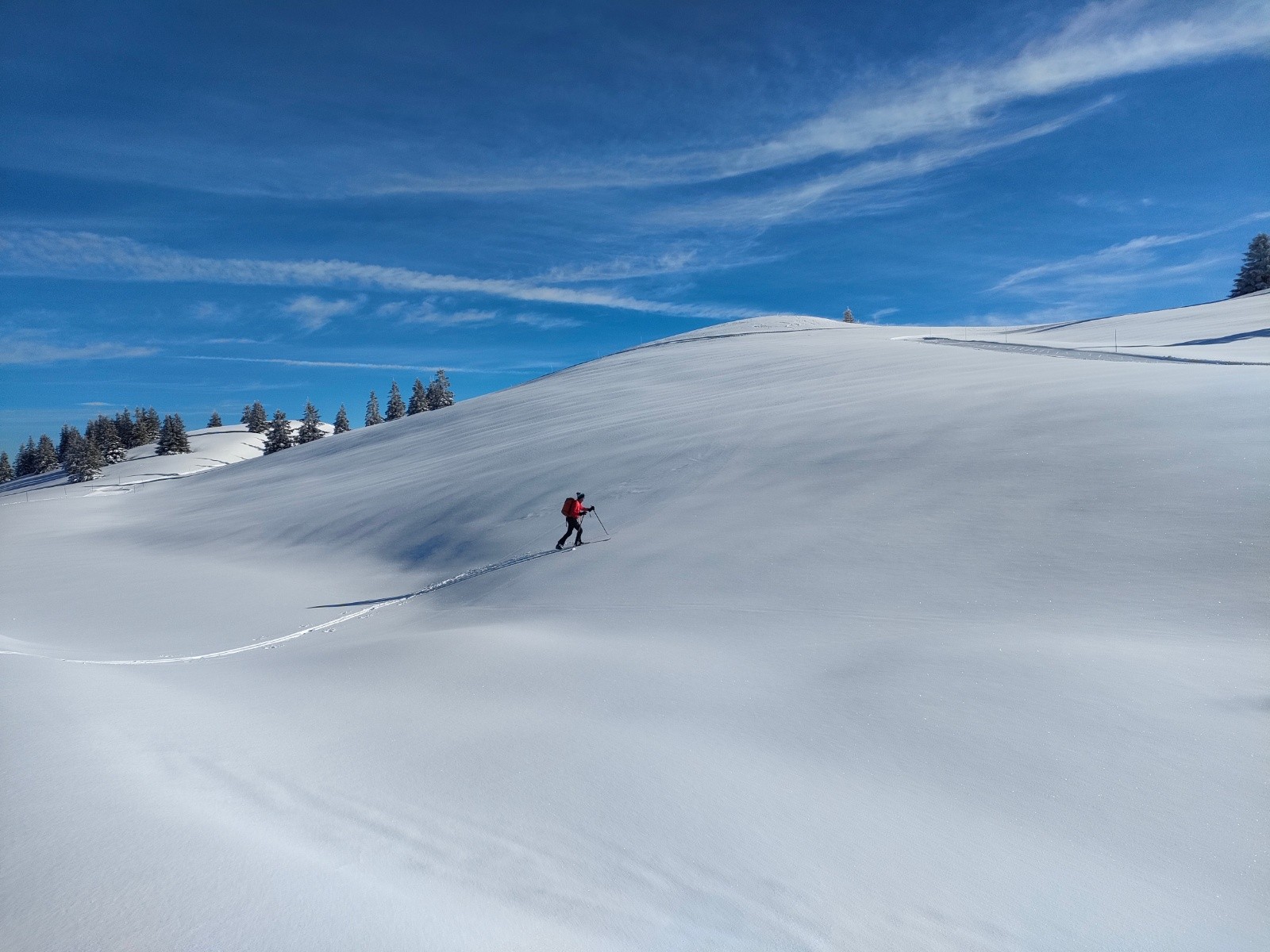 Quel bonheur d'évoluer sur ces doux reliefs encore vierges de toute trace, on regretterait presque de ne pas s'être levés plus tôt afin d'avoir la joie de passer les premiers. Aussi une fois rendus à la croix virons nous prestement les peaux pour plonger avec délectation dans les pentes occidentales tout juste sorties de l'ombre glaciale. On s'en tape une bonne tranche dans une neige sublime jusqu'à disparaitre dans la forêt beaucoup plus bas. Inassouvis, nous recollons les peaux sur les semelles froides comme la glace pour retourner là-haut. Le début est un peu difficile, la trace à faire dans la poudreuse réclame une énergie considérable mais finalement ce bonheur de la glisse n'est pas cher payé.