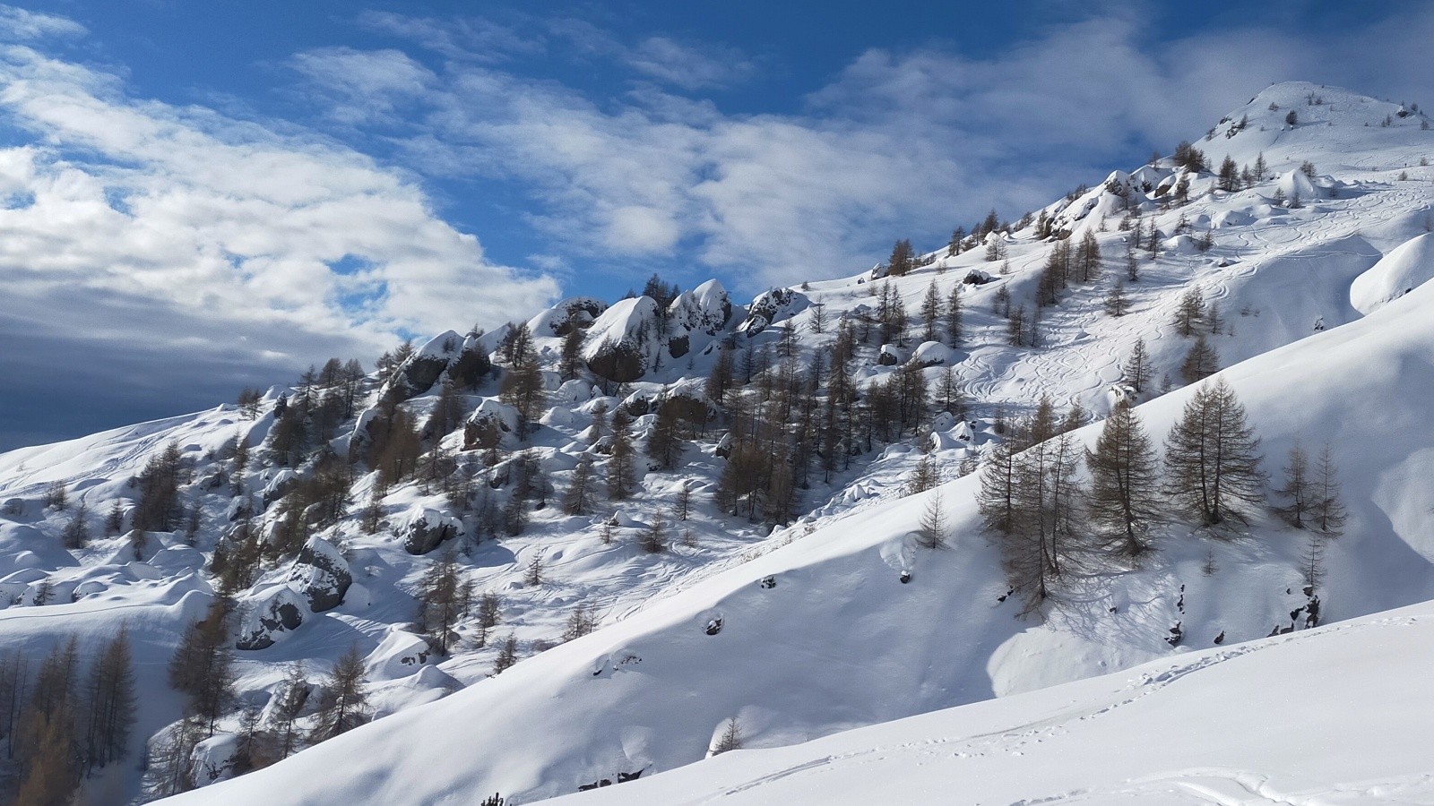 Conditions pour le ski : Bon enneigement, peu de requins, la neige fraîche (peu en bas et 20/30cms en haut) s'est bien alourdie au soleil et sur tous les versants sous 2000m.