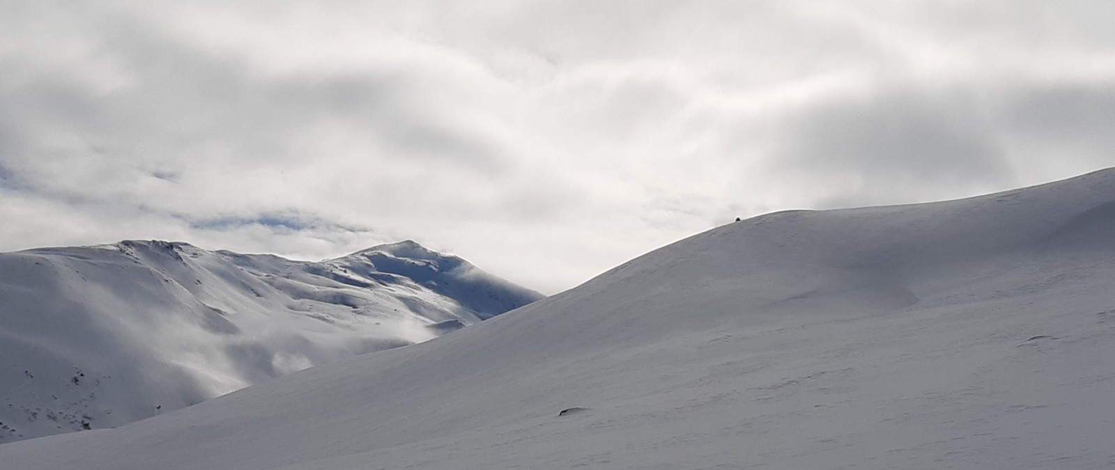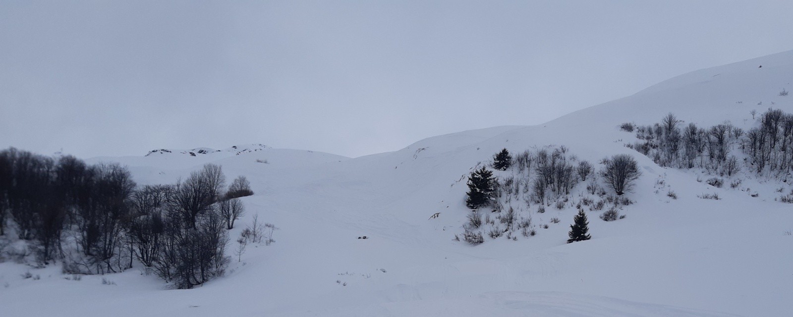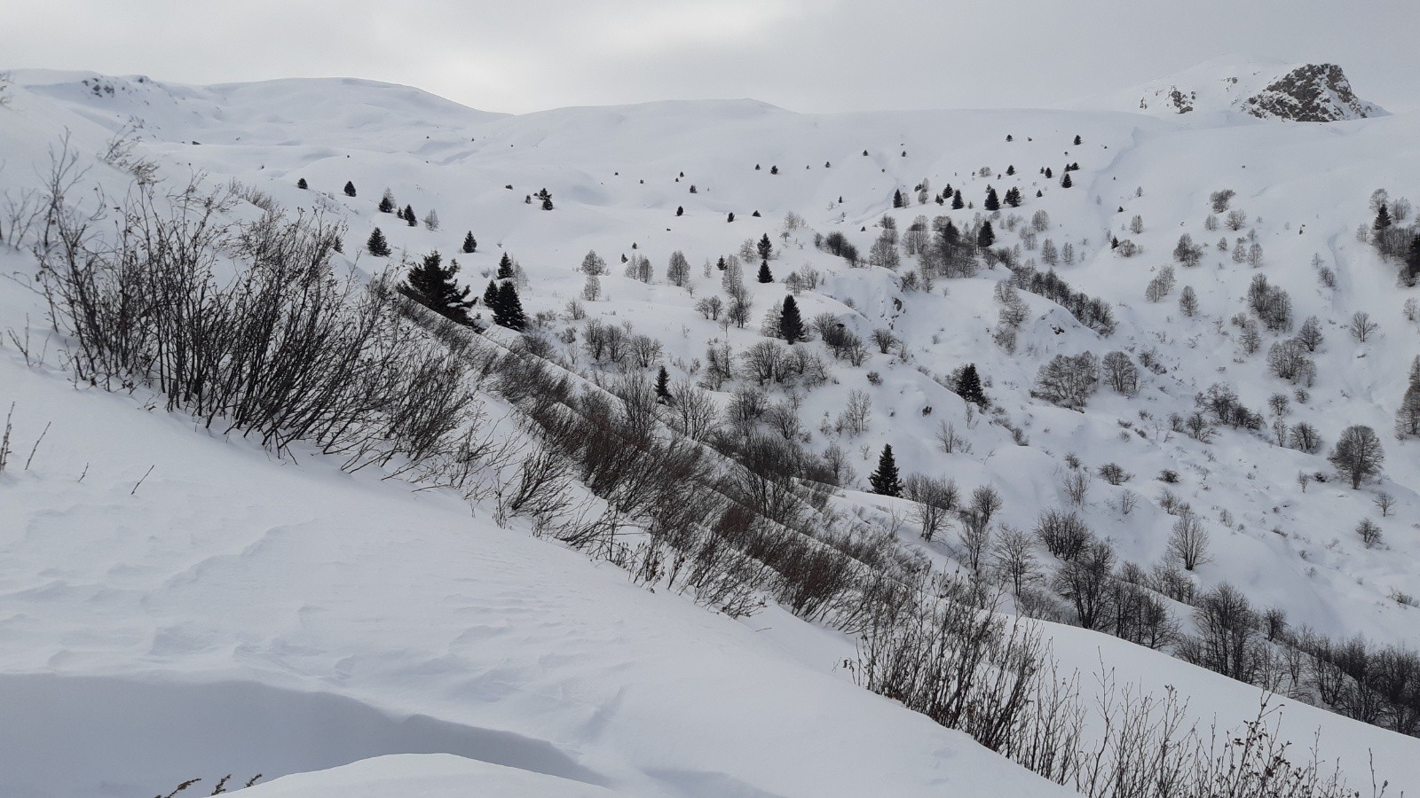 Conditions nivo et activité avalancheuse : de grosses accus sont en place même dans ce vallon peu pentu. Vu une fissure sur rupture de pente orientation NE.