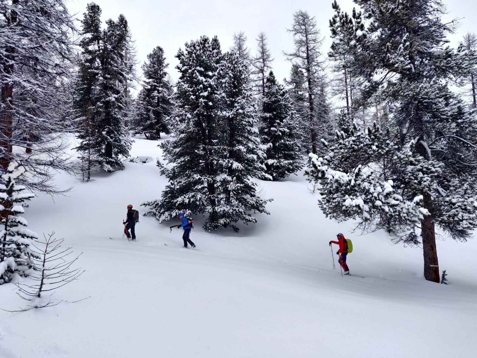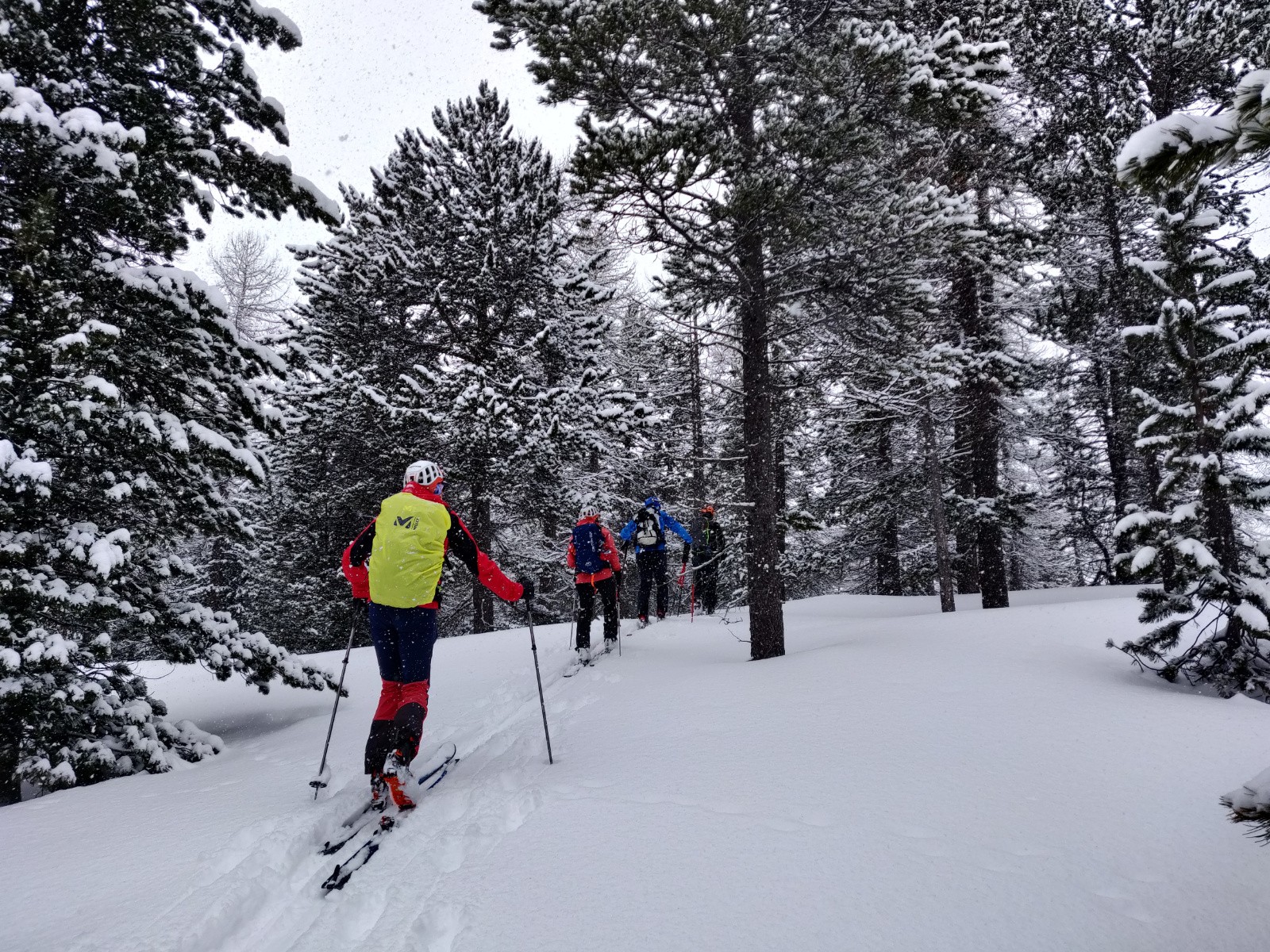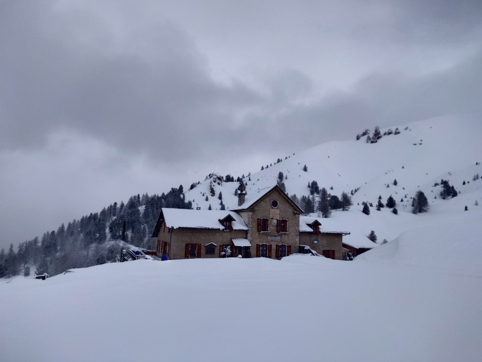 Météo/températures : -5 au départ, couvert, tombée de neige modérée. Le plafond nuageux annoncé à 2000m sera finalement un peu plus haut, courtes éclaircies en fin de journée.