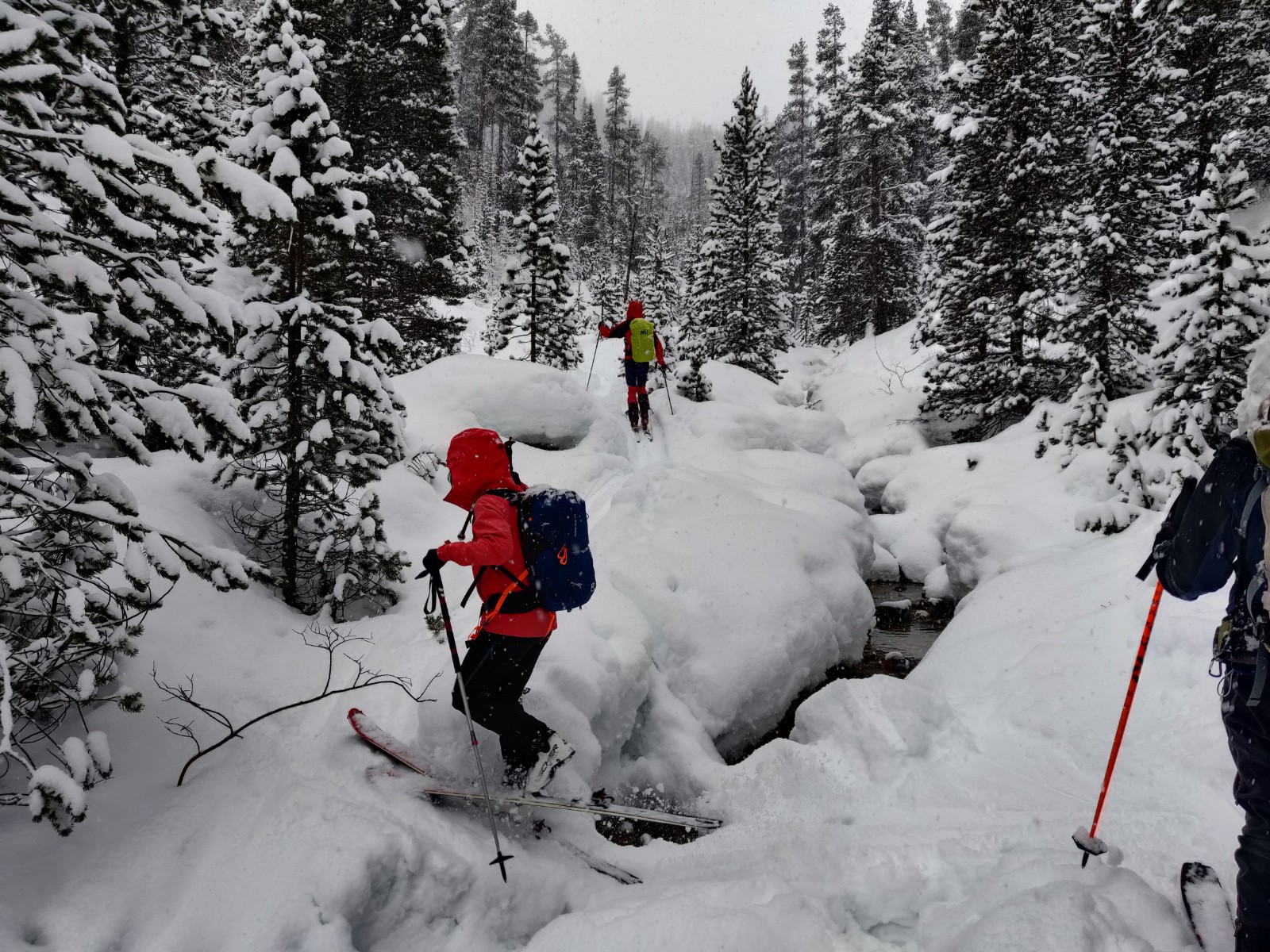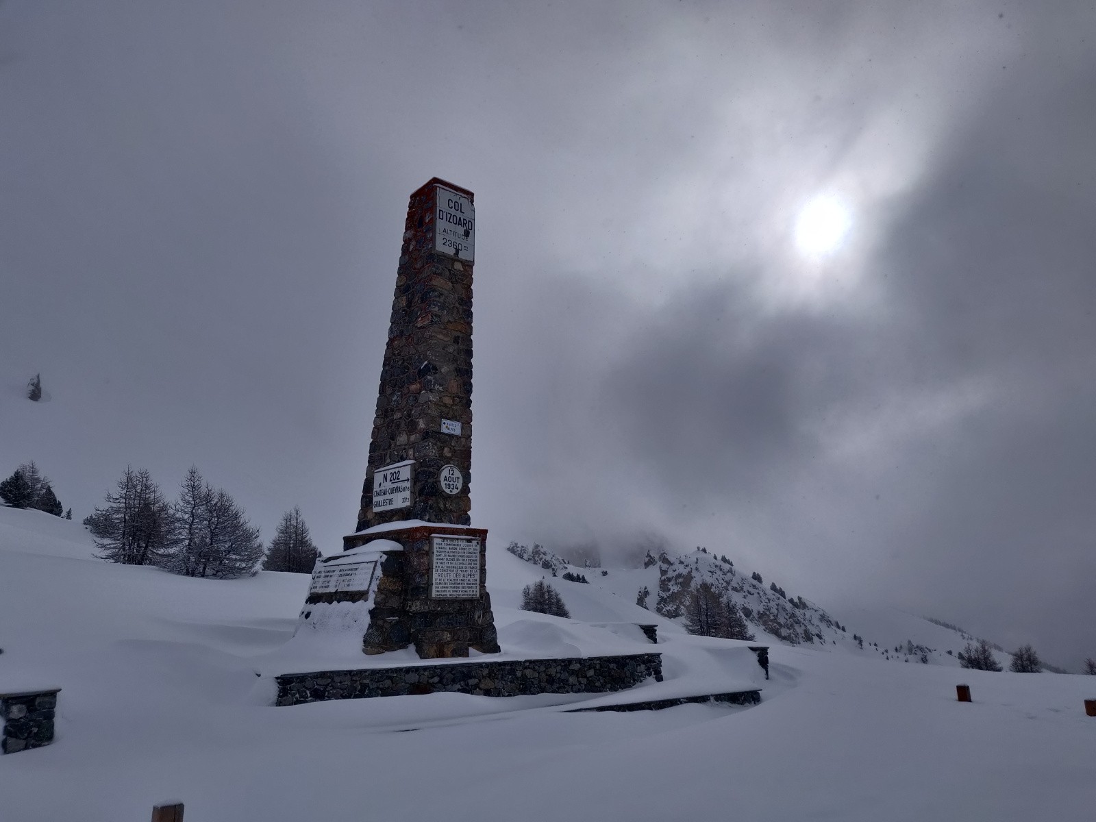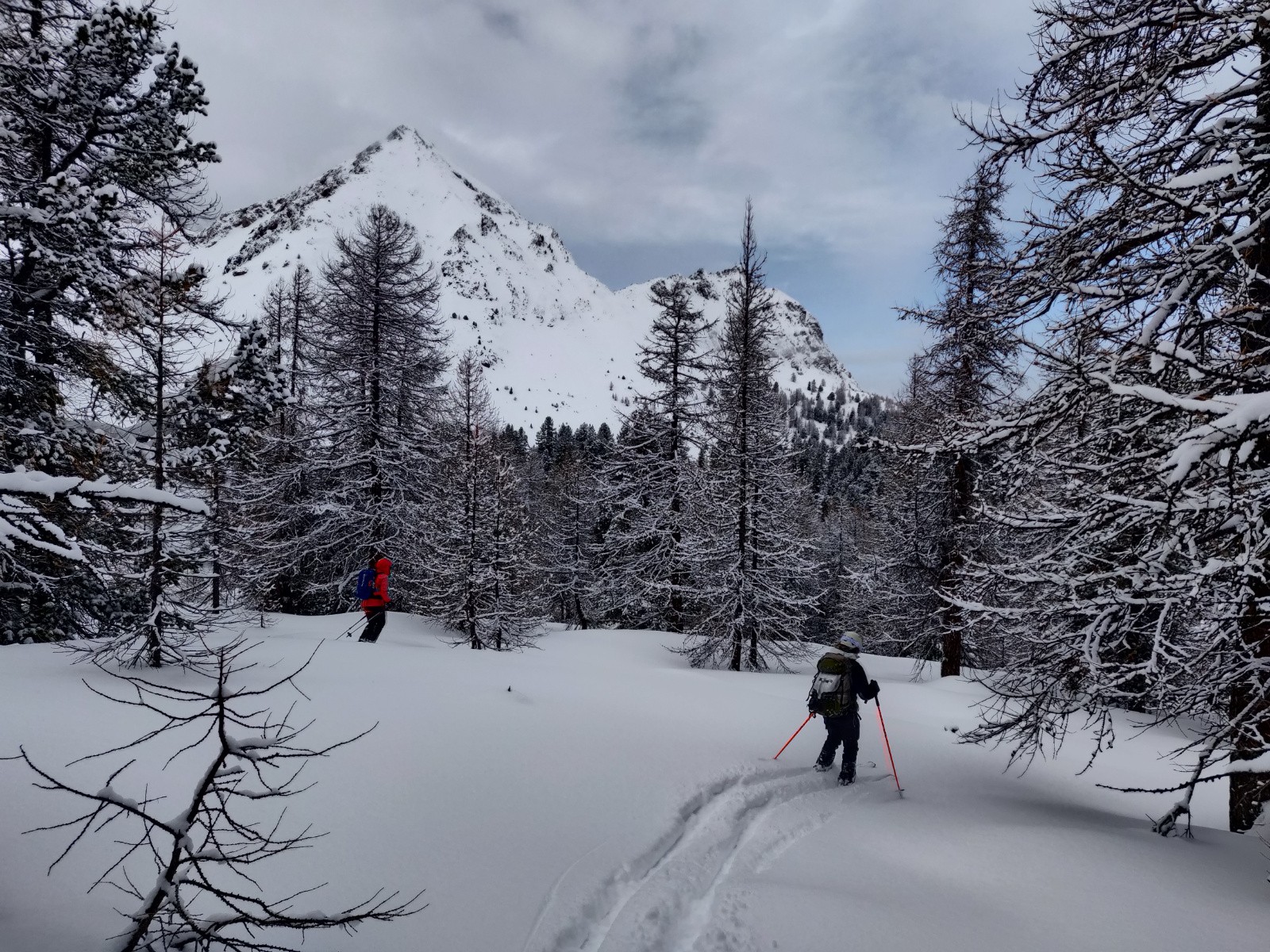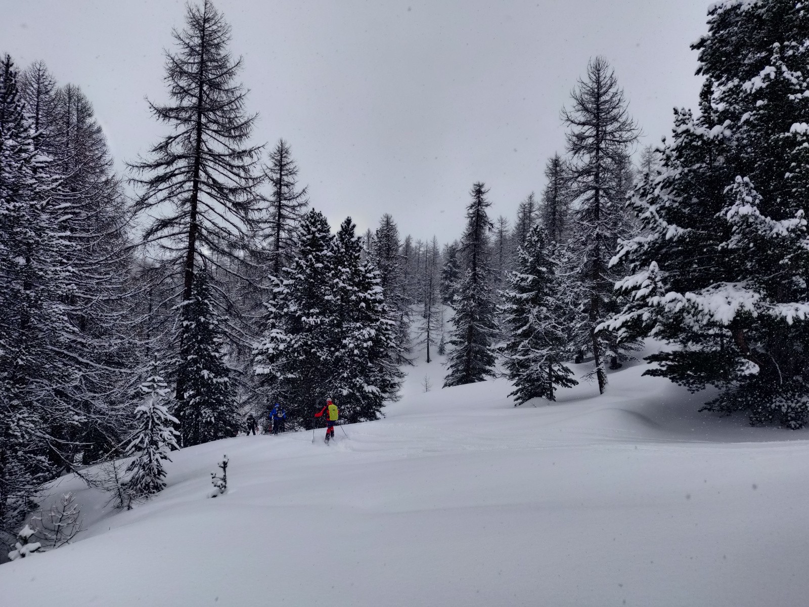 Itinéraire suivi : Prévisions météo assez mauvaises pour la journée (nuages et neige), nous partons tricoter autour du col de l'Izoard. Montée bucolique le long de la rivière jusqu'au refuge Napoléon et col de l'Izoard. Très mauvaise visibilité comme prévu. Nous descendons en suivant la route dans une bonne neige juste tombée. Repeautage vers 2150m pour remonter en direction du col des Ourdeis. Arrivés sur le plateau du champ de tir, les cols autour sont bouchés, nous décidons de profiter de la bonne neige en redescendant à la route par la foret. Seconde montée cette fois jusqu'en haut du bois de la Ravée 2330m. La descente qui suit est tellement incroyable qu'on se croirait au Canada. Neige légère, fond dur parfait, slalom entre les sapins enneigés. Le tout couronné par quelques éclaircies. Évidemment on en refait une, puis retour au Laus, trempés, mais heureux !