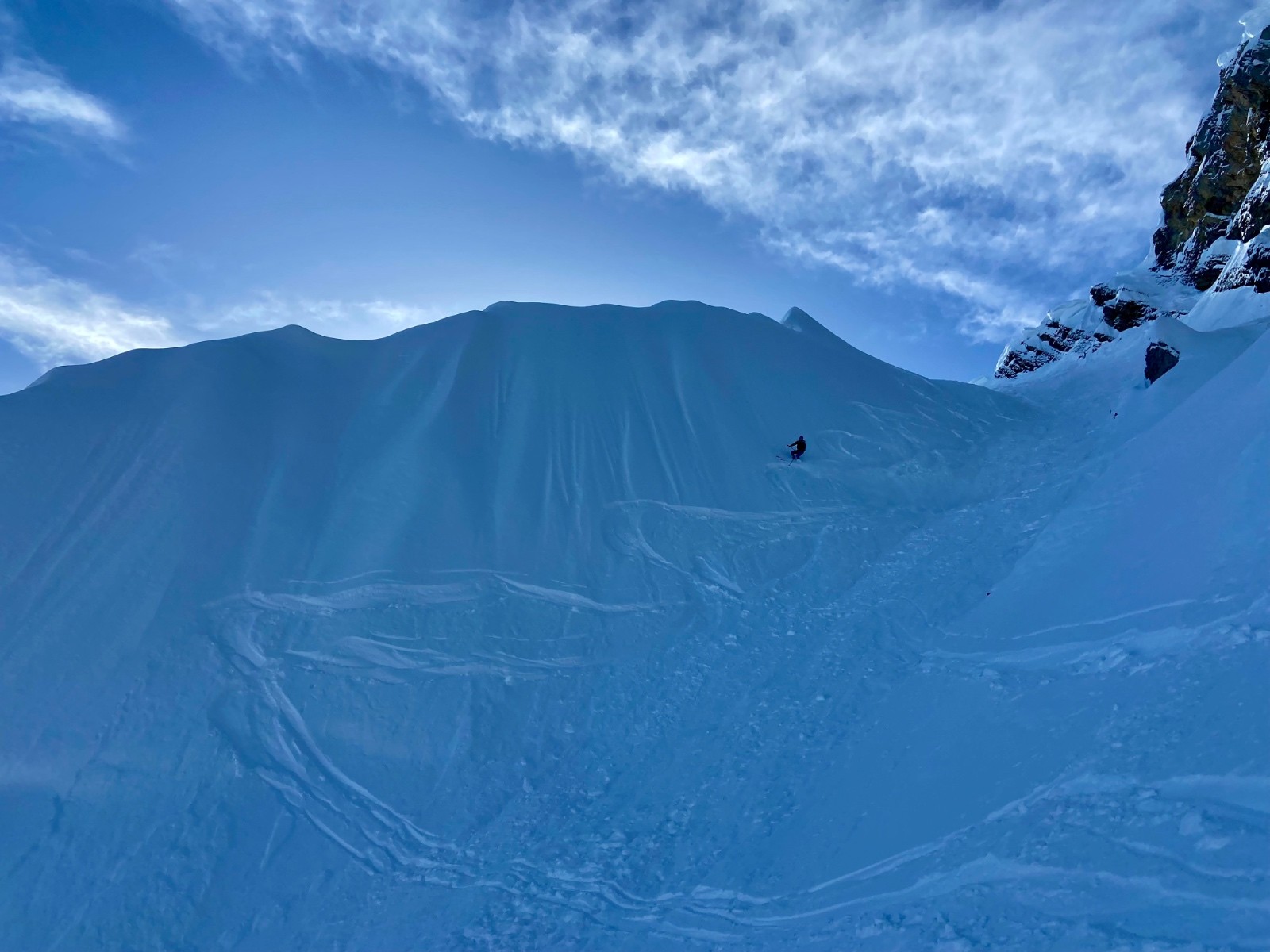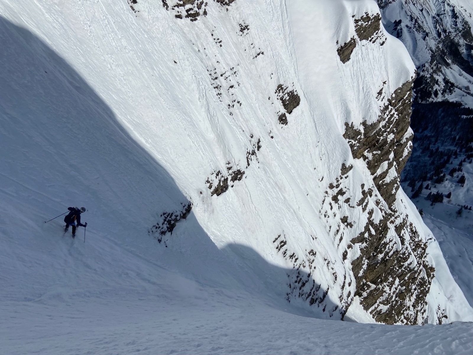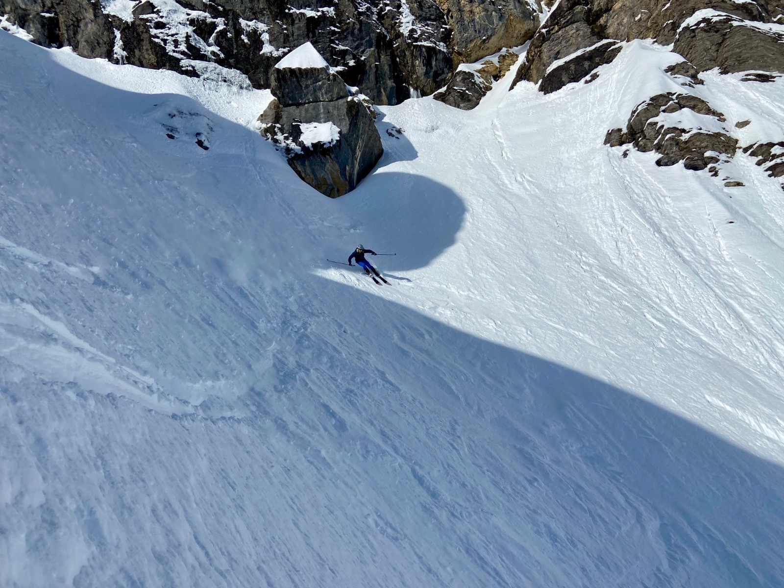 Le couloir du bas est en grosse poudre en rive droite, et en neige dure à 10h40 dans la partie qui tourne à l’Est.