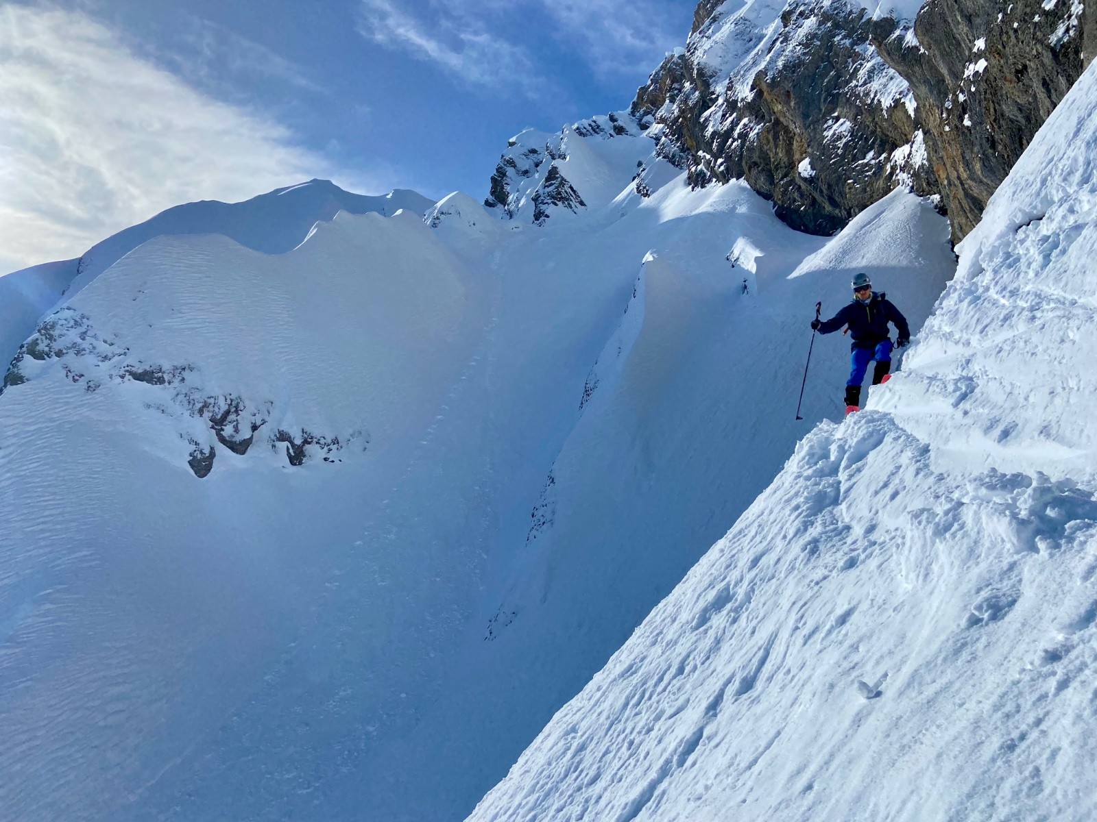 La traversée dans la Blonnière est ultra efficace et on est vite à la corniche, aménagée par deux skieurs venus plus tôt en aller-retour.