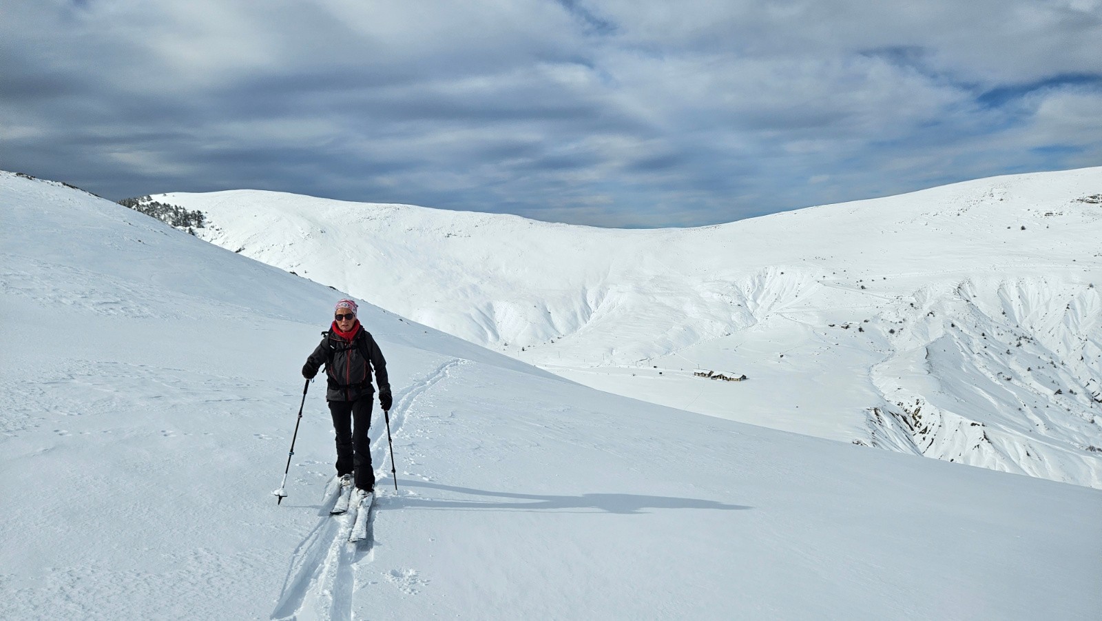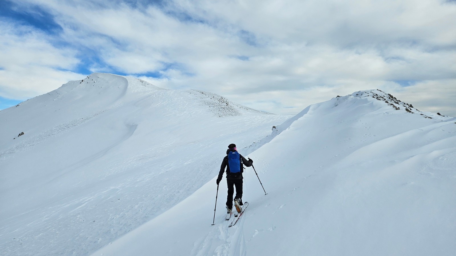 Montée au sommet où on ne s'éternisera pas à cause du vent, puis redescente à ski par la crête, puis par les vallons de montée sur une neige skiable mais un peu croutée et avec une visi pas top.
