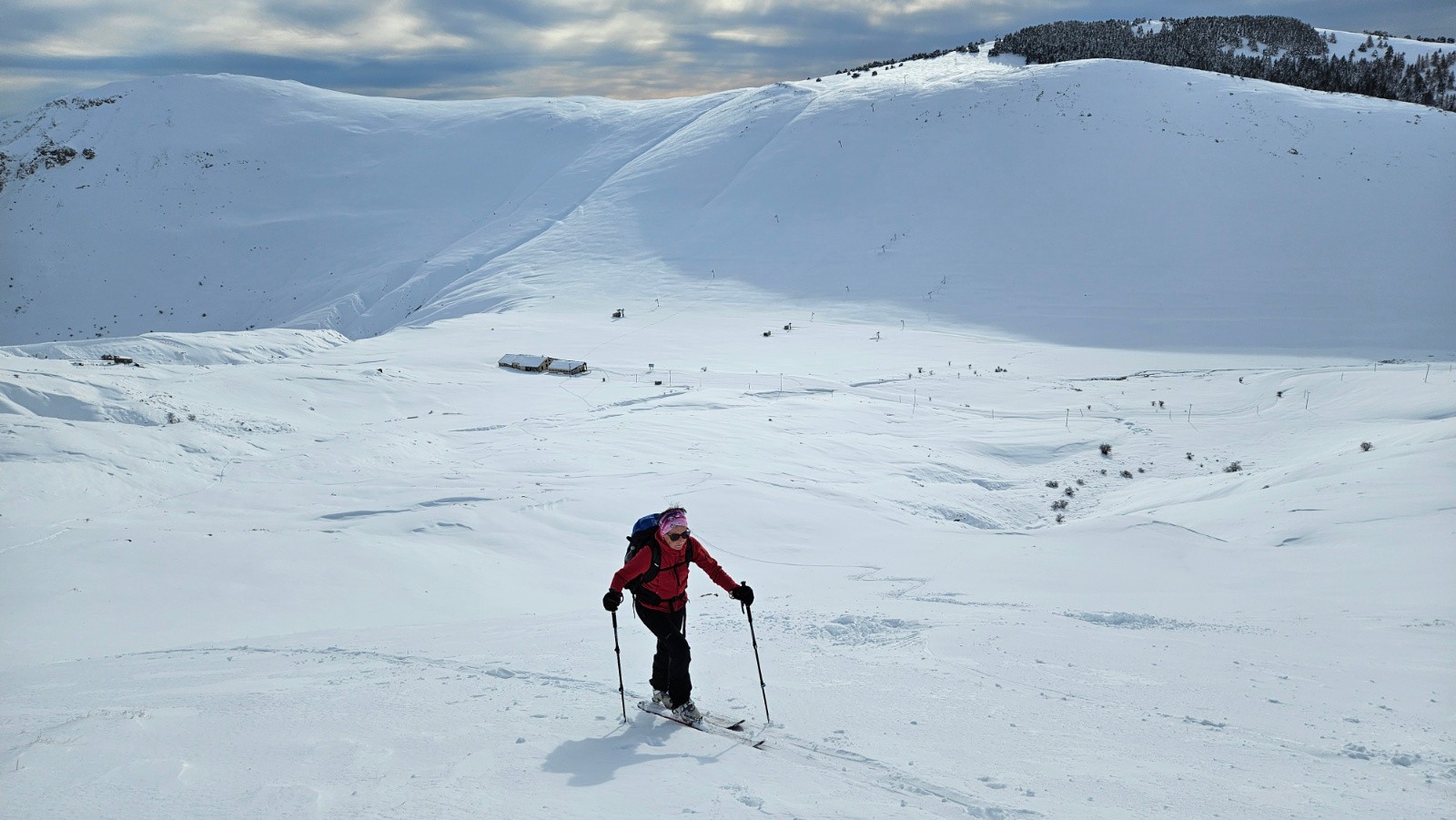 Casse-croûte au soleil contre un bâtiment de la station, puis on remonte en face pour rejoindre la crête du Picogou sur une bonne neige froide.