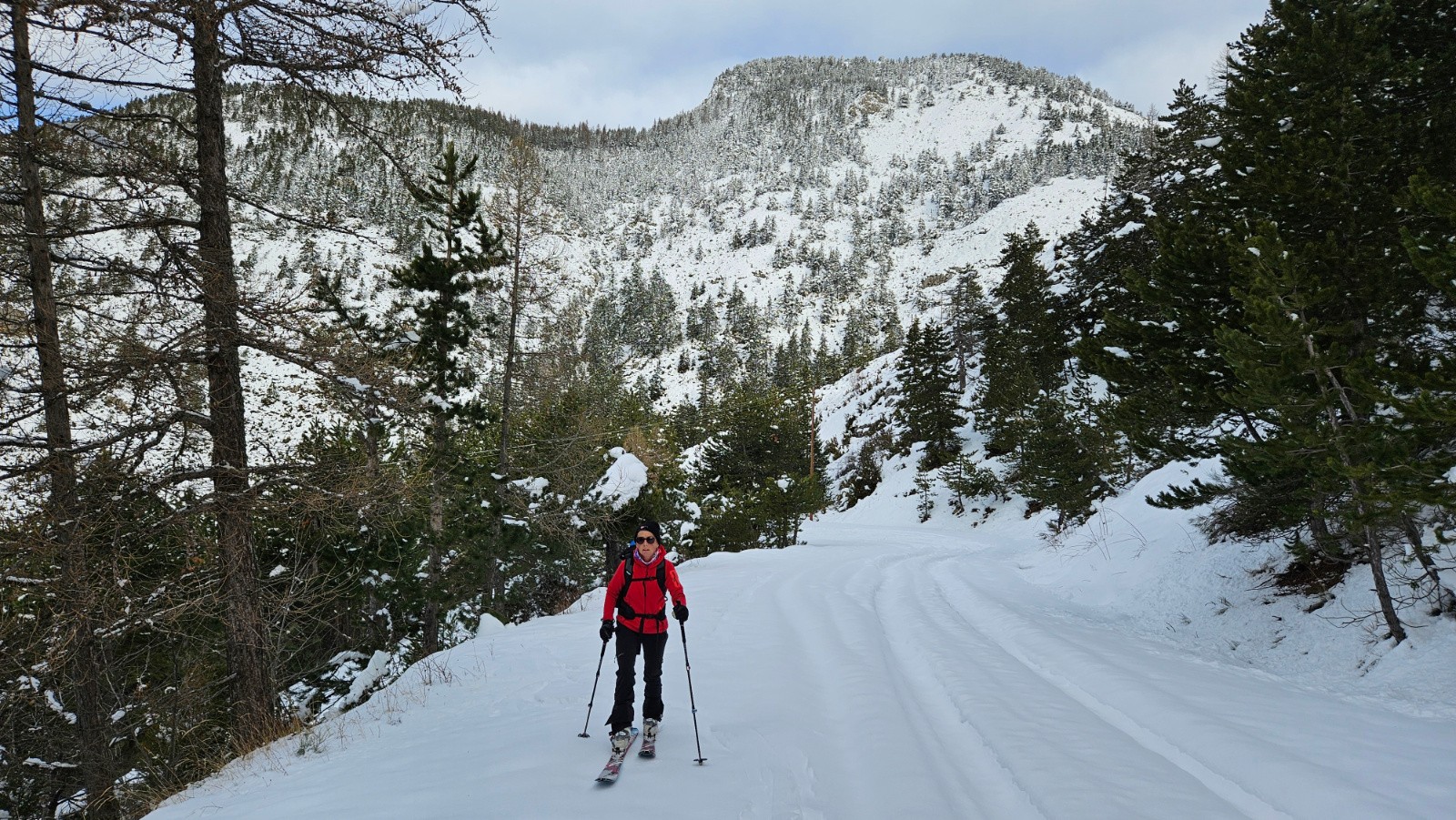 Redescente à ski sur une neige légèrement croutée mais bien skiable jusqu'à la station, puis descente à ski par la route jusqu'à la voiture