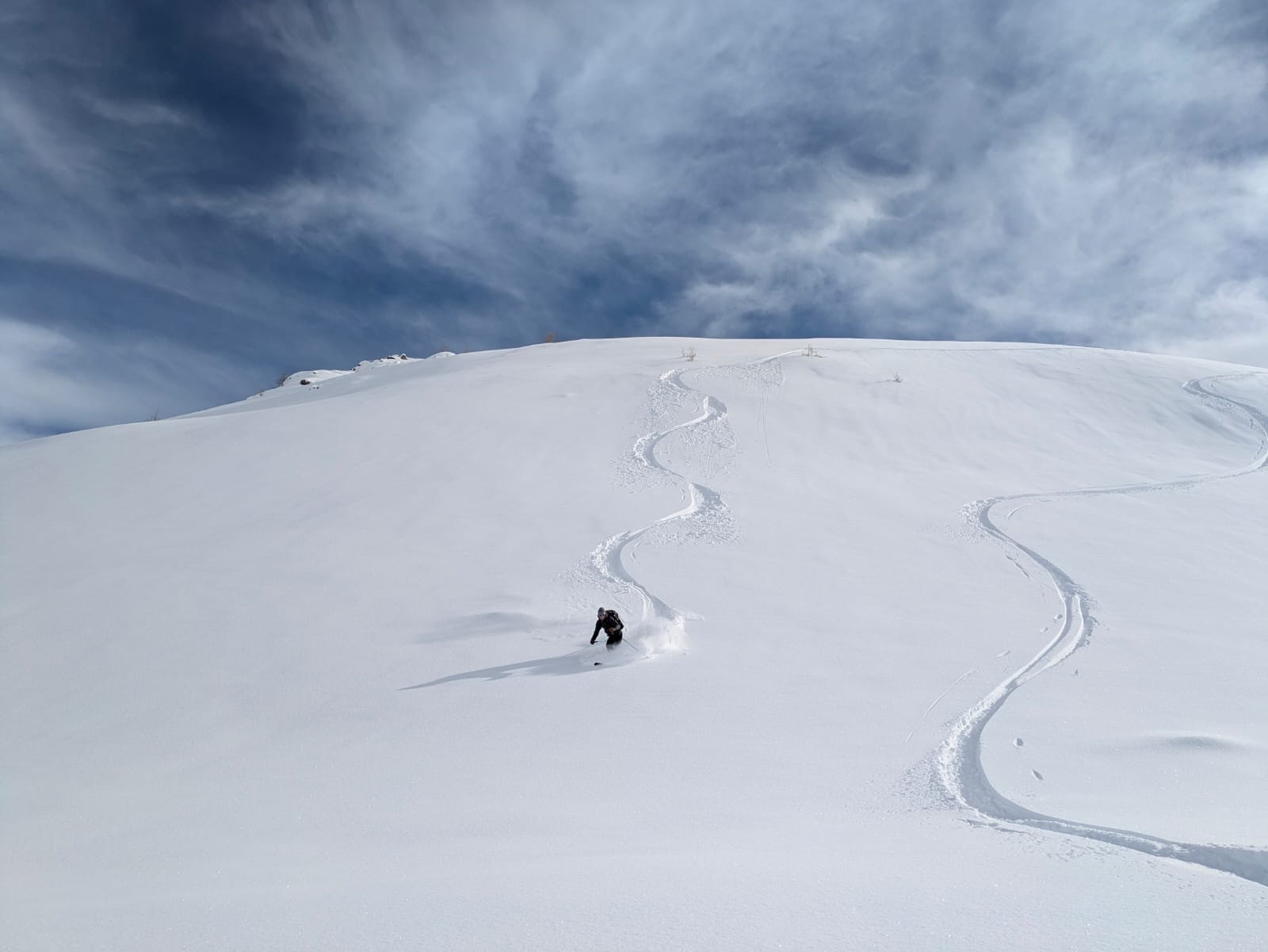 Conditions pour le ski : Bonnes, poudre (lourde) en E et N, croutée sur le bas, soufflée au col de Crous