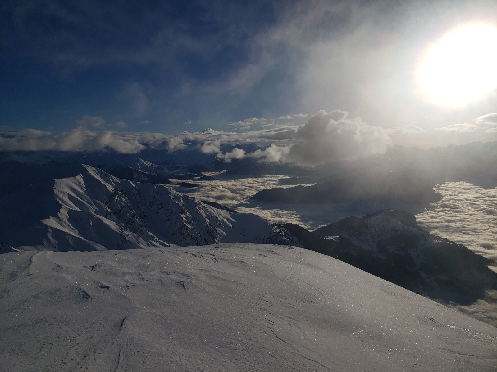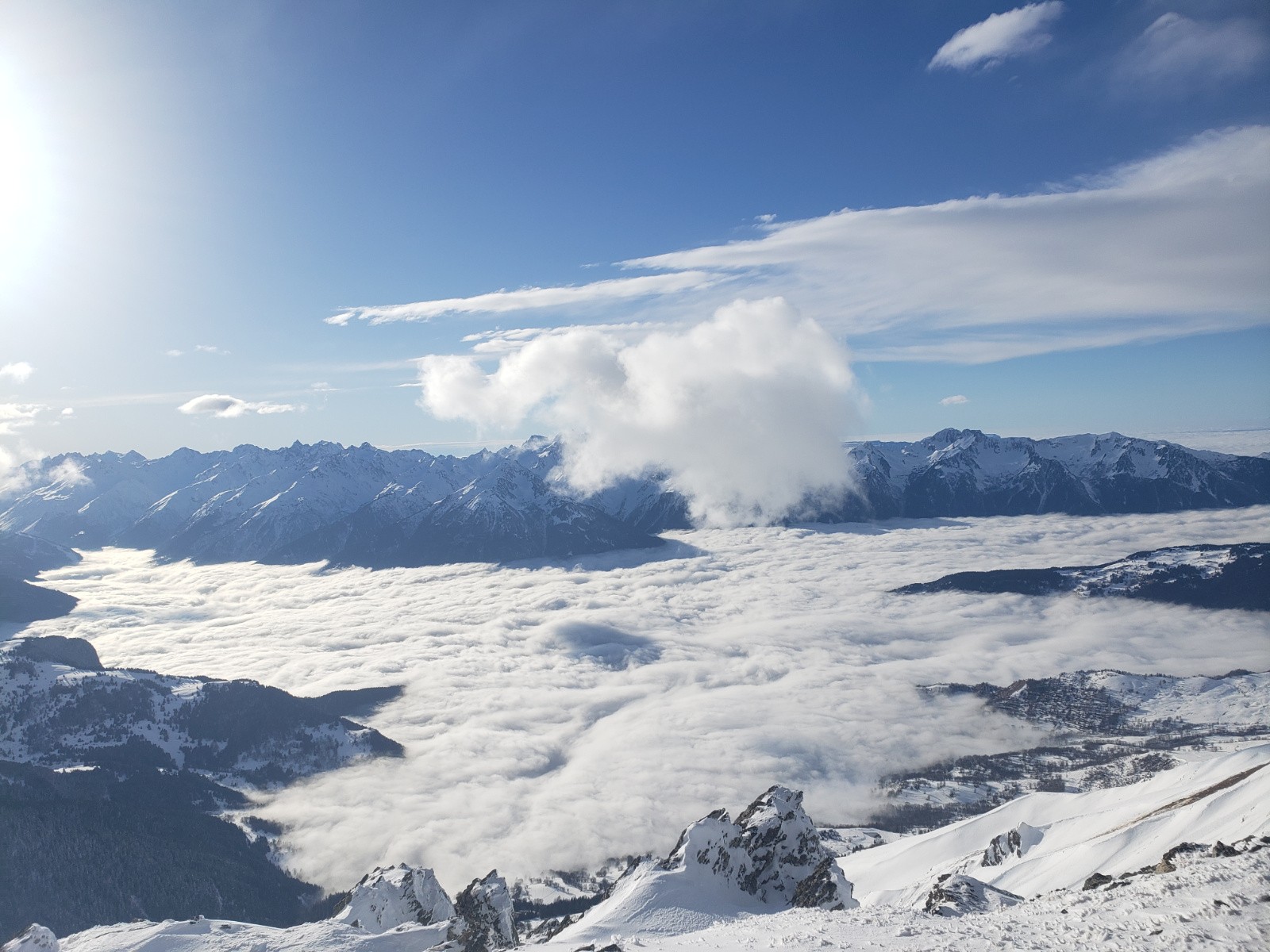 Belle ambiance au sommet ! Lumières de fin de journées, quelques nuages vers les sommets et une mer de nuages dans la vallée !