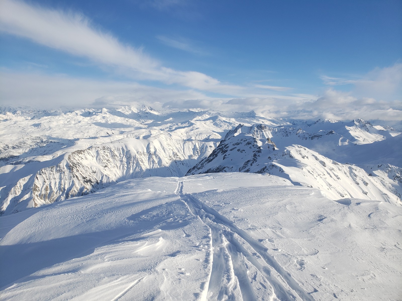 Nous sommes rentrés dans la face par une épaule OSO bien visible sur la carte. Nous avons vu notamment un couloir plus direct depuis le sommet, plus raide, mais qui ne passait pas à ski (ou mal).