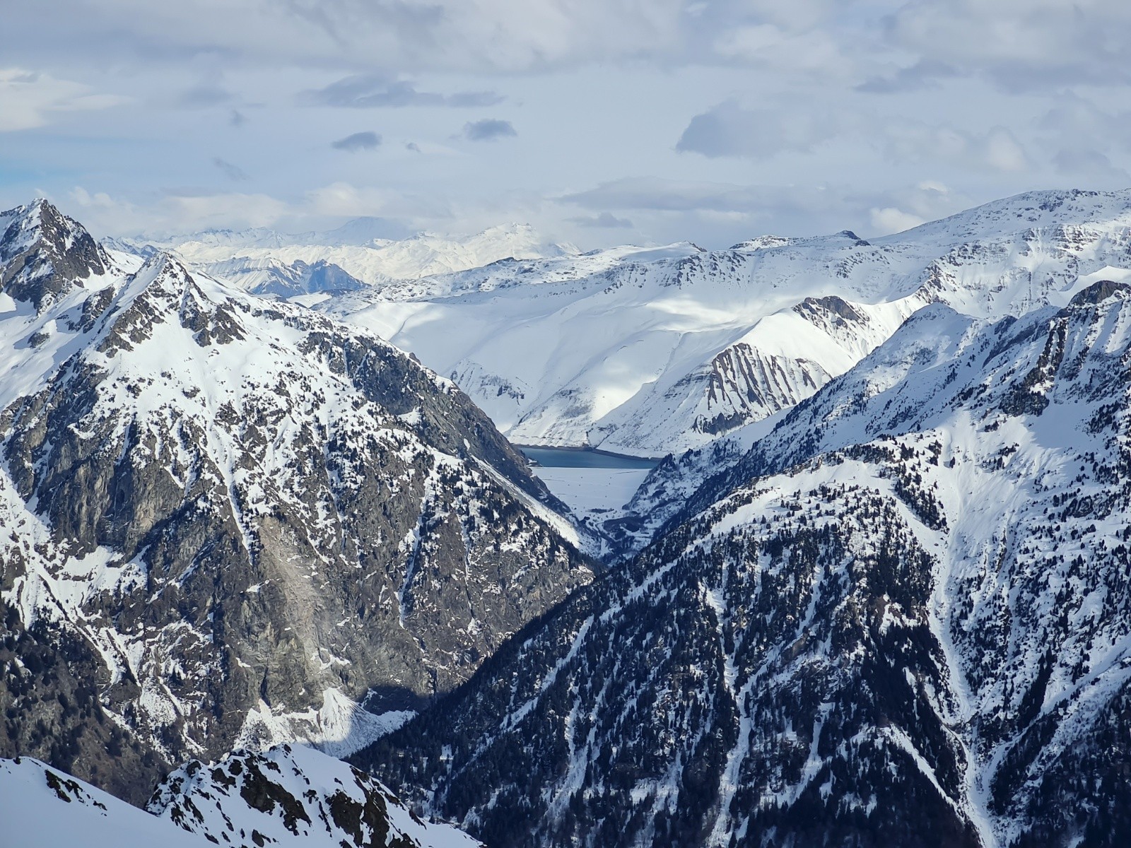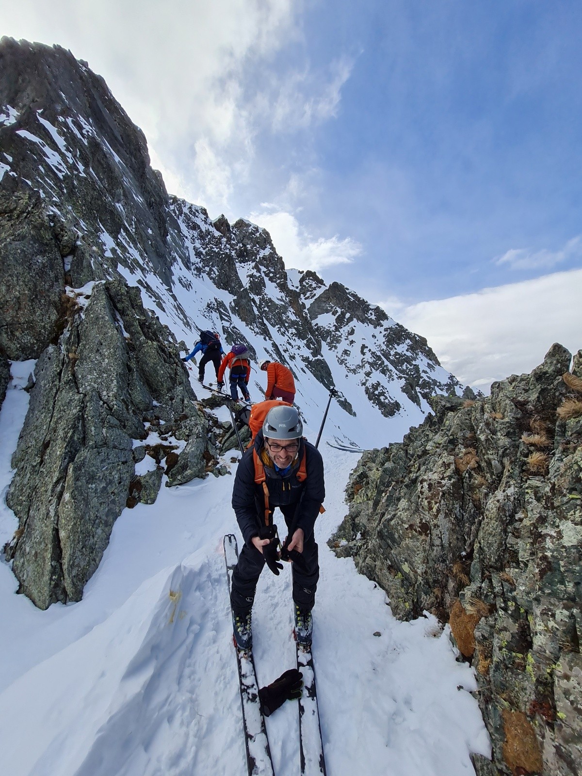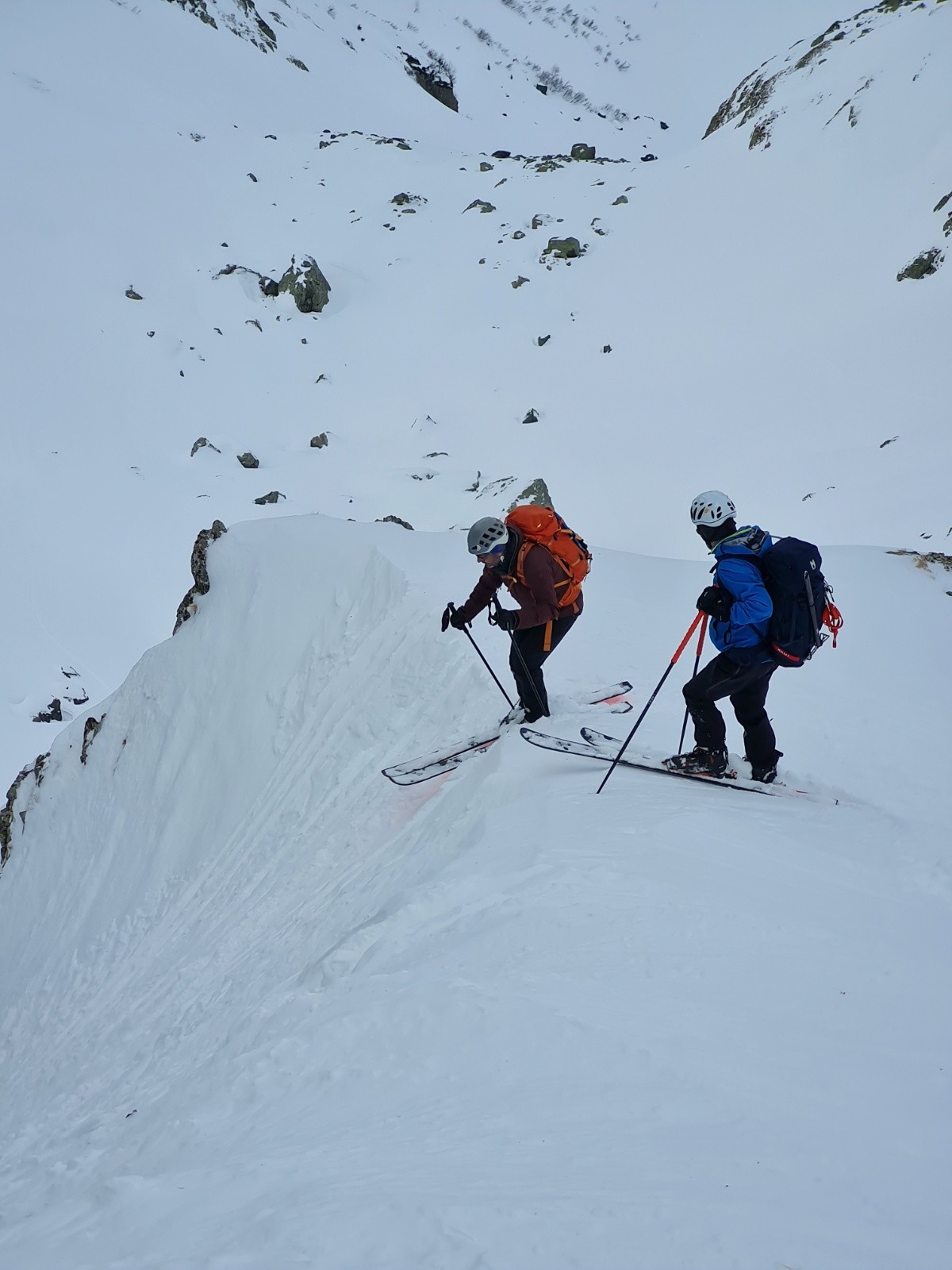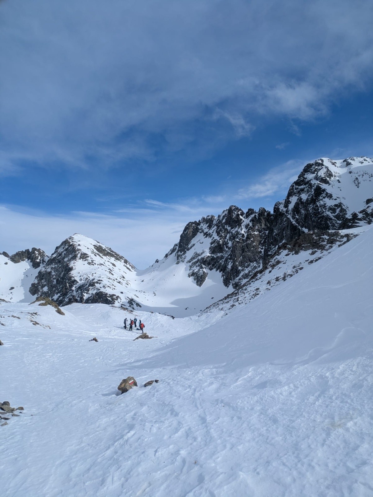 JF est à la traîne, il n'a pas assez picolé les jours précédents et se trouve sans jus dans les multiples conversions. Il lâche l'affaire au-dessus du lac et retourne à son déversoir pour nous y attendre. On croise des connaissances qui font le tour du proprio à bon rythme. La trace est globalement bonne voire excellente, mieux que dans la partie basse. On a délaissé le Grand Replomb dont l'accès et la qualité de neige ne nous inspirait que moyennement. Au col de la Mine de Fer, idem, le pseudo-projet d'aller faire le Rocher de l'Homme tombe à l'eau car l'accès semble vraiment béton pour y aller. On file donc au col de la Pierre, jamais fait. C'est une belle combe qui se remonte avec une très belle trace efficace. Au sommet, la vue vers l'Eau d'Olle est sympa. Etienne fait gaffe avec ses leashs pour ne pas envoyer les spatules en mode (trop) autonome. Les crampons resteront en fond de sac. On descend.