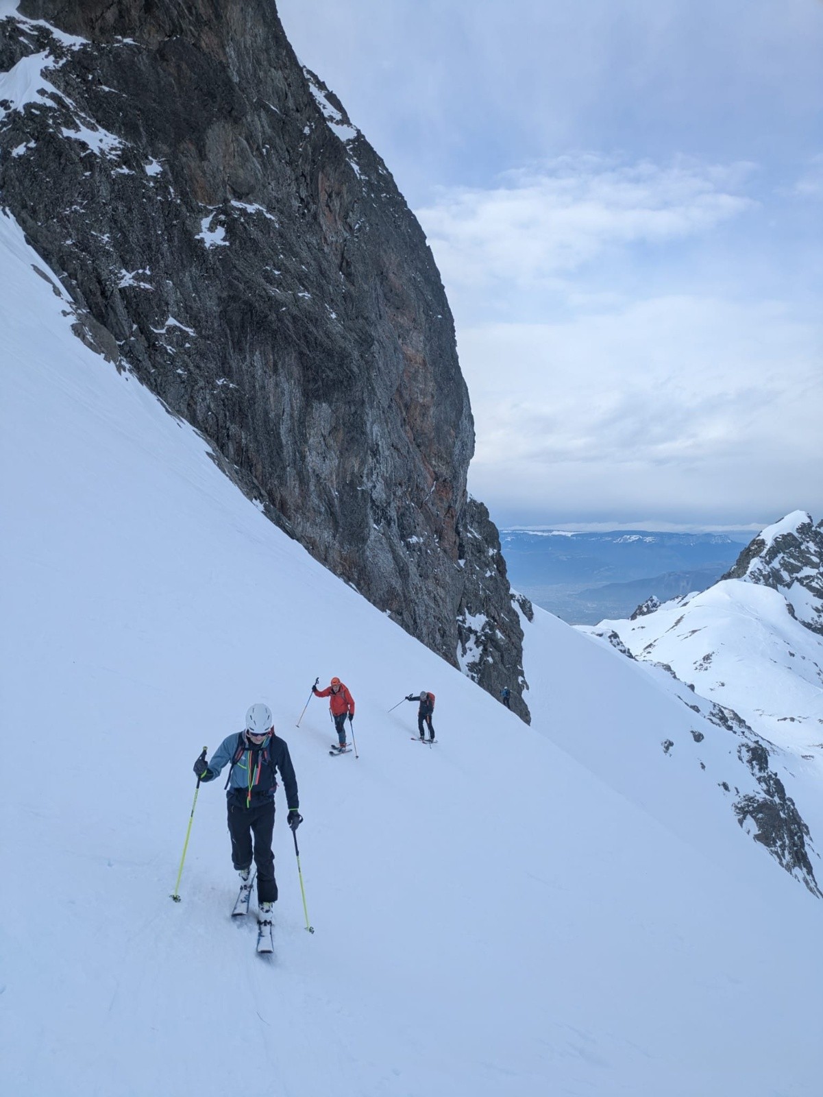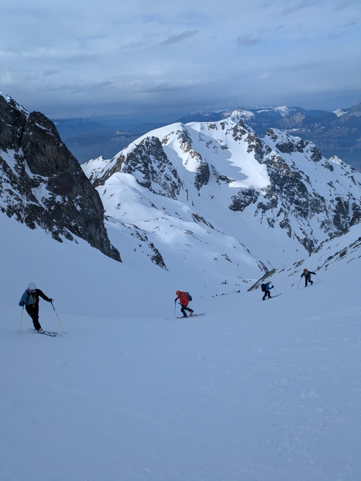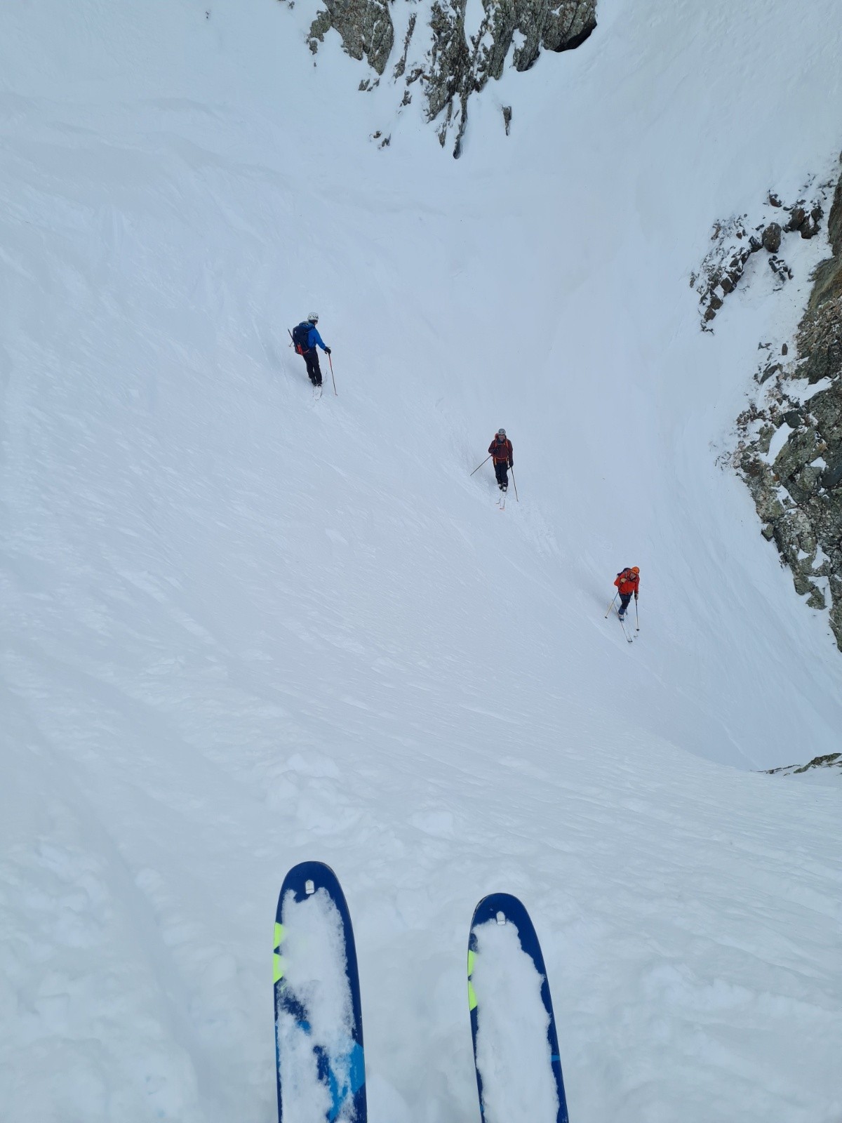 En chemin, nous passons par un des couloirs, une étroiture dans le verrou qui passe très bien, en bonne neige rassurante malgré un peu d'effet jour blanc. On se laisse ensuite glisser pour rejoindre JF. Encore des options de descente, on choisit de traverser pour gagner un autre couloir en terrain bien aventureux, se faufilant dans les arcosses. Chacun y va de son style, Marco en éclaireur avisé, derrière on fait au mieux et Michel puis Didier, en confiance, loupent quelques appuis et tentent un strike. Belles glissades sans gravité, et bons stops du gardien de but. La suite s'enchaîne dans la forêt puis le border agréable. C'est le genre de terrain qui fait progresser.