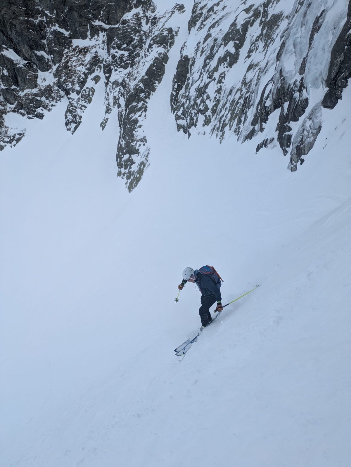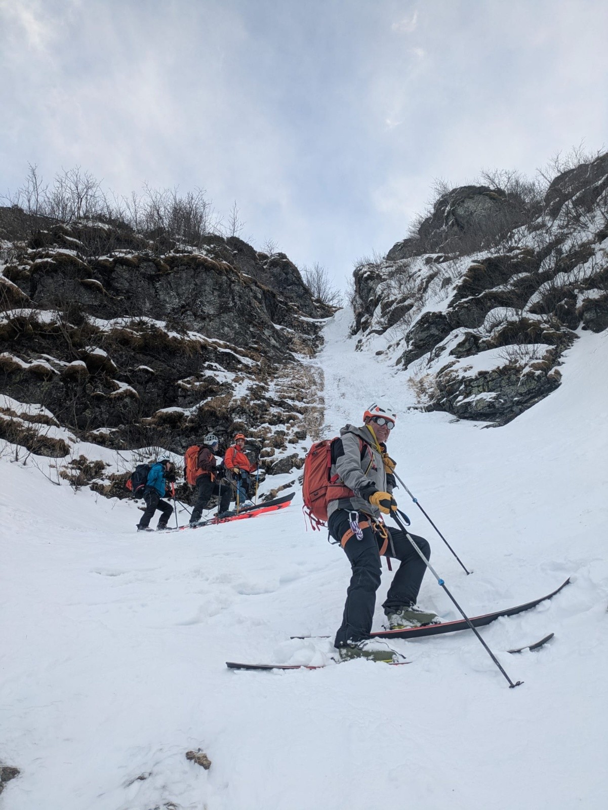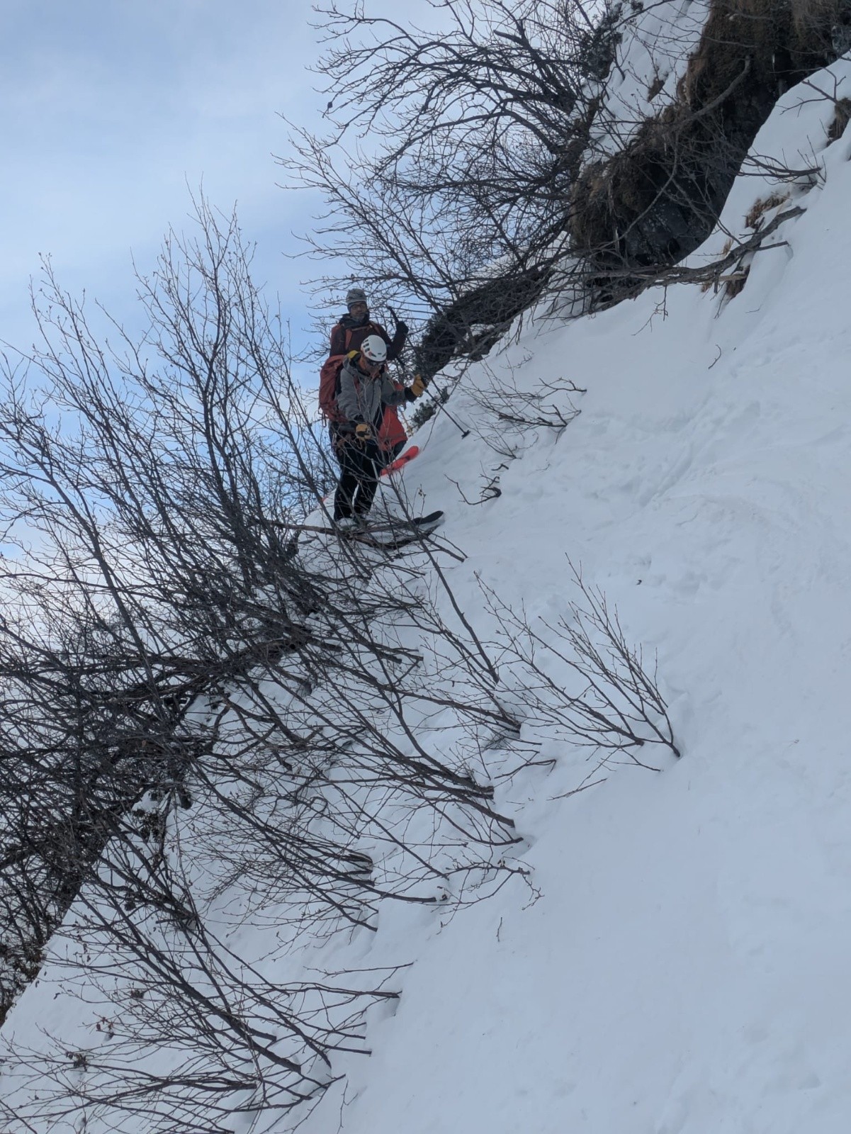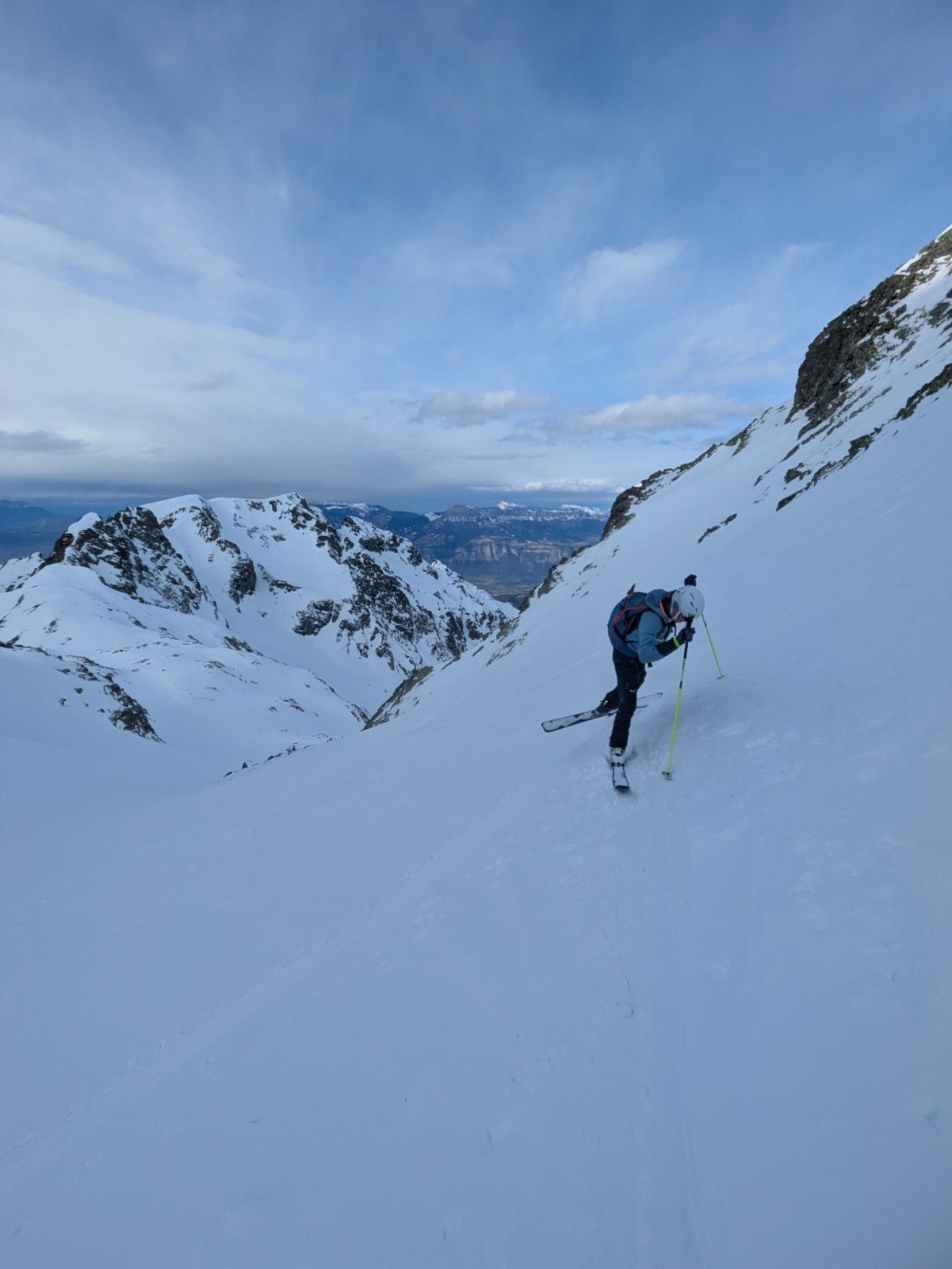 En chemin, nous passons par un des couloirs, une étroiture dans le verrou qui passe très bien, en bonne neige rassurante malgré un peu d'effet jour blanc. On se laisse ensuite glisser pour rejoindre JF. Encore des options de descente, on choisit de traverser pour gagner un autre couloir en terrain bien aventureux, se faufilant dans les arcosses. Chacun y va de son style, Marco en éclaireur avisé, derrière on fait au mieux et Michel puis Didier, en confiance, loupent quelques appuis et tentent un strike. Belles glissades sans gravité, et bons stops du gardien de but. La suite s'enchaîne dans la forêt puis le border agréable. C'est le genre de terrain qui fait progresser.