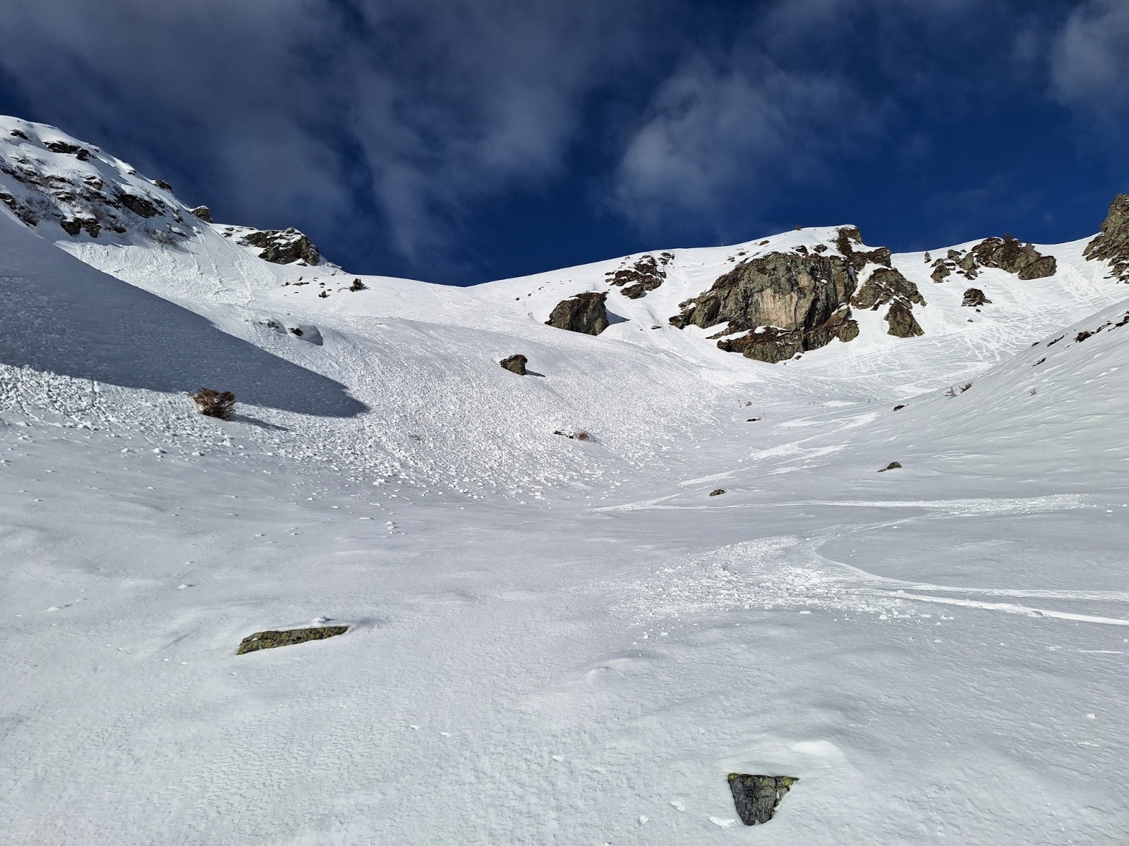 Dans le raide la couche récente glisse sur le fond dure. Je n'ai pas pu sortir à skis le couloir Est dans du 35°.