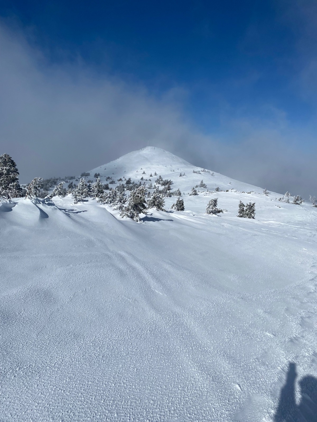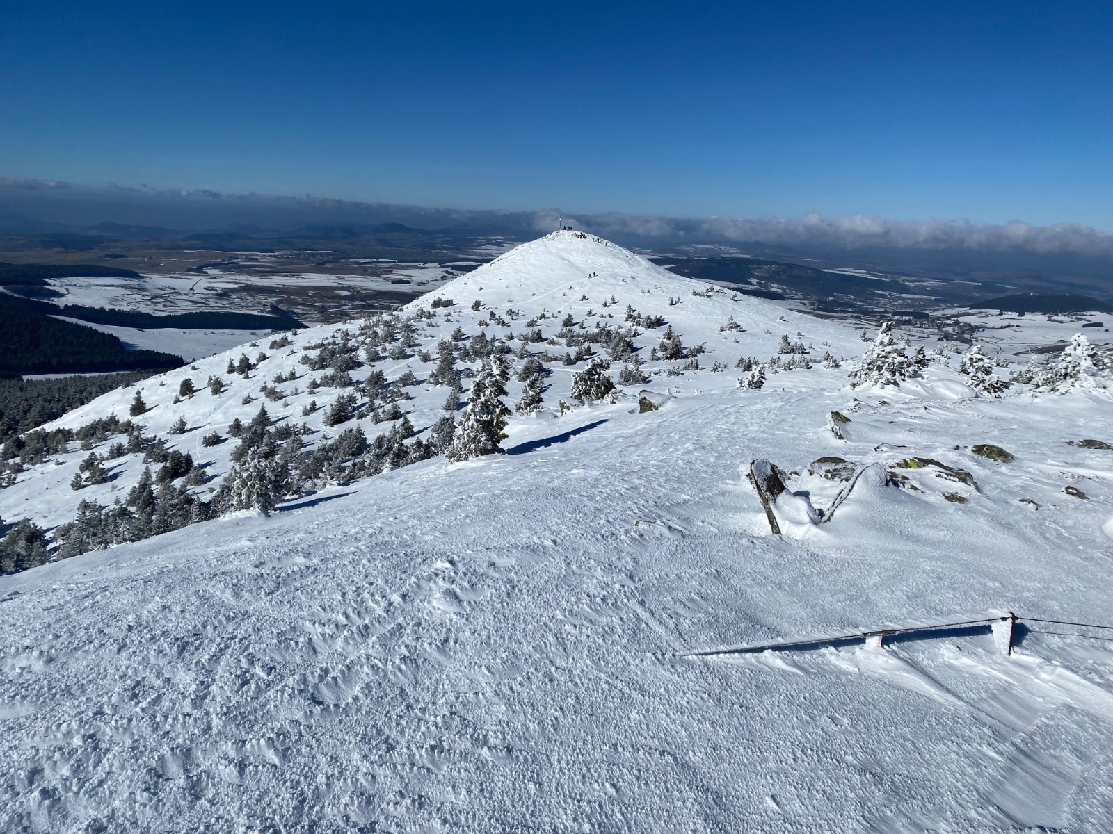 Jâattaque la montĂ©e en croisant les doigts pour que ça commence Ă sâouvrir⊠au cours de la montĂ©e, je fais plusieurs sondages, environ 30 cm dans la prairie quâil y a juste en dessous du MĂ©zenc, entre le parking et le sommet, un peu plus loin, au croisement de la source, environ 60 cm, arrivĂ©e en haut.. un vent Ă dĂ©corner les cocus! Ăa tombe bien, câest la Saint-Valentin! Mais Difficile de dire la hauteur de neige. Câest plaquĂ©, bien bĂ©ton, mais globalement il y a de quoi skier.