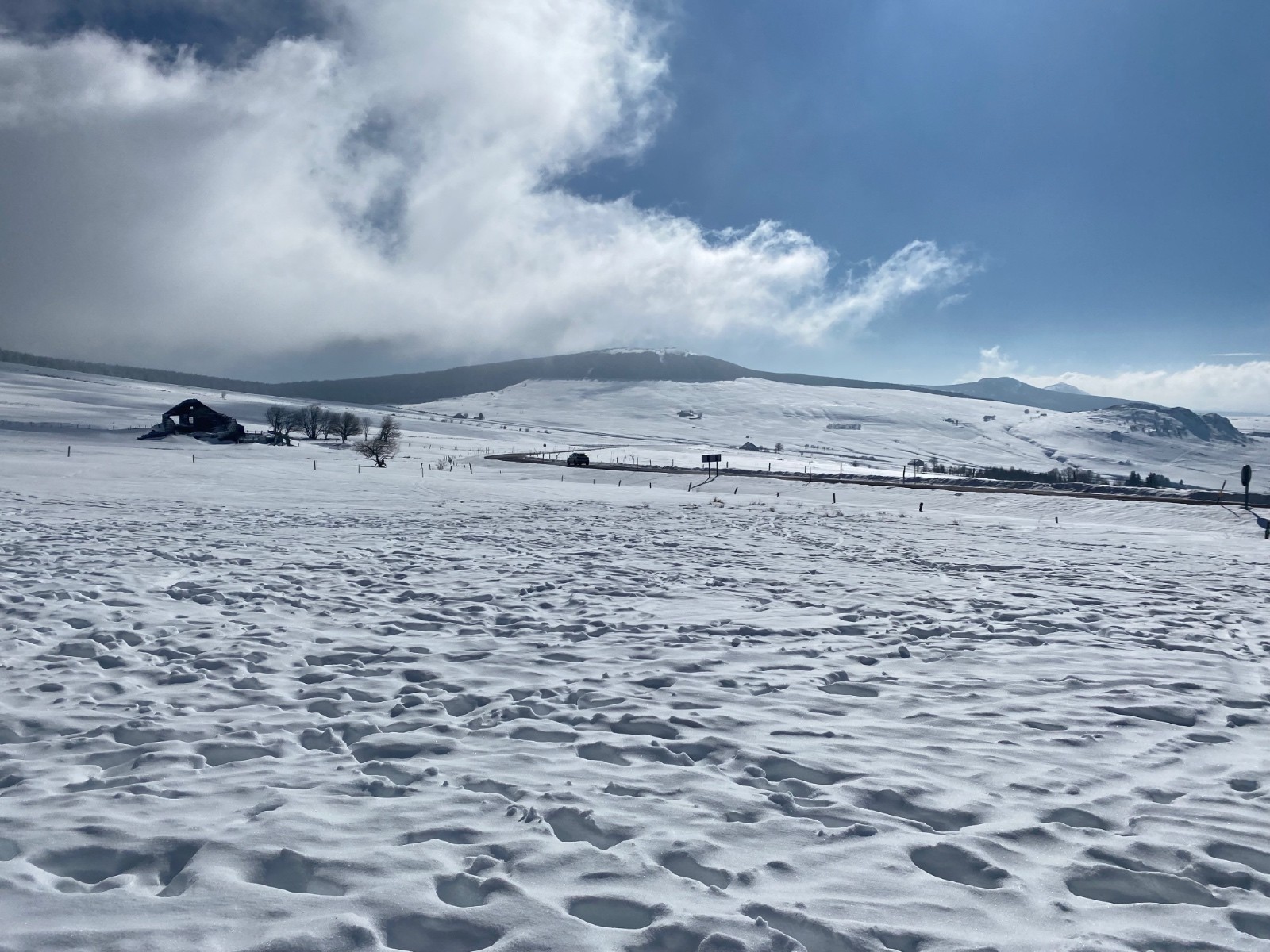 Je me dis que je devrais aller jeter un Ćil, peut-ĂȘtre que ça nâa pas tant fondu que ça⊠mais arrivĂ© au parking de la maison forestiĂšre, grosse dĂ©sillusion⊠Ăa a pris une sacrĂ©e claque ! Quand je pars, le Mezenc est encore bĂąchĂ©, dâaprĂšs meteoblue, ça devrait se dĂ©bĂącher vers les 14 heuresâŠ